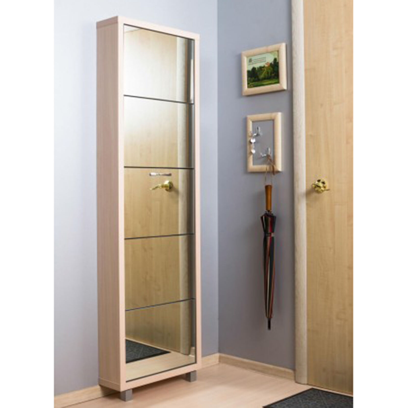Узкий обувной шкаф «Айрон-Люкс 5 молочный-зеркало» с пятью откидными секциями вмещает целых 10 пар обуви, занимая при этом минимум места. Корпус модели выполнен из высококачественного ЛДСП цвета благородного венге и усилен металлическими ребрами жесткости. Они служат надежной основой для крепления системы полок из оцинкованного листа с защитным полимерным покрытием. Великолепное решение: фасады образуют сплошную зеркальную панель в человеческий рост, визуально расширяя пространство прихожей и добавляя ему глубины. Благодаря веерному механизму трансформации секции синхронно открываются и выдвигаются вперед, что обеспечивает удобство в использовании. Возможна фиксация к стене при помощи дюбель-саморезов через технологические отверстия в верхней части.
