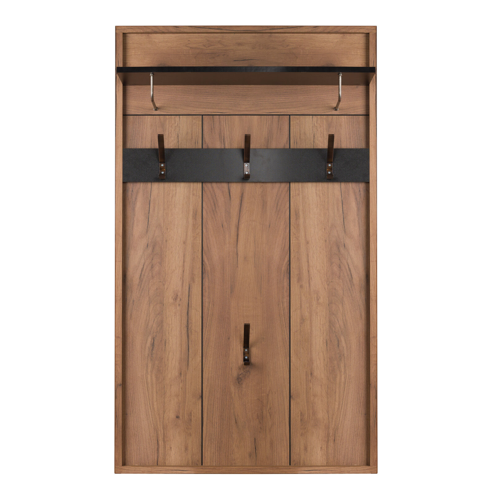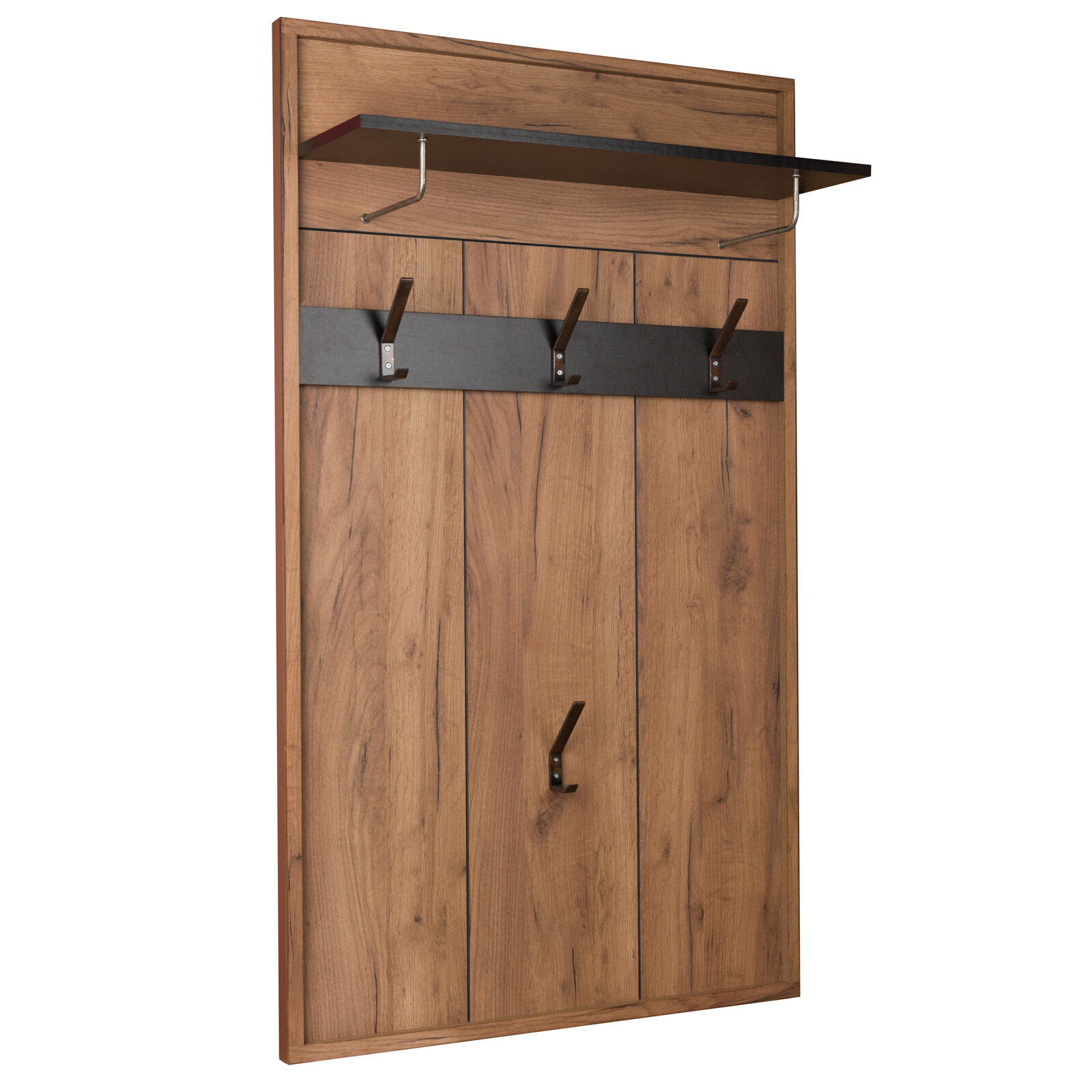 Настенная вешалка «Nature 76 Вешалка Дуб табачный Craft-Черный» поможет использовать пространство прихожей экономно и рационально. Панель оснащена полкой для головных уборов и крючками для верхней одежды и сумок. «Мебель поставляется в разобранном виде».