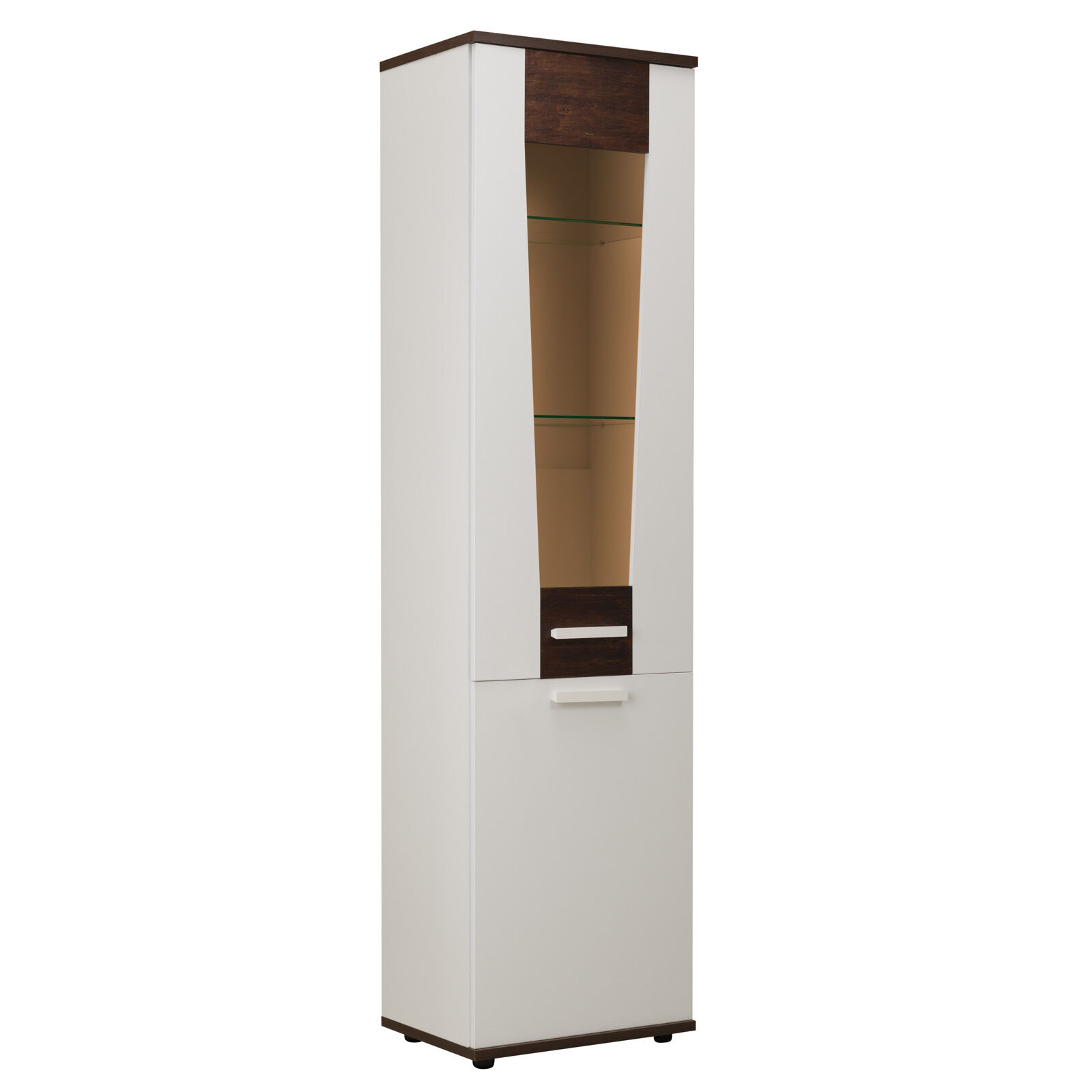 Норвуд 13 Шкаф для посуды - этот модуль создан для красивой посуды, хрупких сувениров. Высокий и узкий шкаф - пенал будет уместен в гостиной любых размеров. Фигурный фасад верхней витрины эффектно совмещает в себе тонированное стекло, ЛДСП и брашированную деревянную вставку. Стеклянные полки - из прозрачного стекла толщиной 6 мм. Фасады шкафа перенавешиваются на левую и правую сторону. «Мебель поставляется в разобранном виде».