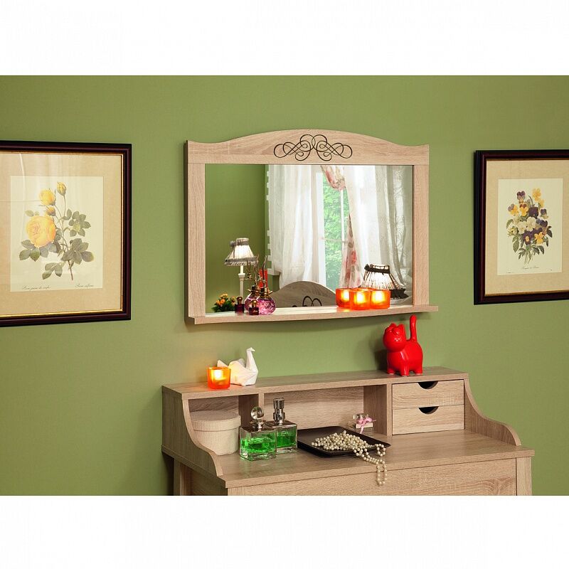 Изысканное зеркало навесное с витиеватым узором, цвет которого вторит спинке кровати. Нижнюю планку его можно использовать в качестве функциональной полки или собрать, как дополнительный декоративный элемент симметрично верхней планке.