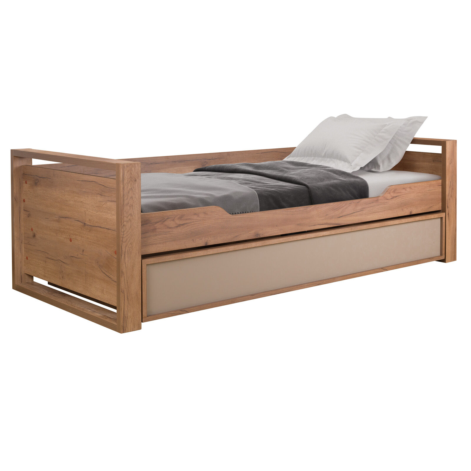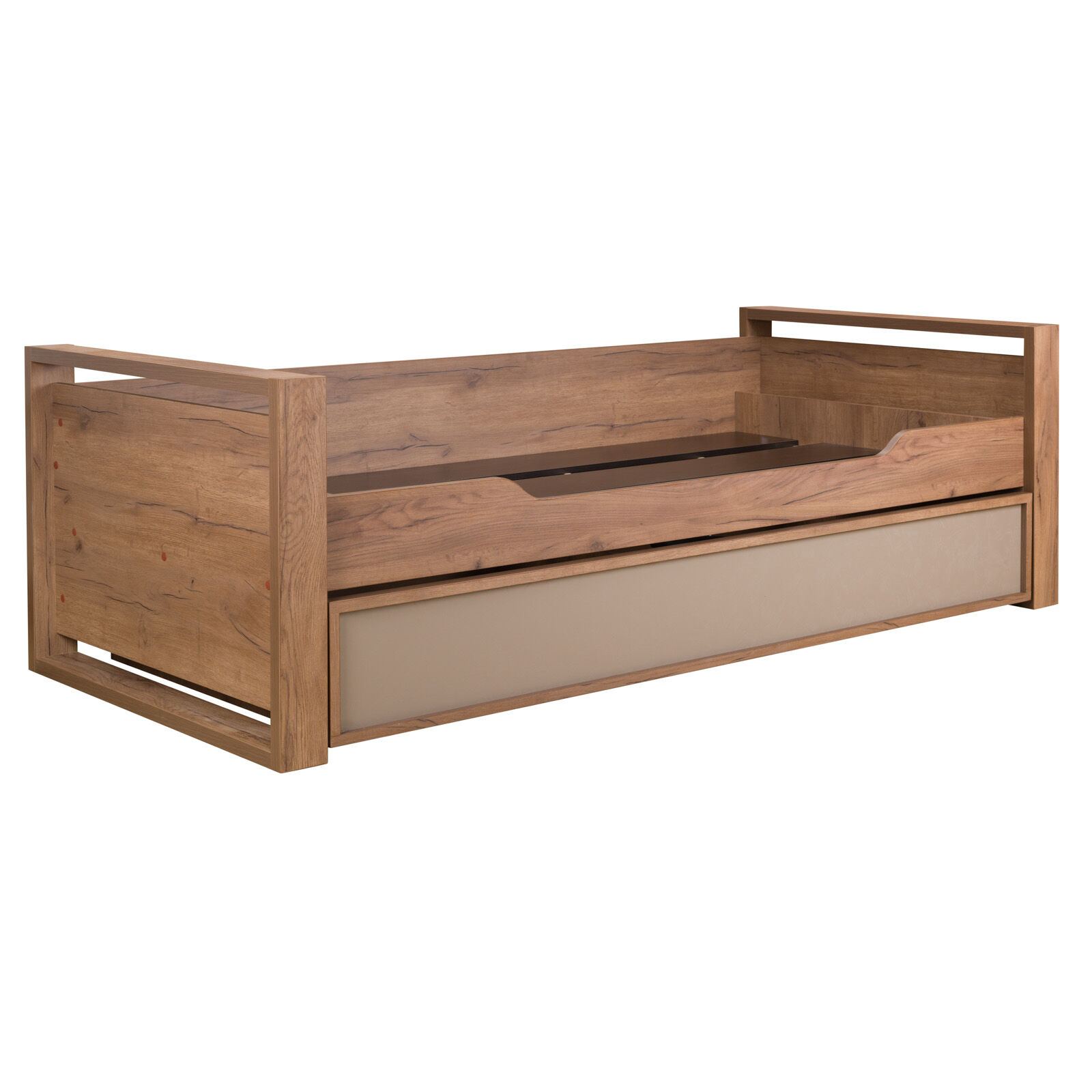 Детская или подростковая кровать «Nature 80 Дуб табачный Craft-Мокко» с большим ящиком глубиной 182 мм на выкатных роликах. Его можно использовать как место для хранения постельного белья или как дополнительное спальное место для незапланированных гостей. Дополнительные боковые ниши в кровати помогут подростку держать под рукой необходимые перед сном вещи. «Матрас в комплект не входит». «Мебель поставляется в разобранном виде».
