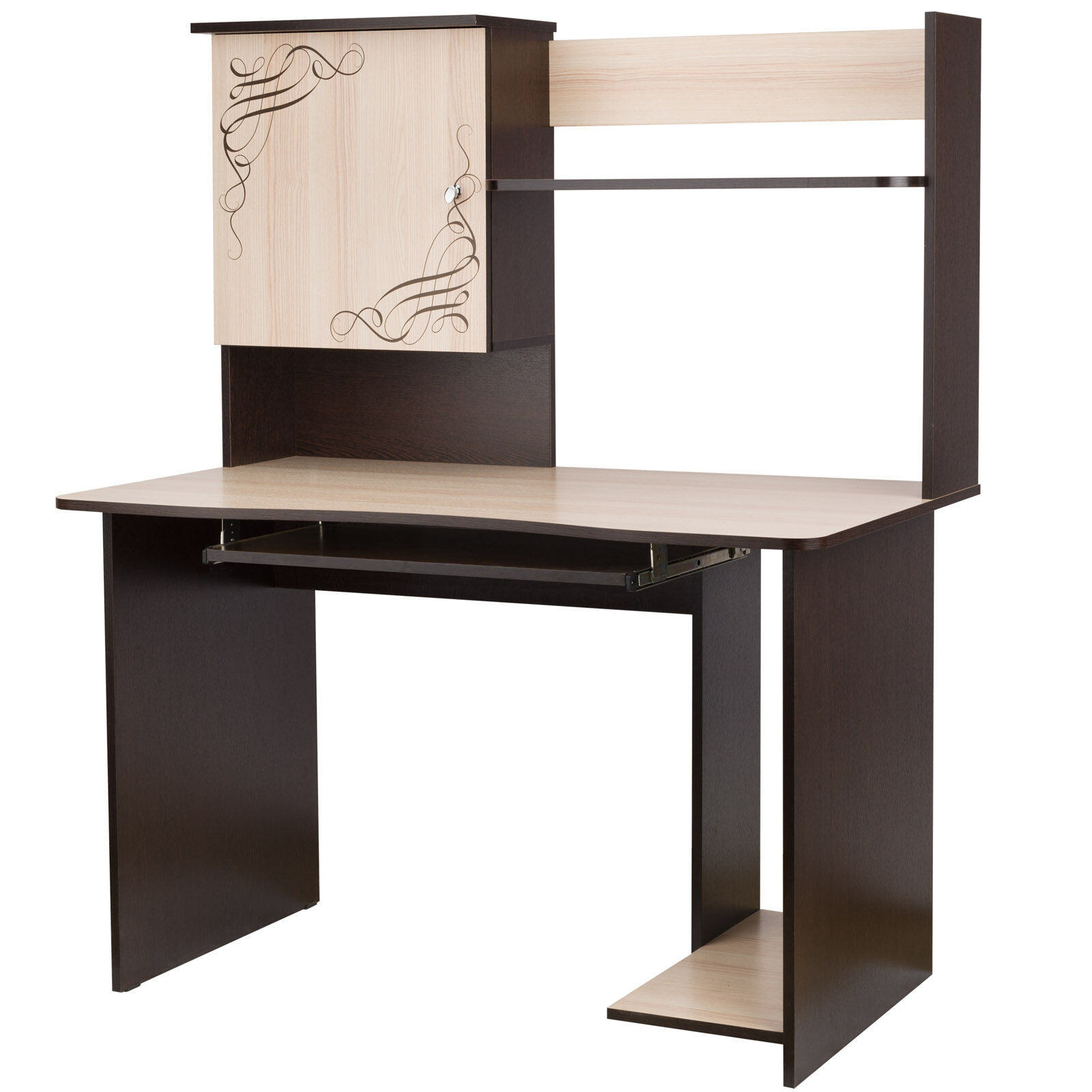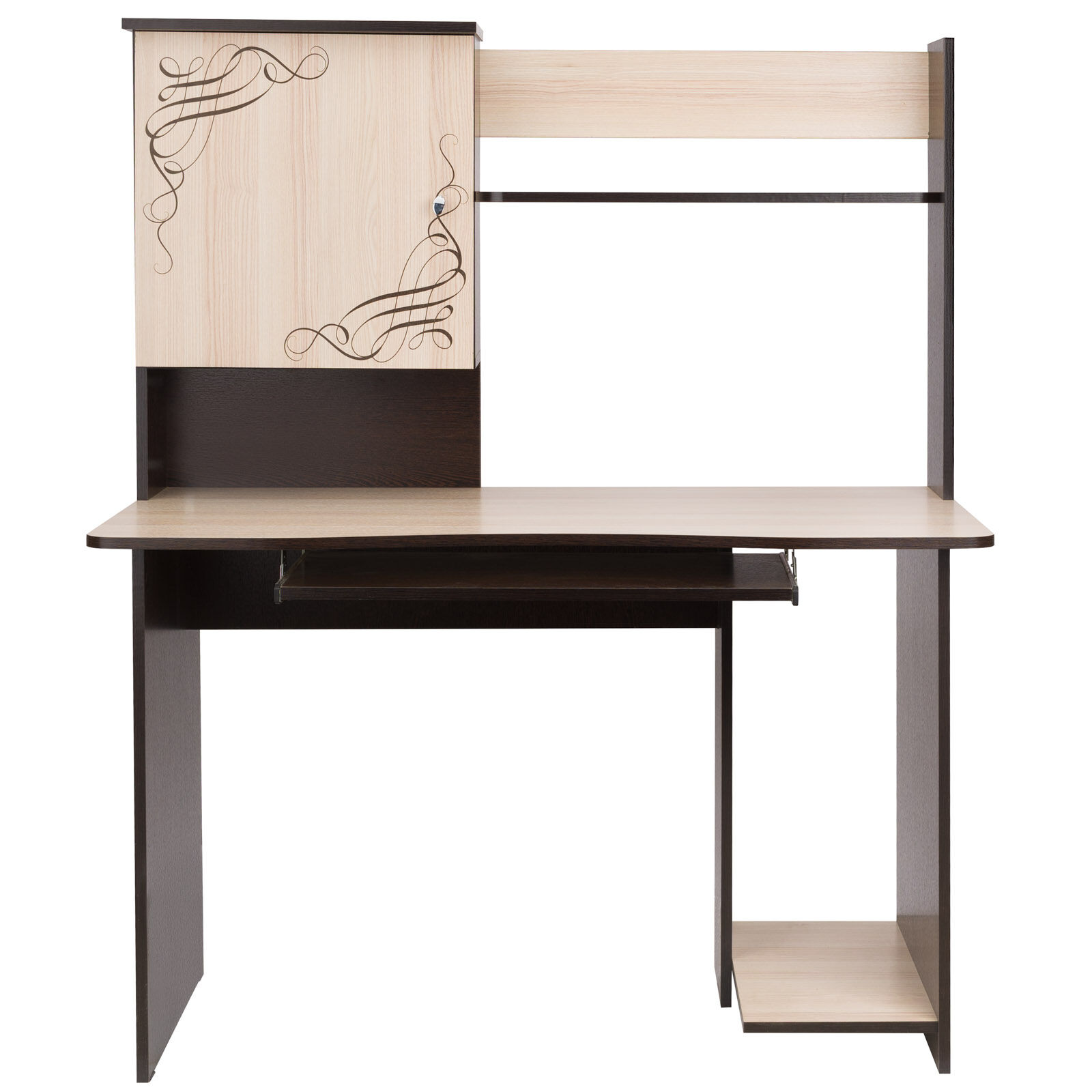 Эргономичный компьютерный стол с удобной волнистой столешницей. У стола предусмотрена выдвижная панель для клавиатуры, полка под системный блок. Полка над столешницей разместит книги или канцтовары. За распашной дверцей расположена полка.