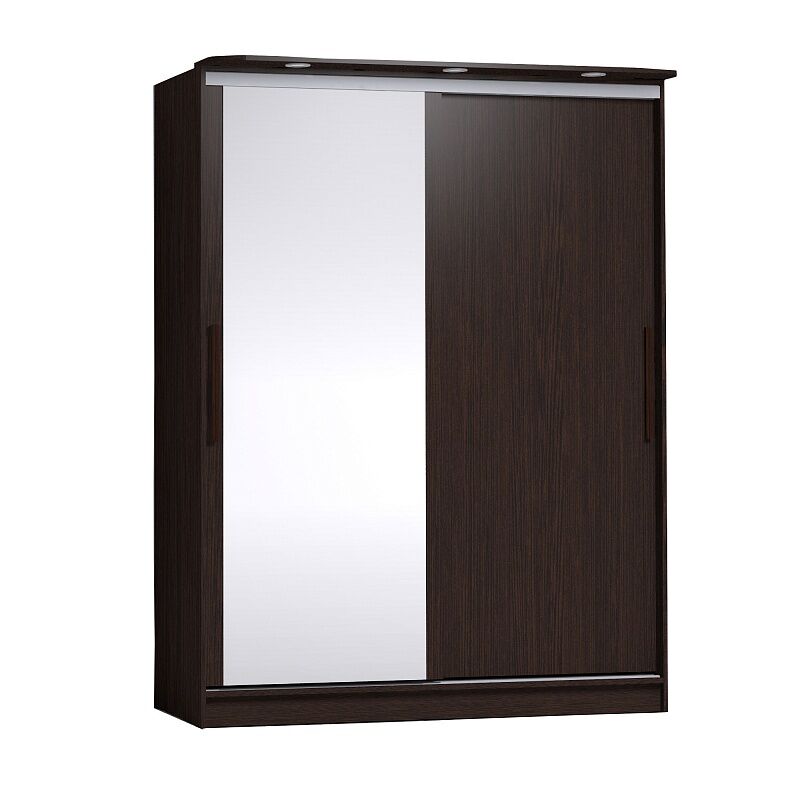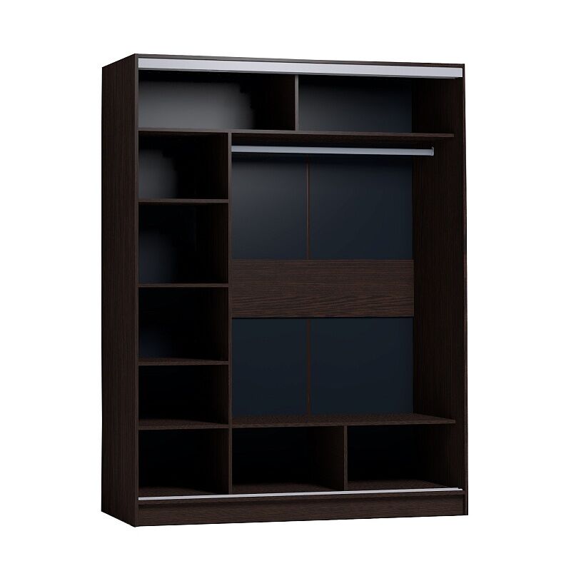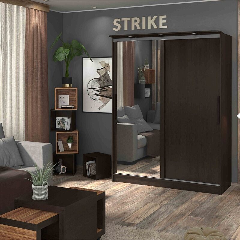 Продуманное внутреннее наполнение шкафа -купе с зеркалом «Strike 160 Венге» состоит из стеллажа для белья, четырех больших ниш внизу и вверху, а также стационарной штанги длиной больше метра. Зеркальная дверца с обратной стороны проклеена специальной защитной пленкой, которая предотвратит от падения осколков, если она разобьется. Двери шкафов дополнены ручками из массива и шлегелем, который смягчает удары дверей при закрывании, а также защищают вещи от попадания пыли. Благодаря скрытым полкодержателям полки жестко крепятся на необходимой высоте. «Мебель поставляется в разобранном виде».