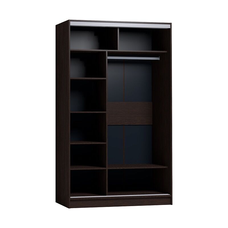 Продуманное внутреннее наполнение шкафа-купе «Strike с зеркалом 120 Венге» состоит из стеллажа для белья и стационарной штанги длиной 725 мм. На ней поместится как минимум 10 плечиков с верхней одеждой. Зеркальная дверца с обратной стороны проклеена специальной защитной пленкой, которая предотвратит от падения осколков, если она разобьется. Двери шкафов дополнены ручками из массива и шлегелем, который смягчает удары дверей при закрывании, а также защищают вещи от попадания пыли. Благодаря скрытым полкодержателям полки жестко крепятся на необходимой высоте. «Мебель поставляется в разобранном виде».