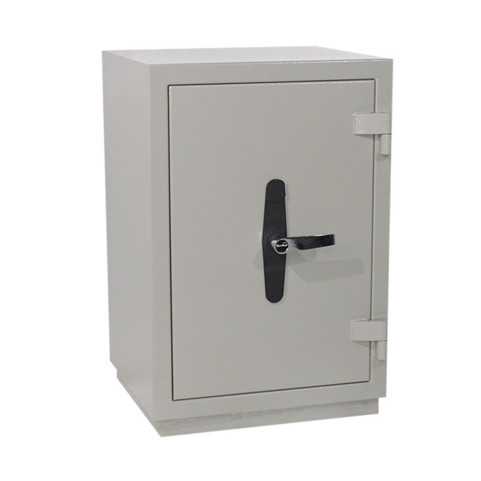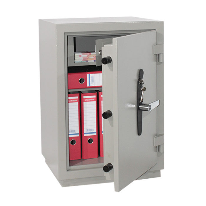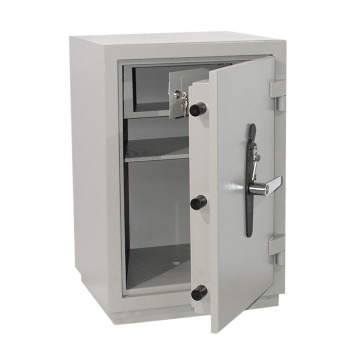 Сейф КЗ-035Т предназначен для хранения денег, ценных бумаг и документов. Внутри сейфа КЗ-035т располагается отсек ограниченного доступа (трейзер), запираемый на замок «почтового» типа и одна полка. В дне сейфа предусмотрено отверстие Ø11 мм для возможности анкерного крепления его к полу. Дверь сейфа оборудована запорным механизмомс 2-х сторонней ригельной системой запирания (по 3 ригеля Ø28 мм вправо/влево), который блокируется ключевым сейфовым замком класса «А» фирмы «CAWI» или «MAUER» производства Германии. Запорный механизм приводится в действие при помощи ручки. Чтобы открыть сейф необходимо: вставить ключ в замочную скважину, открыть замок и повернуть ручку на 90°. Закрывать в обратном порядке. Петли сейфа наружные, открывание двери – на 180°.