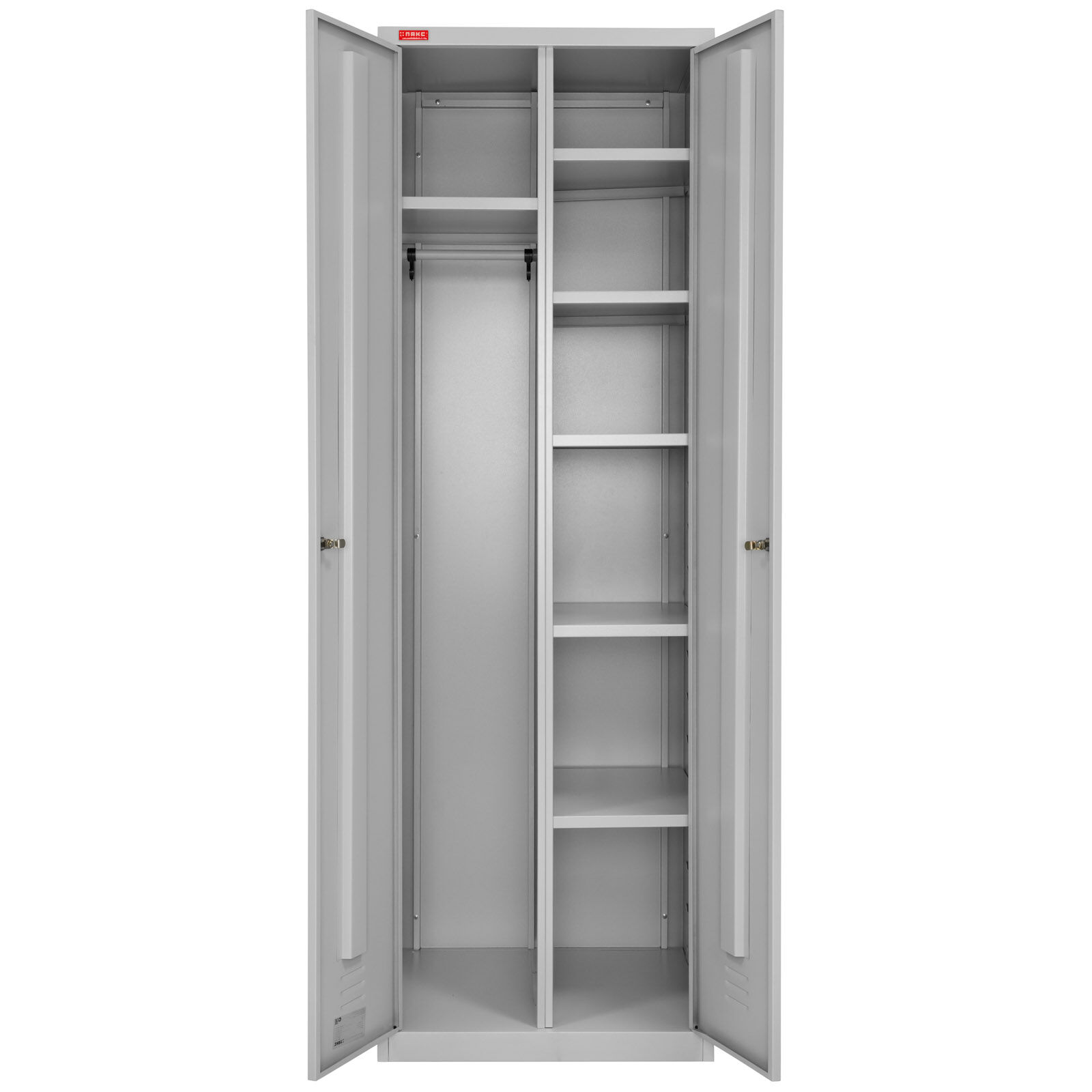 Шкаф разборный металлический двухсекционный. В одном отделении - полка для головного убора и перекладина для вешалки, в другом три регулируемые полки по высоте. Врезной замок. Полимерное порошковое покрытие фирмы. «Мебель поставляется в разобранном виде».