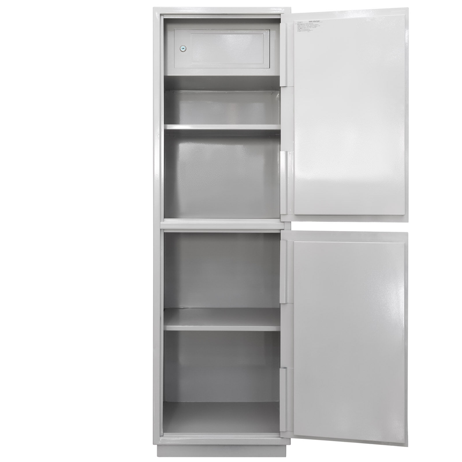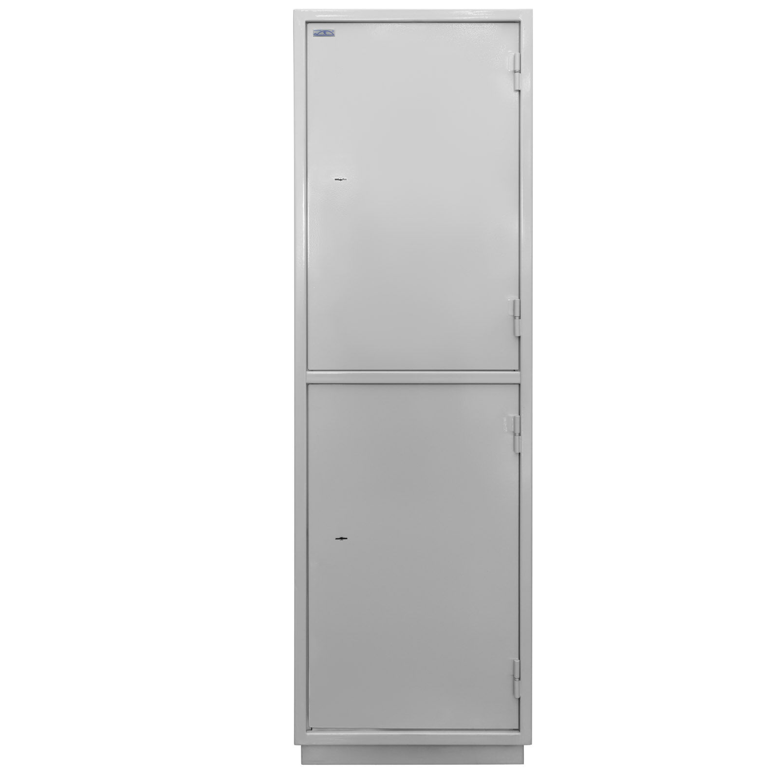 Металлический шкаф КБ-032Т, двухсекционный, двери закрываются на ключевые замки Kale. Корпус и дверь шкафа изготовлены из стального листа толщиной 2 мм, дверь изнутри усилена фальш-панелью. ШхВхГ 470х1555х395