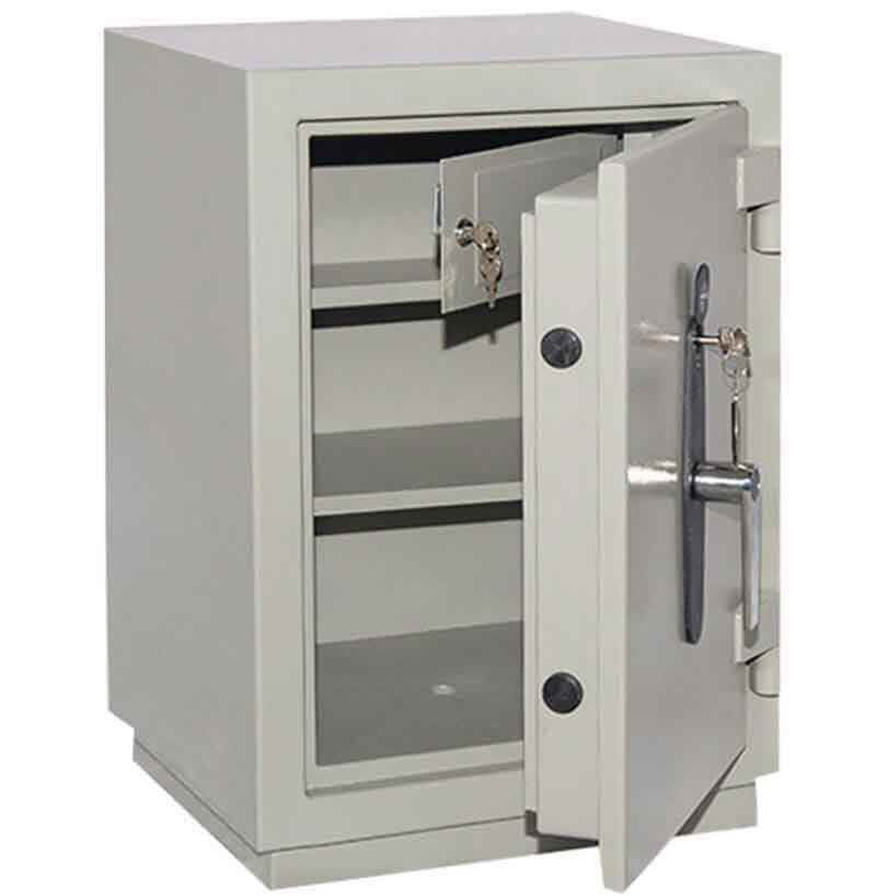 Двухсекционный сейф КЗ-0132Т предназначен для хранения документов и ценностей дома и в офисе. Внутри сейфа «КЗ-132Т» располагается отсек ограниченного доступа (трейзер), запираемый на замок «почтового» типа и одна съемная полка. В дне сейфа предусмотрено отверстие Ø11 мм для возможности анкерного крепления его к полу. Дверь сейфа оборудована запорным механизмомс 2-х сторонней ригельной системой запирания (по 2 ригеля Ø28 мм вправо,влево), который блокируется ключевым сейфовым замком класса «А» фирмы «CAWI» или «MAUER» производства Германии. Запорный механизм приводится в действие при помощи ручки. Чтобы открыть сейф необходимо: вставить ключ в замочную скважину, открыть замок и повернуть ручку на 90°. Закрывать в обратном порядке. Петли сейфа наружные, открывание двери – на 180°.