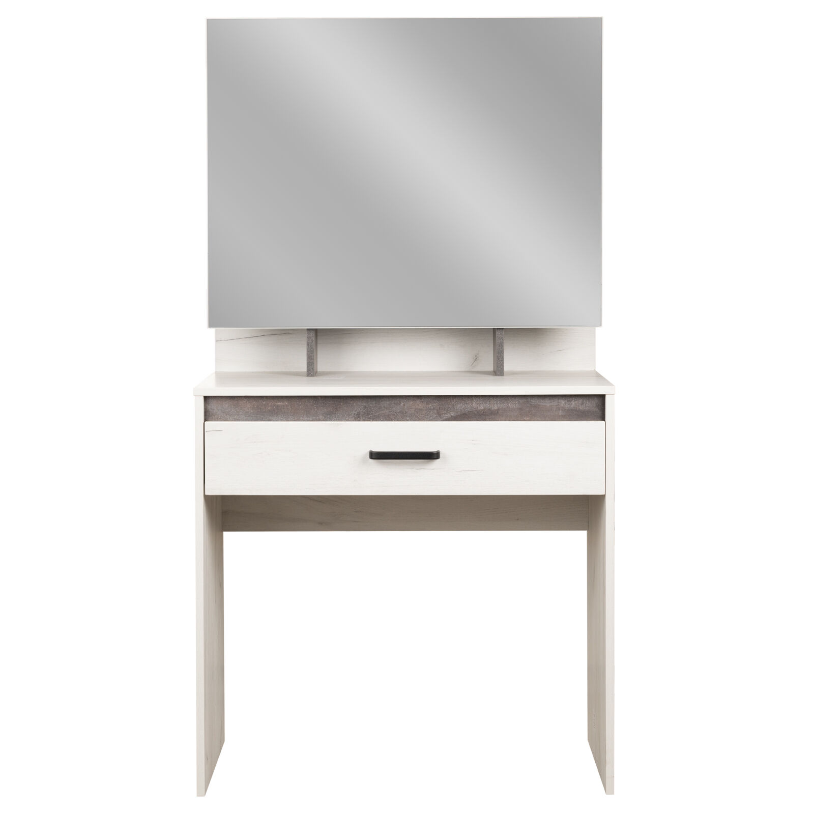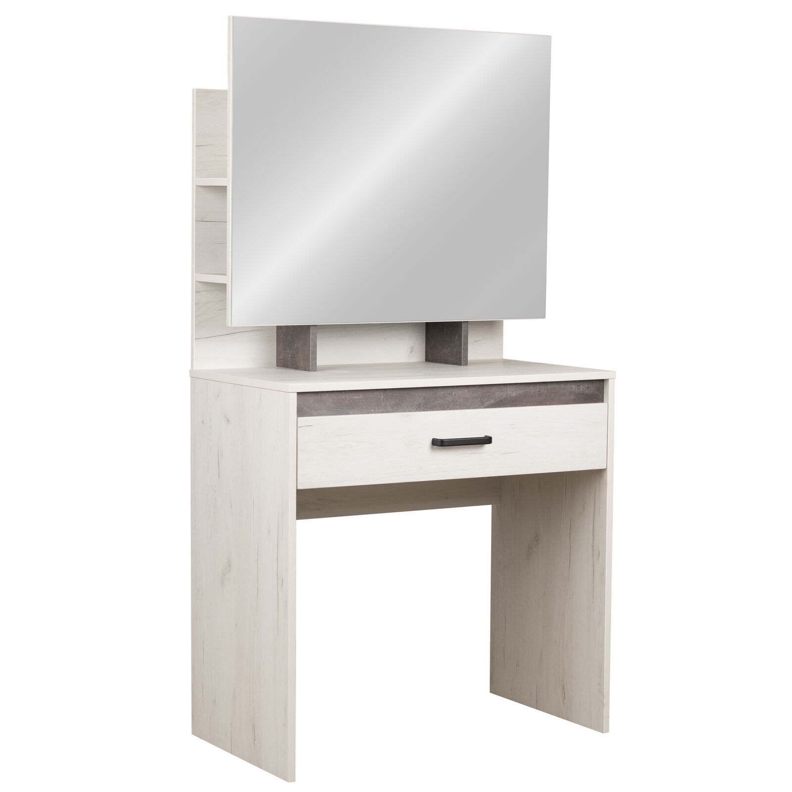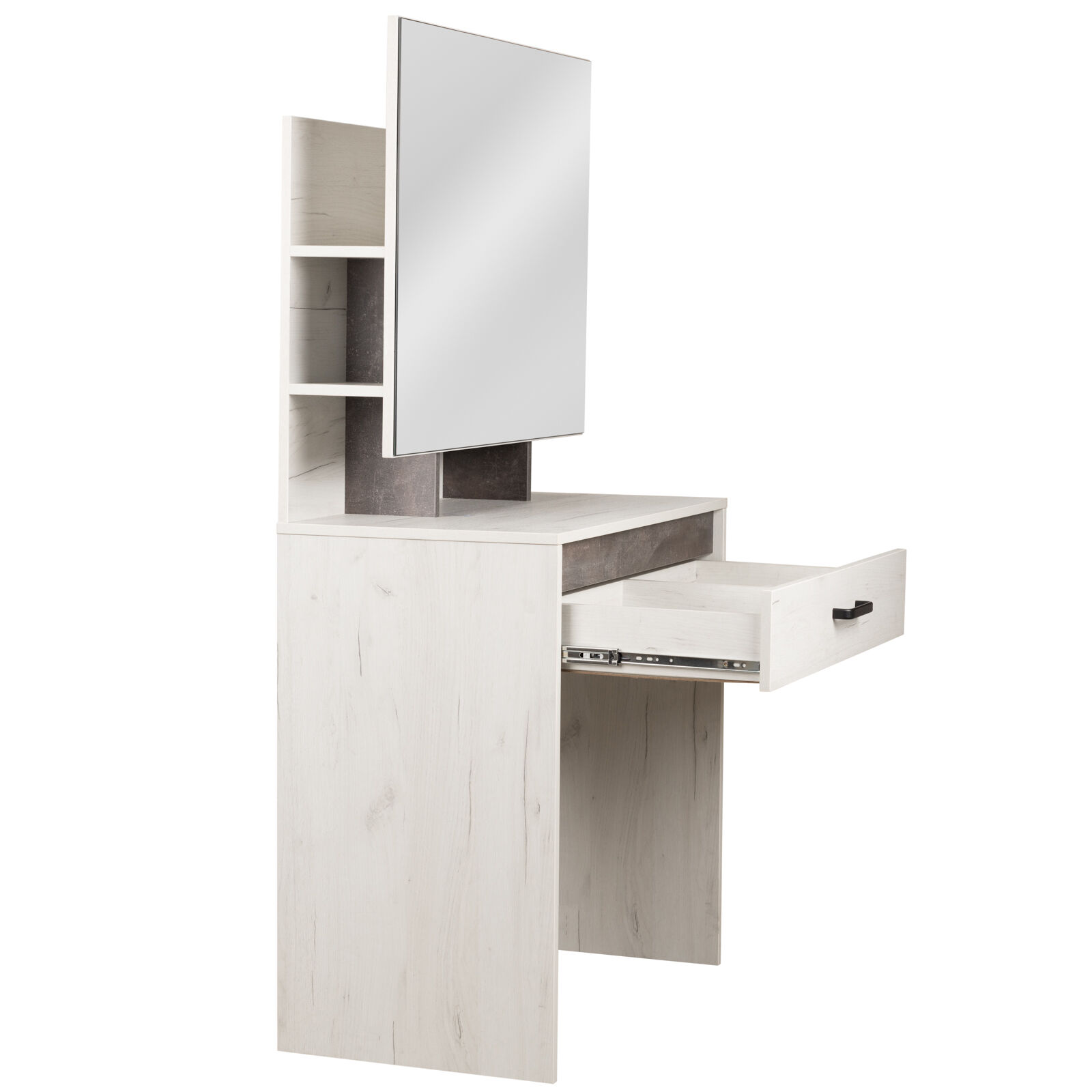 Макияжный стол «Прага Дуб белый Крафт Ателье темное», снабженн выдвижным ящиком, в котором можно спрятать всю косметику, которая используется. Конечно, очень важным элементом является также зеркало, без которого было бы просто невозможно сделать макияж. «Мебель поставляется вразобранном виде».