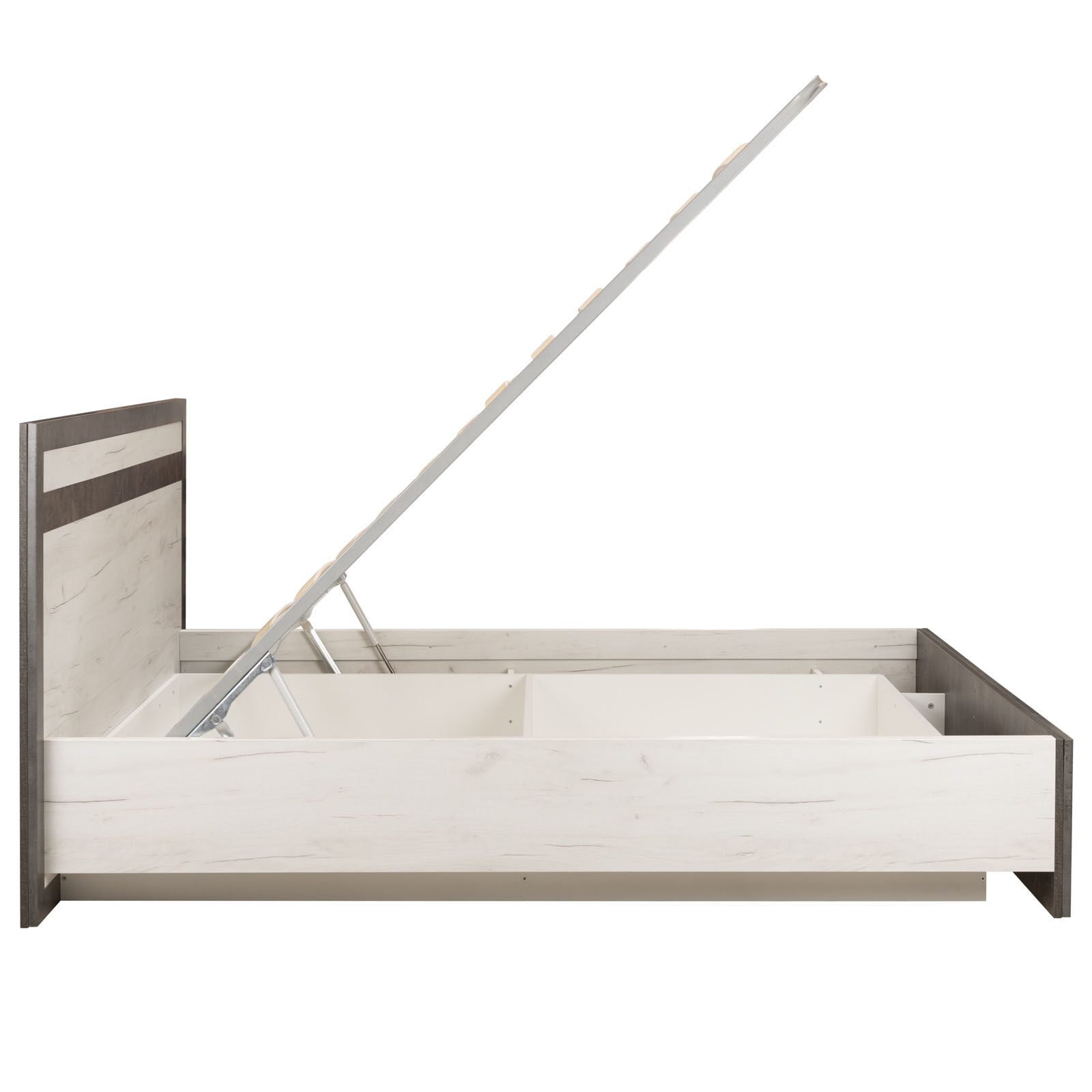 Двуспальная кровать «Прага 140 с подъемн механизмом + ортопедическое основание Дуб белый Крафт-Ателье темное». Подъемный механизм, которым оснащено основание кровати, добавляет комфорта в использовании модели, облегчая доступ к вместительному ящику для белья. «Матрас в комплект не входит». «Мебель поставляется в разобранном виде».