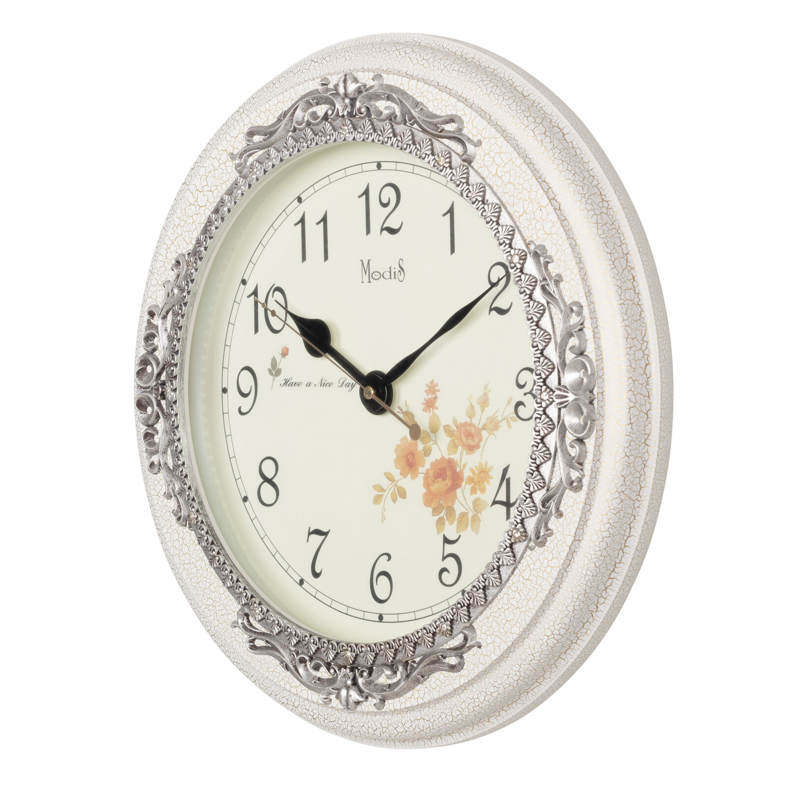 Круглые настенные часы с маятником в классическом стиле. Часы выполнены в светлом тоне. Украшают часы резные элементы наверху и внизу на корпусе, а так же непосредственно вокруг циферблата. Механизм:кварцевый.