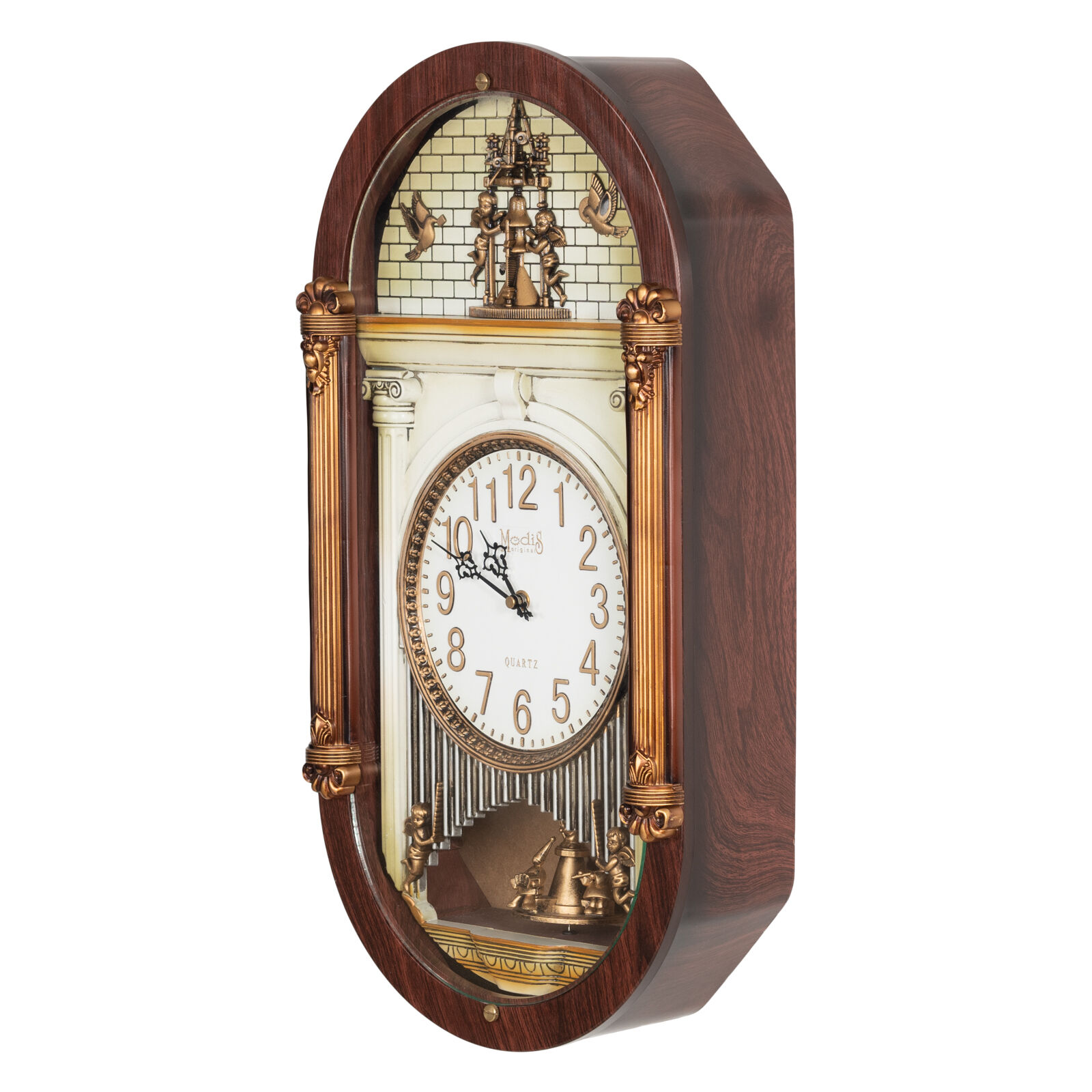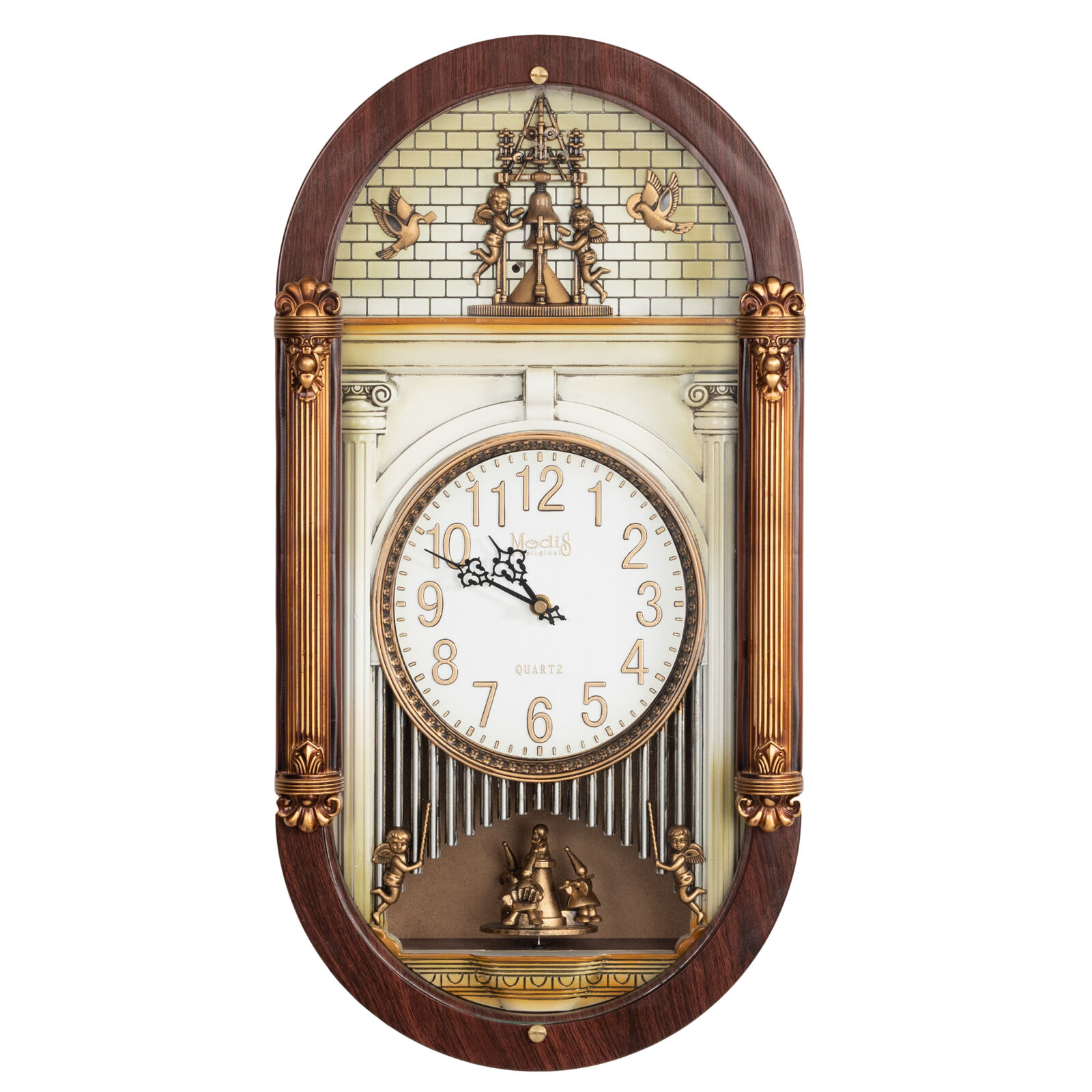 Плавный ход секундной стрелки. Питание от 3 элементов типа АА и 1 элемента R14(C). 12 мелодий звука с автоматической сменой каждый час. Световой датчик отключения звука на ночь.
