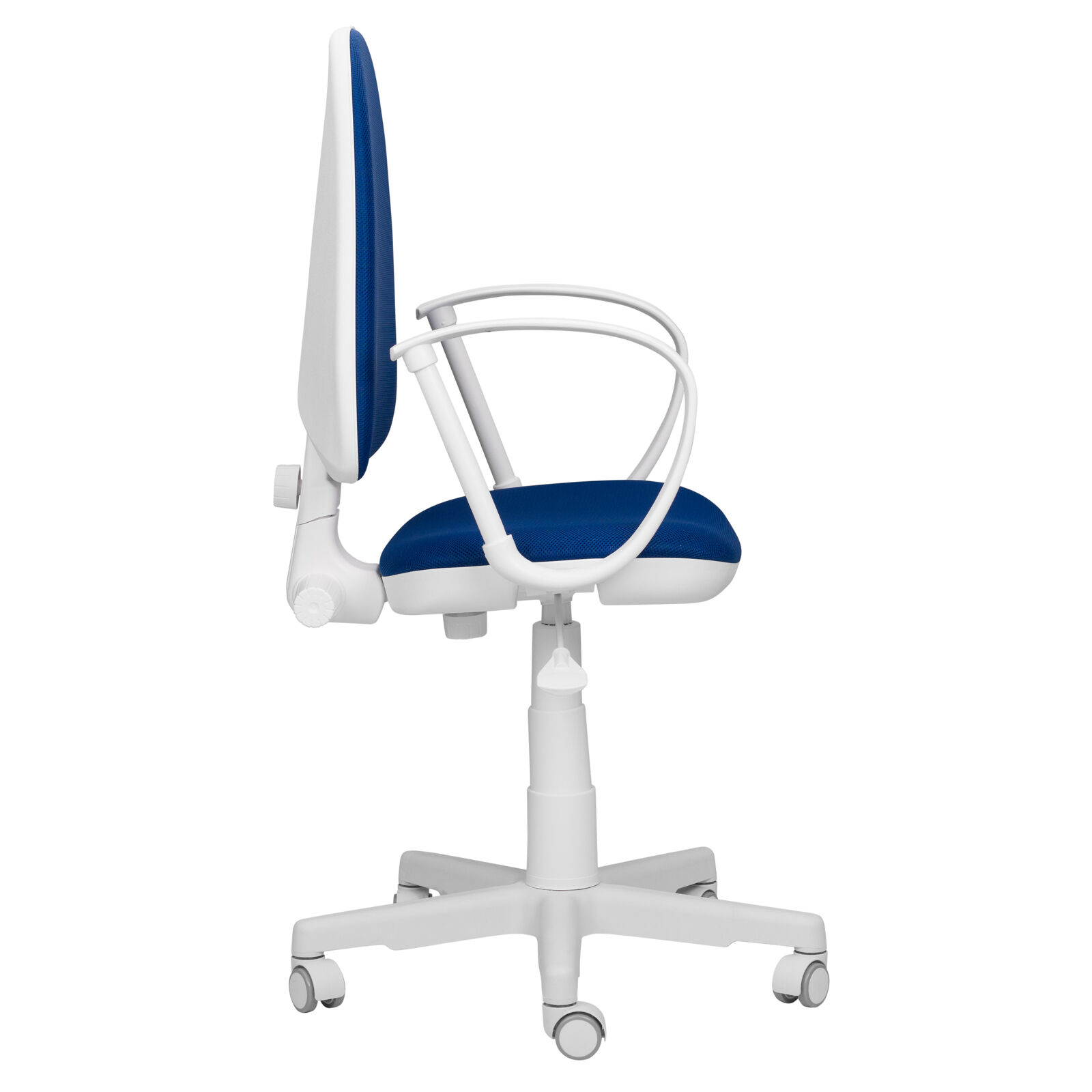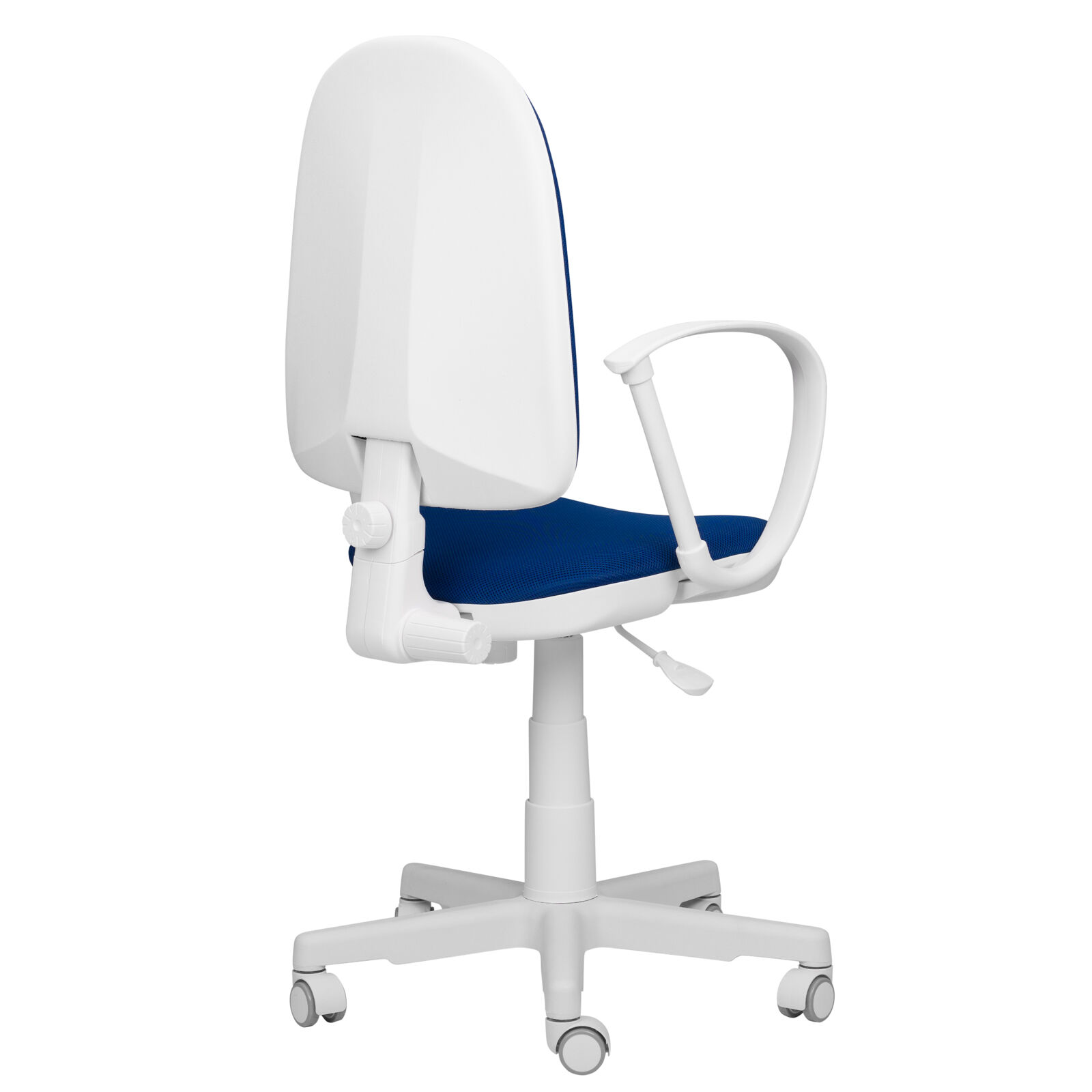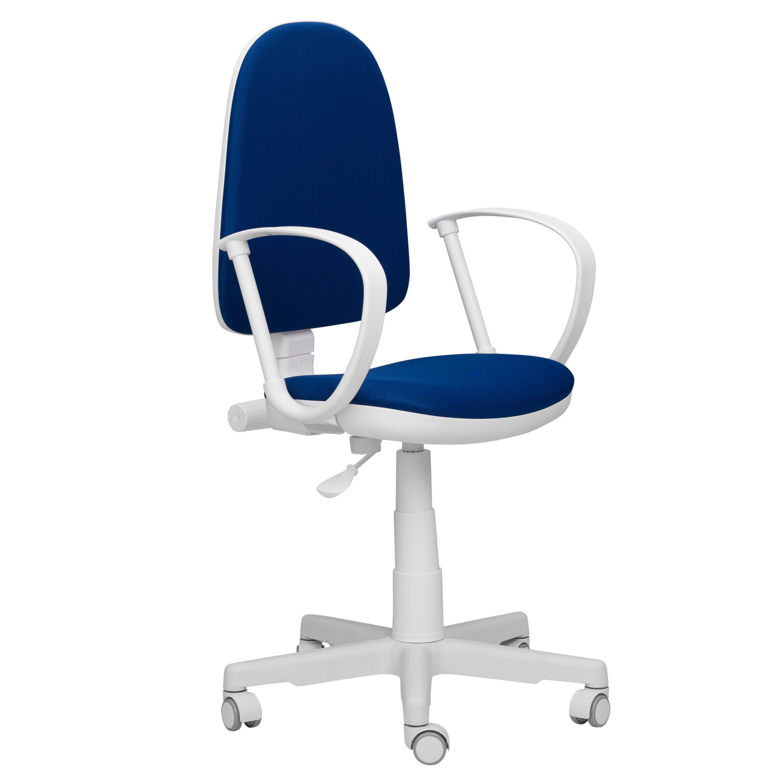 Кресло компьютерное детское «Престиж-Ф TW синий». Механизм качания спинки перманент контакт (пружинно-винтовой механизм). Регулировка по высоте Пиастра. Цельнолитая крестовина из пластика. Пластиковые подлокотники. Газпатрон 3-й категории стабильности по DIN 4550 (200 000 циклов динамической нагрузки 80 кг). Ролики стандарт BIFMA 5.1 (США), диаметр штока 11 мм, материал - нейлон. «Мебель поставляется в разобранном виде».