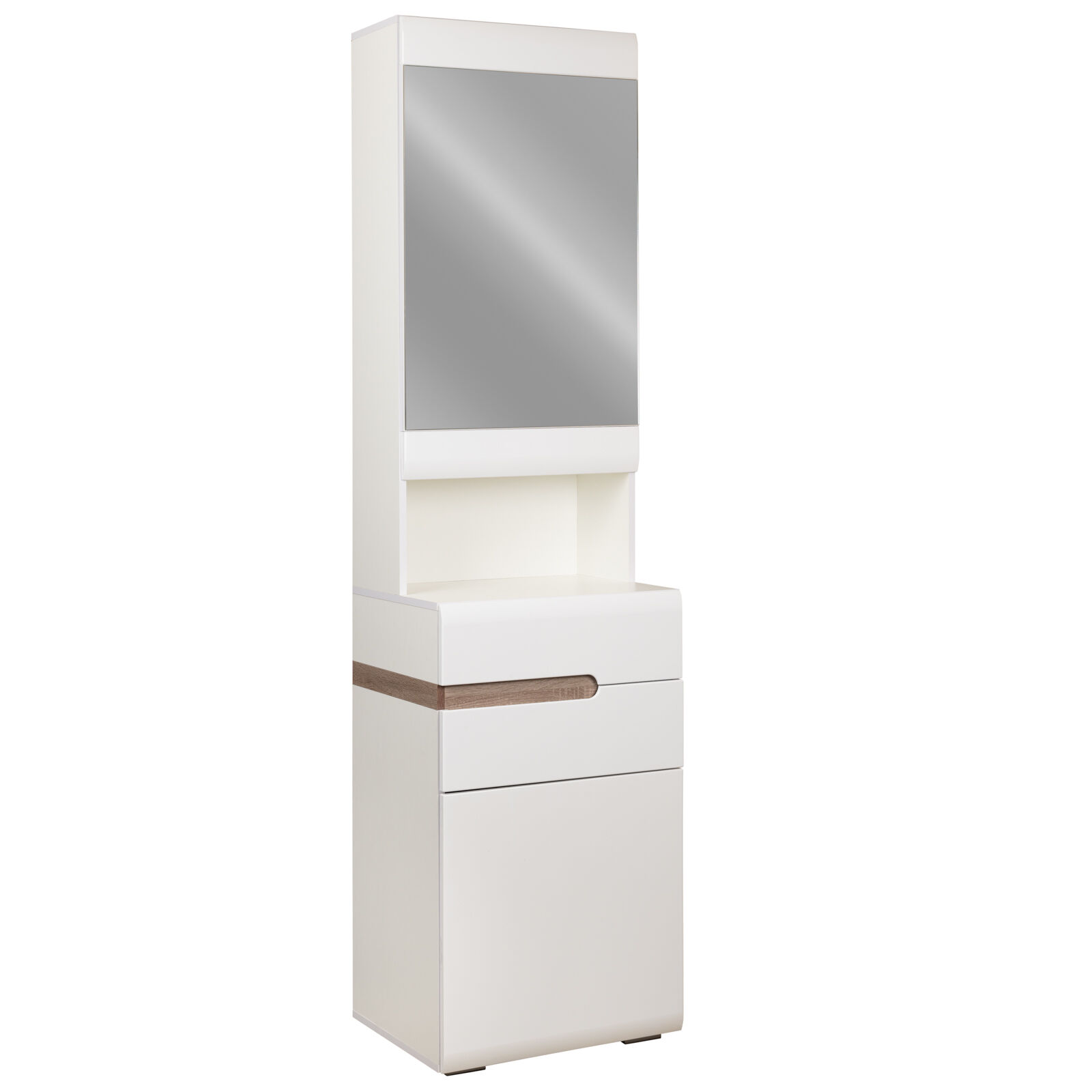 Тумба с зеркалом (прихожая) Ультра белый/белый гл. Фасад МДФ с фрезеровкой. Петли с доводчиком. Полновыкатные направляющие. Эко ЛДСП. Задний щит (ДВП) в цвет корпуса. Крепежный элемент - эксцентриковая стяжка. Оригинальное исполнение ручек. «Мебель поставляется в разобранном виде».