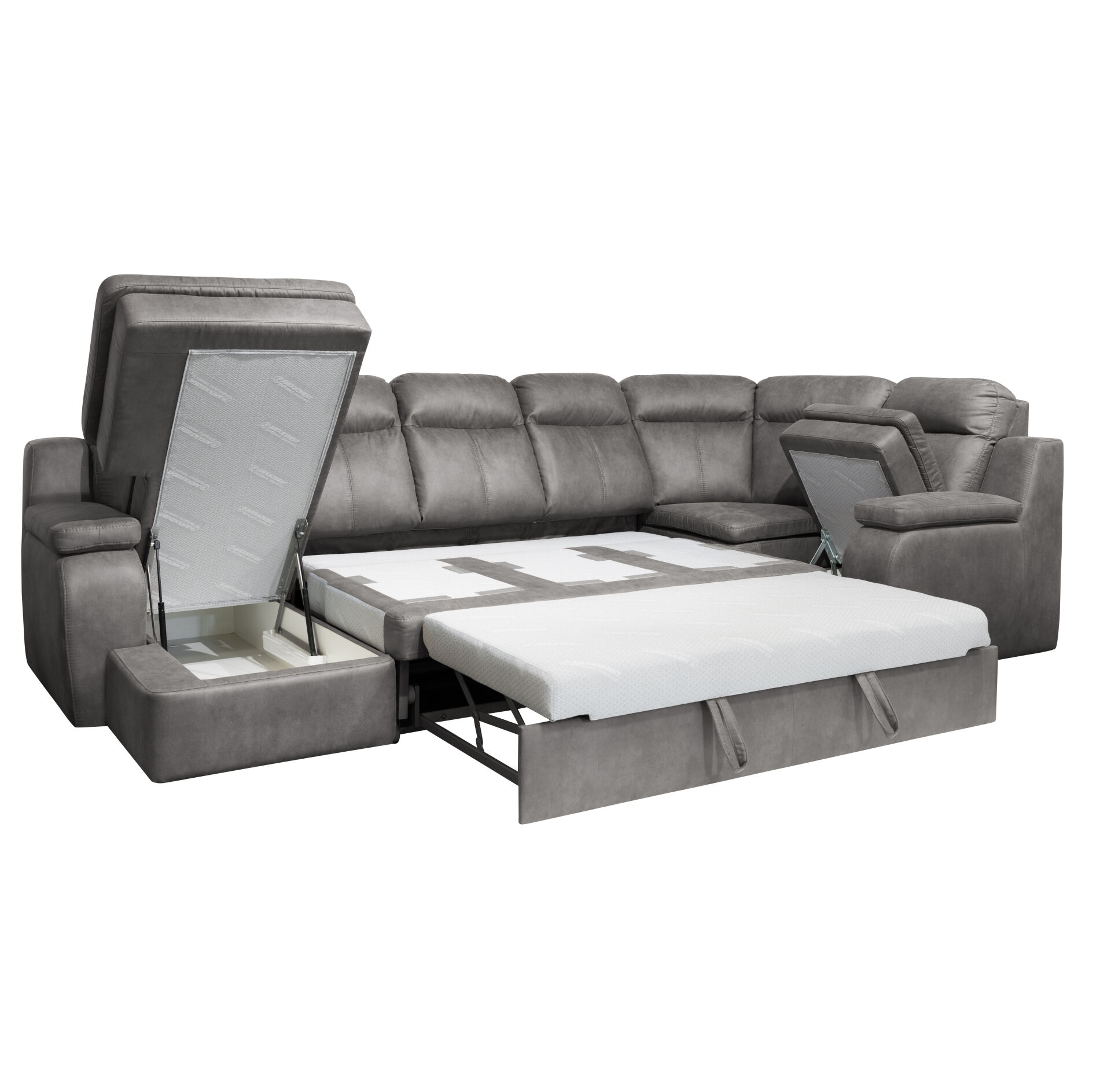 Диван «Guinness (Бл+Оул+3ру+Ум+1у+Бп) Matador Grey» - Эффектный внешний вид, сразу притягивает к себе внимание. Сиденья модулей отличаются пышностью и мягкостью, благодаря независимым пружинным блокам. Для раскладывания дивана применяется высоковыкатной механизм. Спальное место представляет собой полноценный ортопедический матрас, с комбинированным наполнителем из латекса и пенополиуретана (OrtoFoam). «Мебель поставляется в разобранном виде».