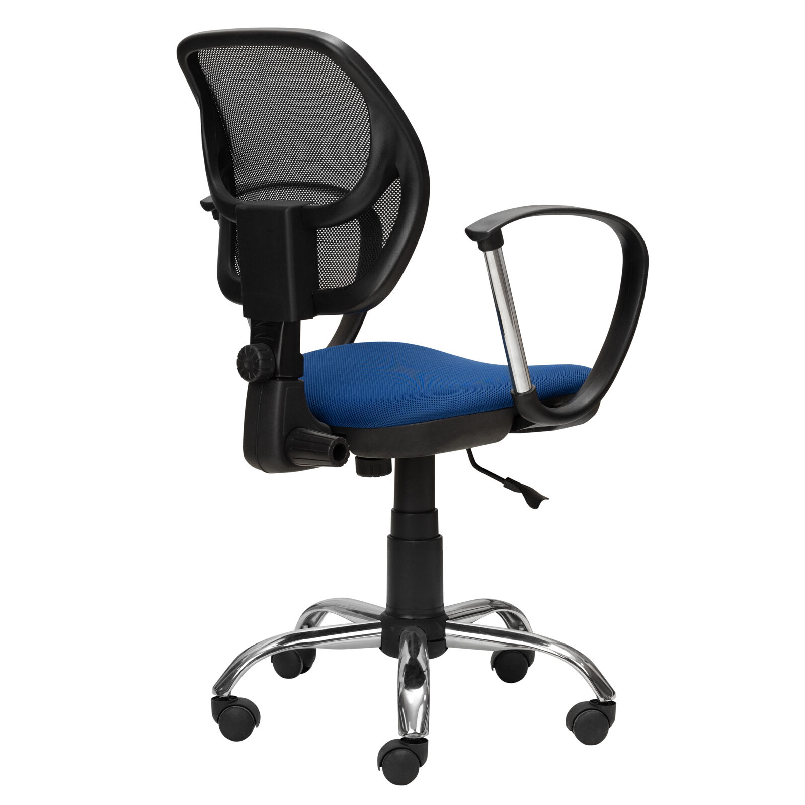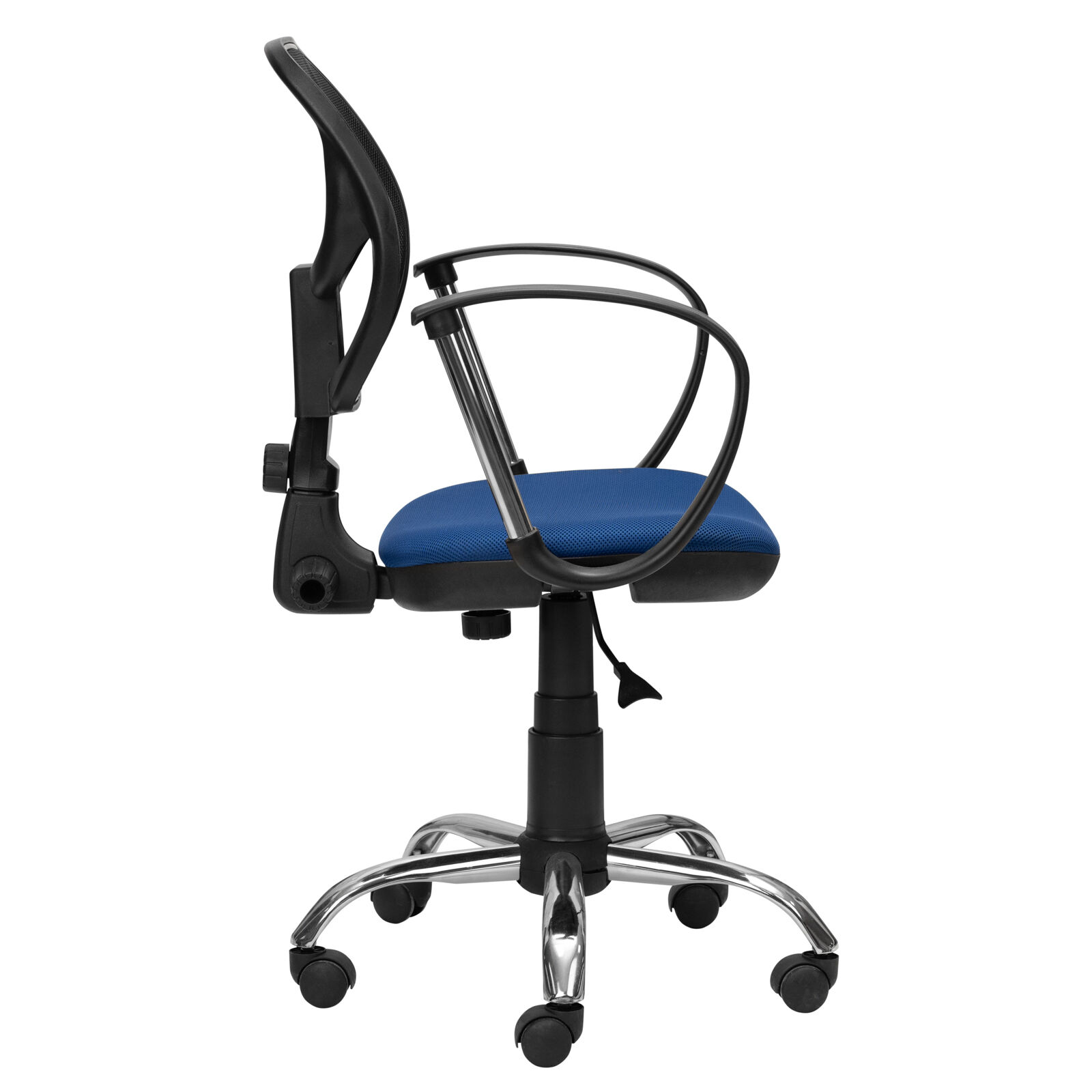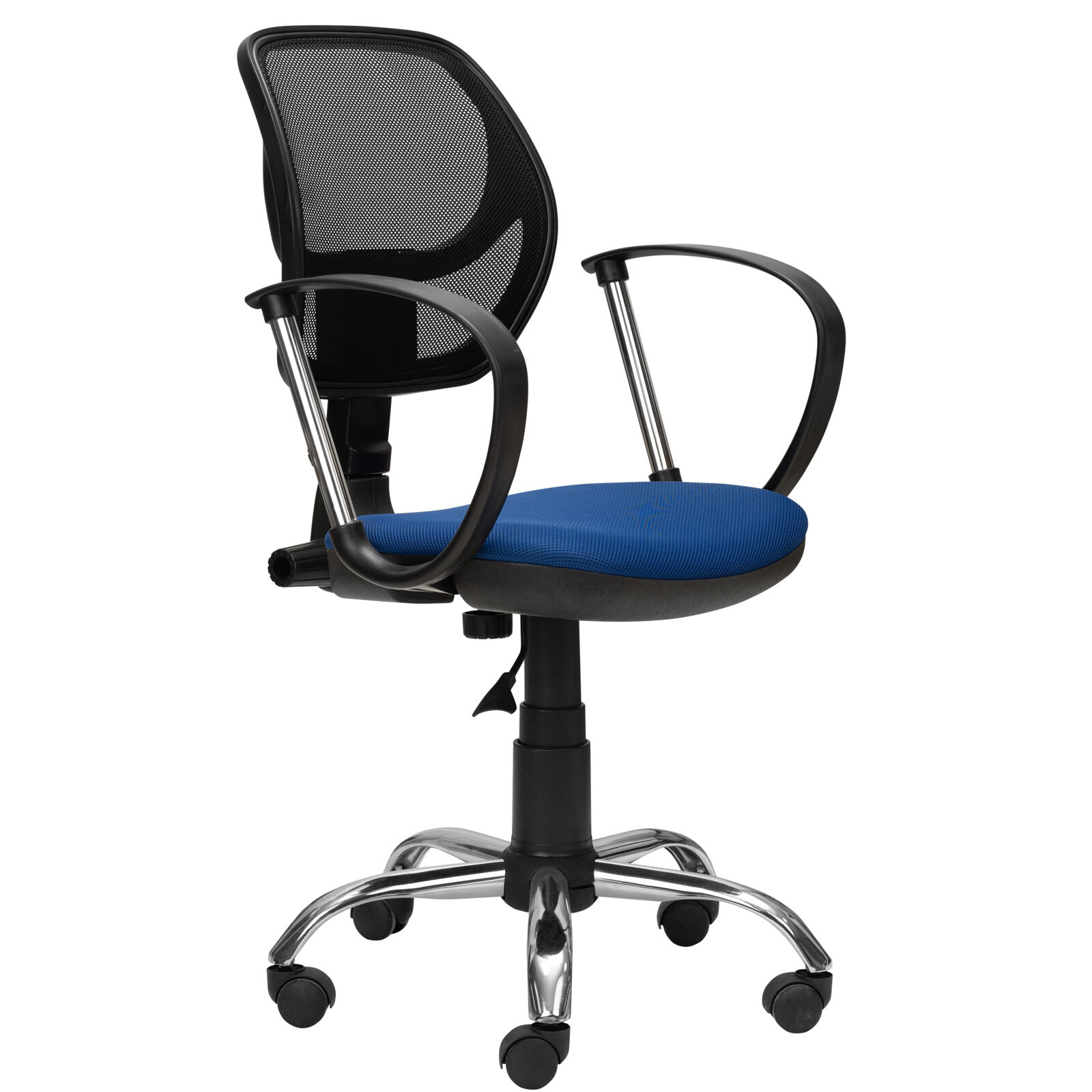 Кресло офисное «Кресло Сатурн-Хром TW синий»— экономичная модель, изготовленная из современных материалов, по степени комфорта не уступающих натуральным. Обивка спинки из акриловой сетки, обивка сиденья — ткань. Подлокотники из пенополиуретана, крестовина из наполненного стеклополиамида. Кресло оборудовано пружинным механизмом поддержки спины с возможностью регулировки сиденья по высоте. «Мебель поставляется в разобранном виде».