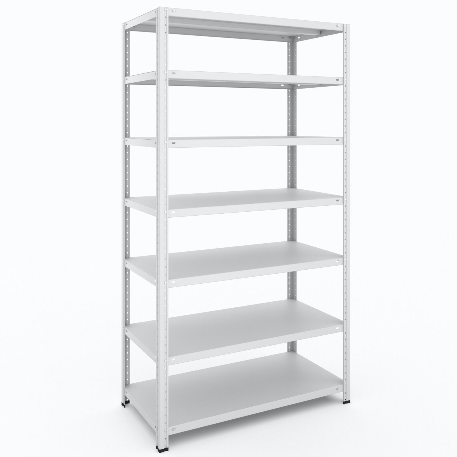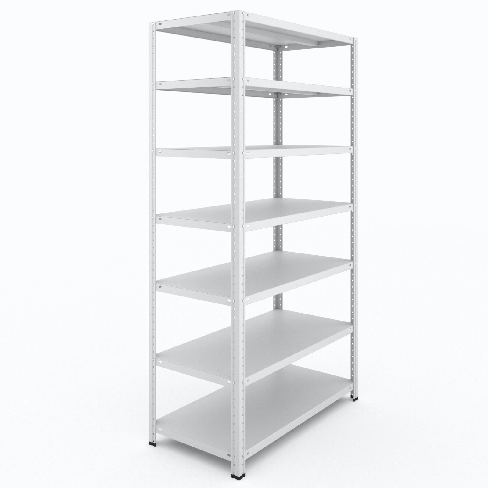 Металлический стеллаж «1000х500 7 полок» удобен для использования в гаражных, дачных, офисных, торговых и складских помещениях. Распределённая нагрузка на полку не более 100 кг и рекомендованной нагрузкой на верхнюю полку не более 60 кг. Стойки имеют сложный фигурный профиль и завальцованные края, что повышает их прочность, а значит и надежность всей конструкции стеллажа. Стойки комплектуются металлическими подпятниками, предохраняющими пол от повреждений. Полки усилены ребром жесткости. Стойки и полки окрашены полимерной (порошковой) краской RAL 7035 светло-серого цвета. «Мебель поставляется в разобранном виде».