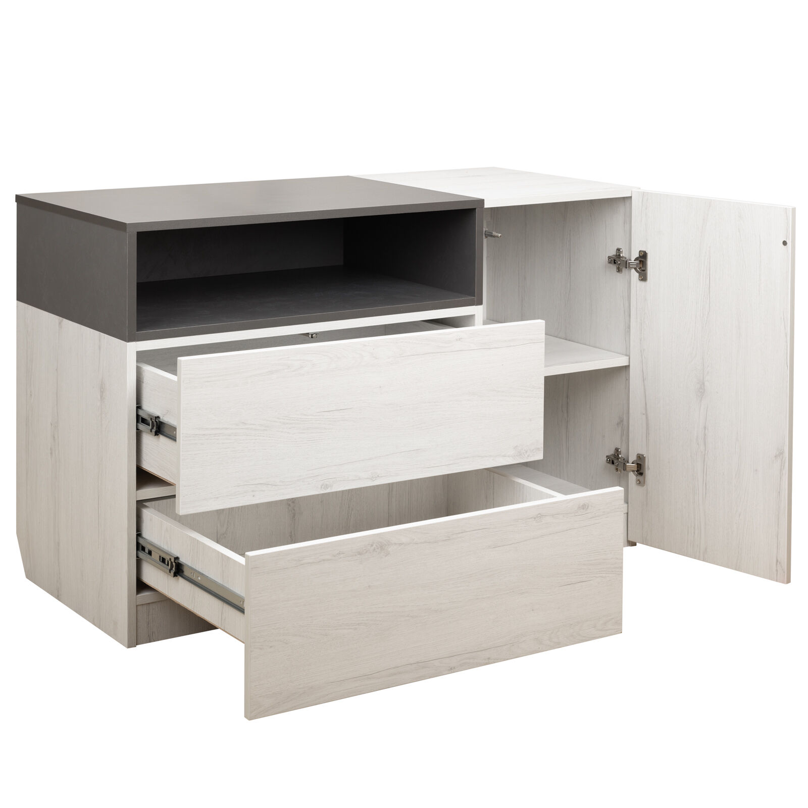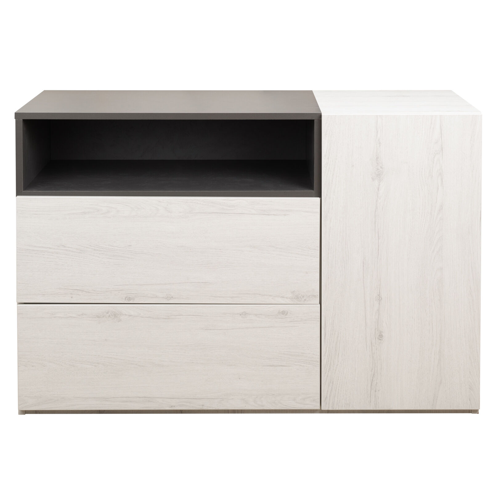 Комод «Ньютон Грей Дуб Эльза-Тем. Серый Лофт» предназначен для хранения вещей. Два выкатных ящика и сбоку дверца. За дверцей посередине одна полка. Ориентация односторонняя. «Мебель поставляется разобранном виде».