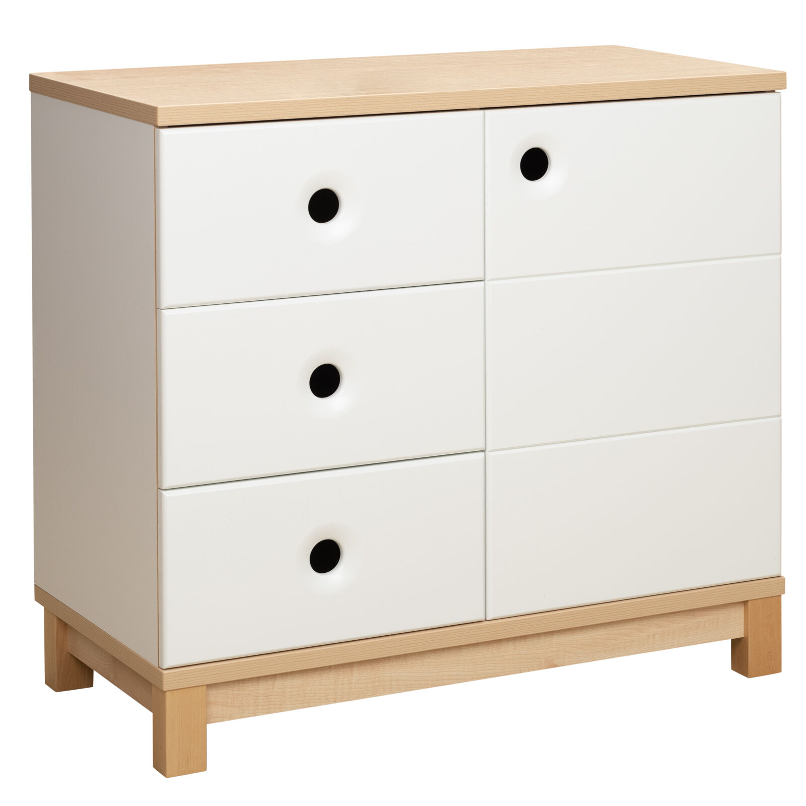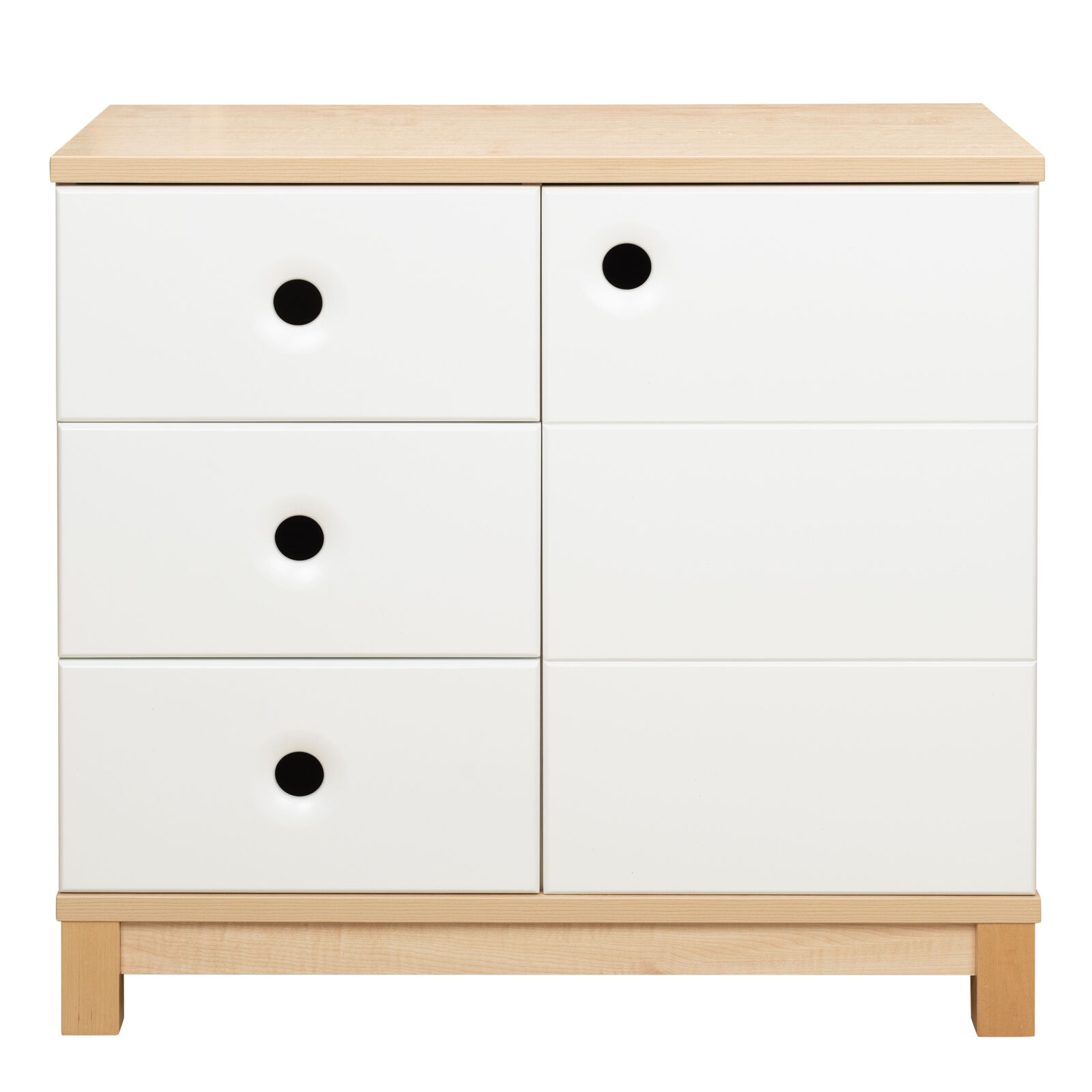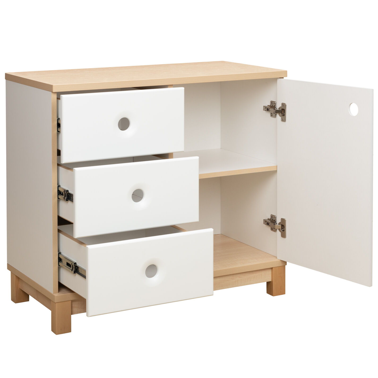 Комод «Робин Wood Лайт Клен - Белый 1.0.1» предназначен для хранения вещей. Три выкатных ящика и сбоку дверца. За дверцей посередине одна полка. Материал: Корпус: ЛДСП 16 мм. Основание и крышка: ЛДСП 22 мм. Фасады: МДФ, окрашенное эмалью, с фрезерованными ручками. Опоры: массив березы. Фурнитура: Направляющие шариковые. Петли с доводчиками.