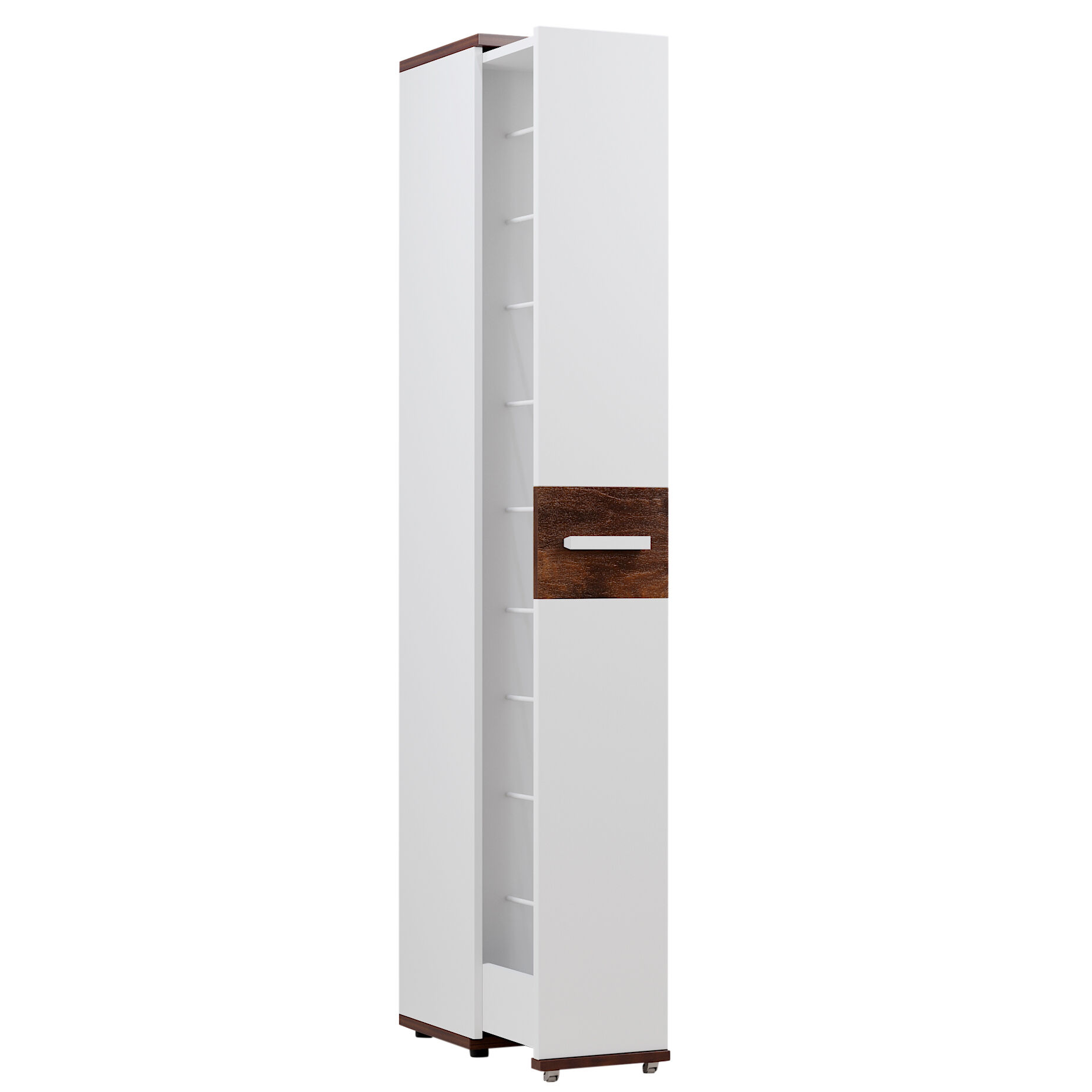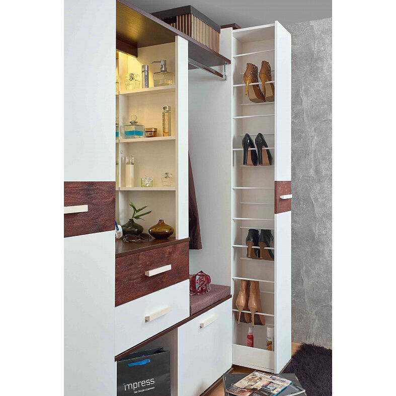 Шкаф для обуви «Белый-Орех шоколадный Норвуд 73 (прихожая)» поможет аккуратной хозяюшке разложить до 18 пар обуви, а также средства по уходу за ней. Шкаф выдвигается без усилий благодаря шариковым направляющим полного выдвижения и выкатным роликам. Пространство внутри шкафа вентилируется с помощью небольших отверстий на крышке и дне выдвижной части шкафа. «Мебель поставляется в рвзобранном виде».
