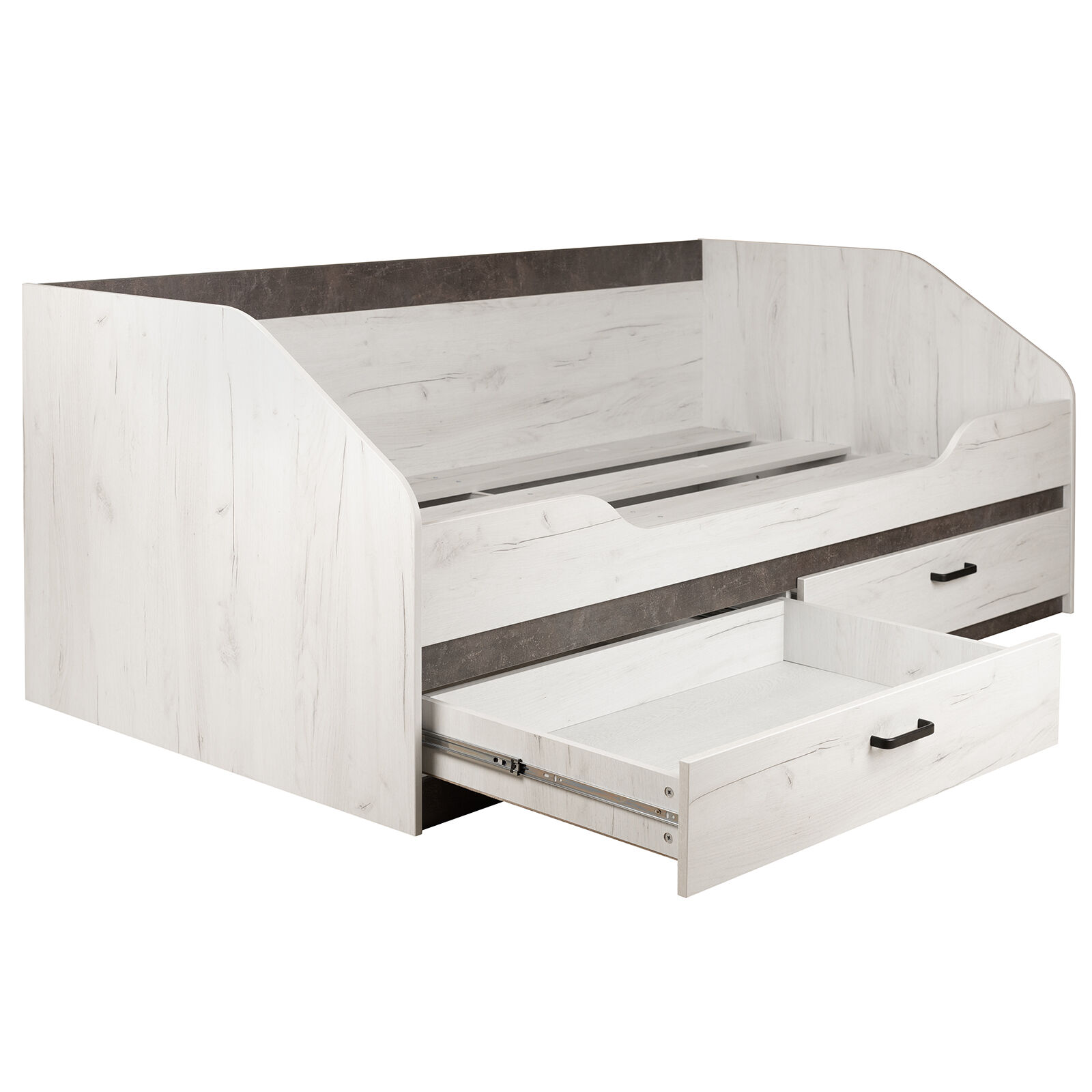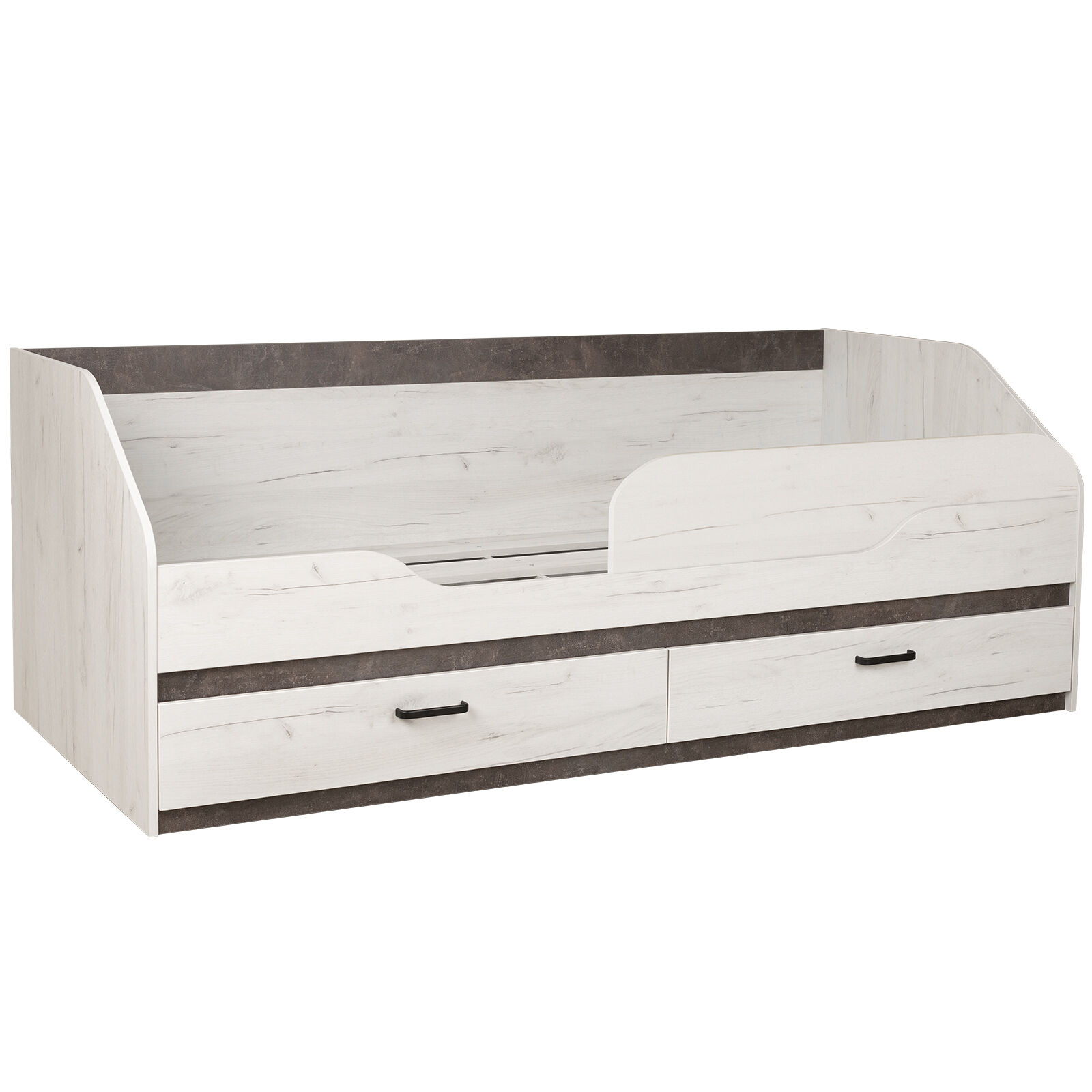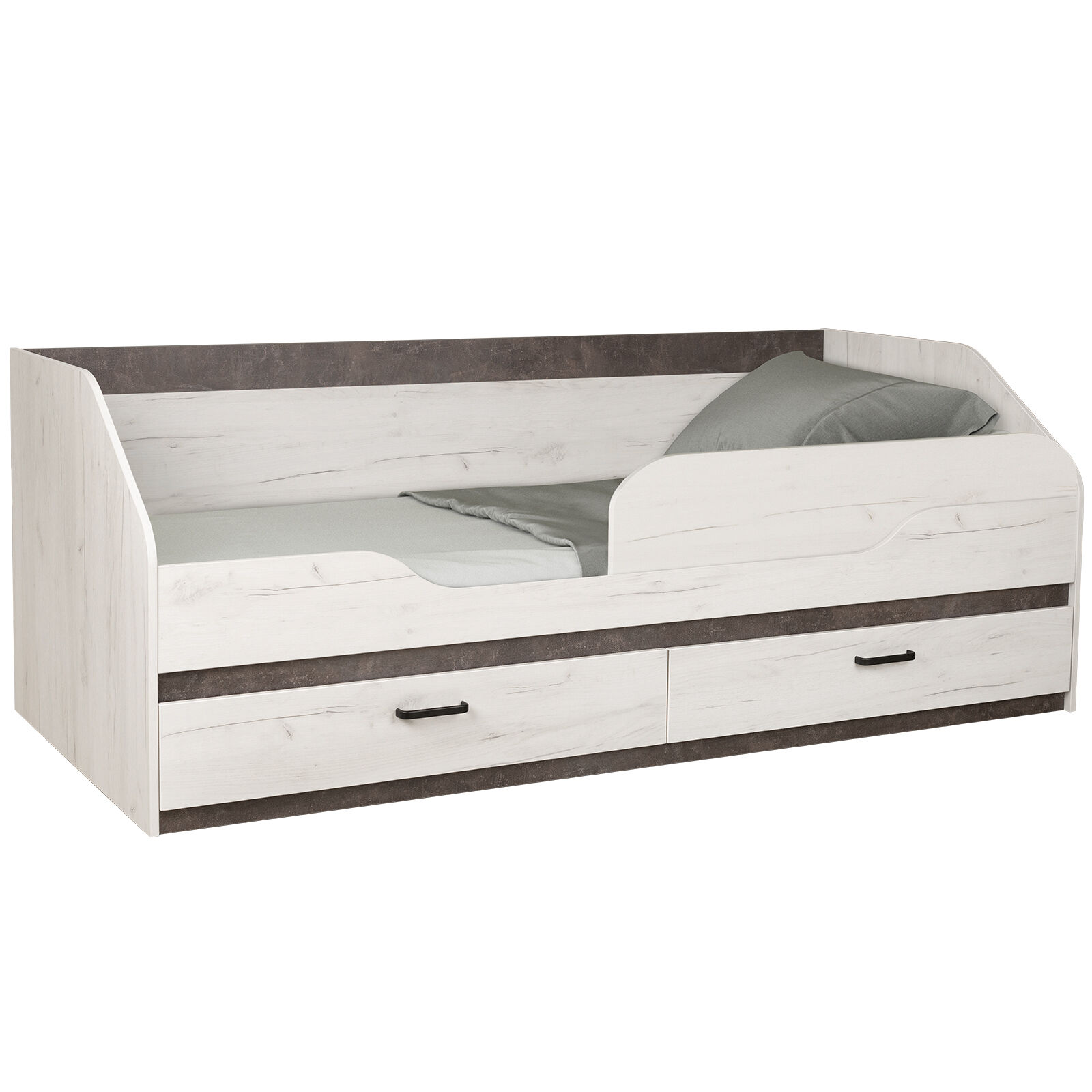 Кровать «Прага 90х200 с ящиками + бортик Прага Дуб белый Крафт-Ателье темное»-прекрасный выбор для интерьера детской спальни. Является элементом сквозной модульный системы «Прага». При создании коллекции был соблюден основной принцип стиля – сочетание простых форм со спокойными, фактурными оттенками. «Матрас в комплект не входит». «Мебель поставляется в разобранном виде».