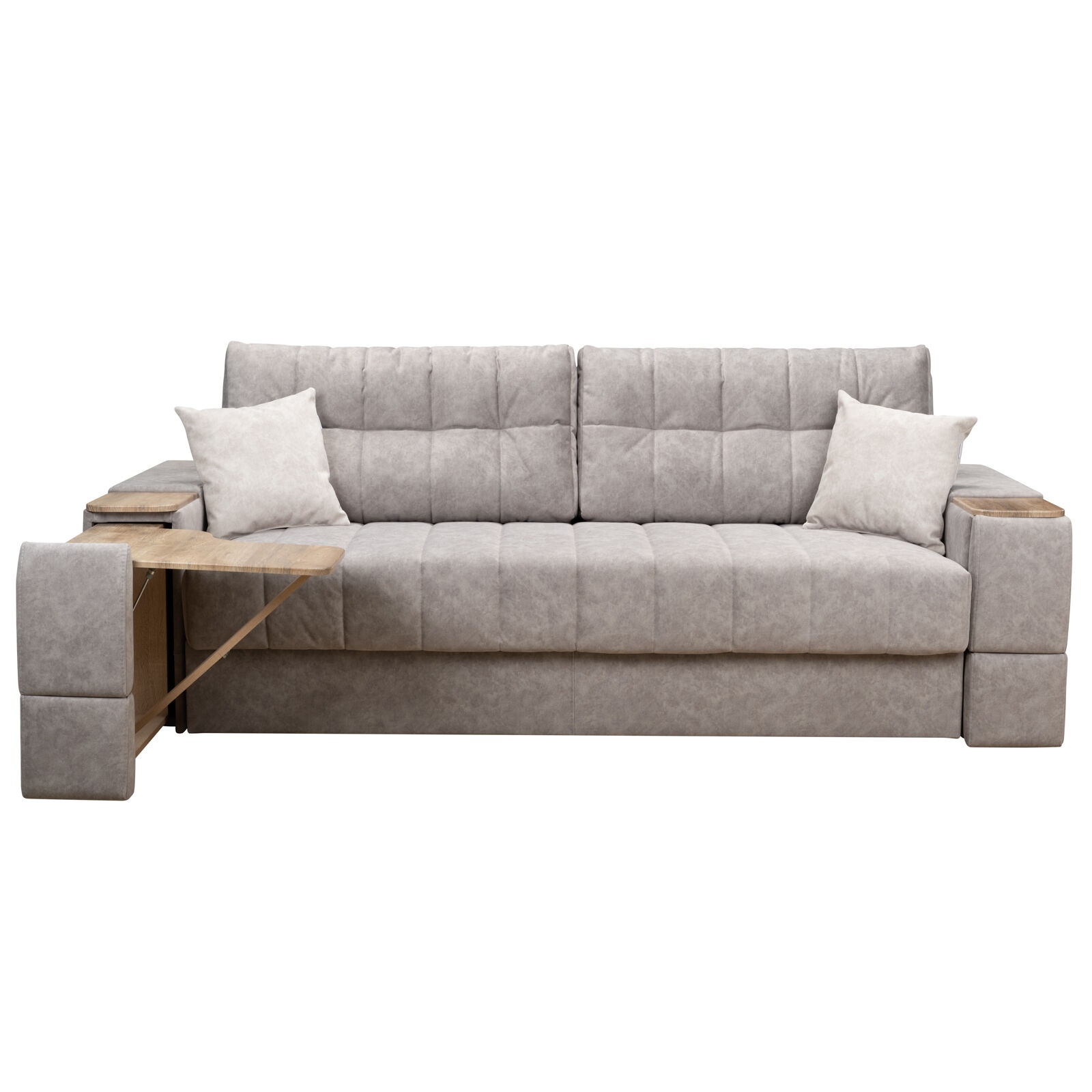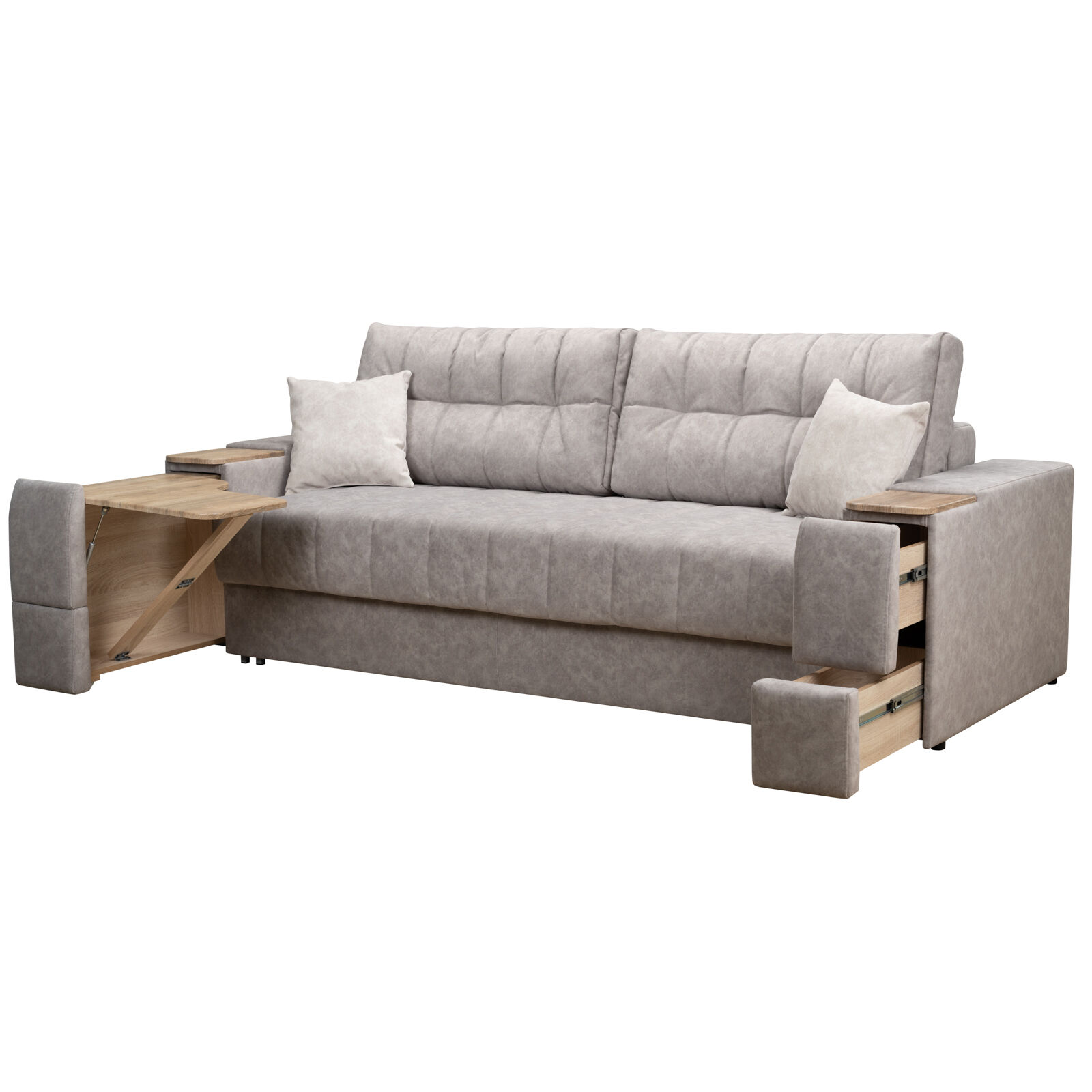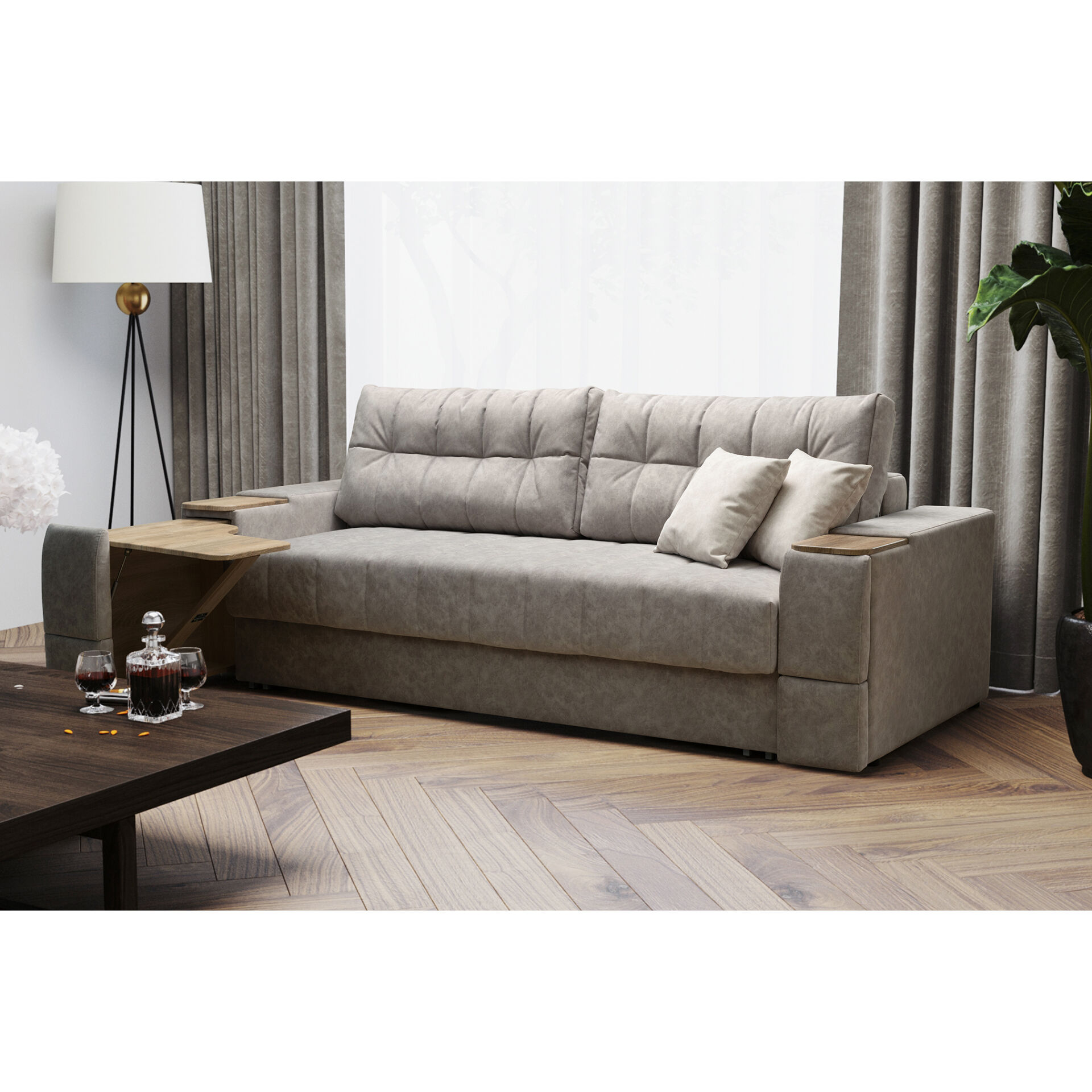 Диван «Камелот 4 БД НПБ-NAPPA 02 Сонома» оснащен выдвижным столиком из подлокотника, что позволяет комфортно отдохнуть после рабочего дня. Другой подлокотник оборудован выдвижными ящиками для хранения различных вещей. Такая мебель значительно экономит пространство в помещении и несомненно делает отдых на диване комфортнее, ведь буквально под рукой есть стол, на который можно поставить бокал, положить книгу или журнал. «Мебель поставляется в разобранном виде».