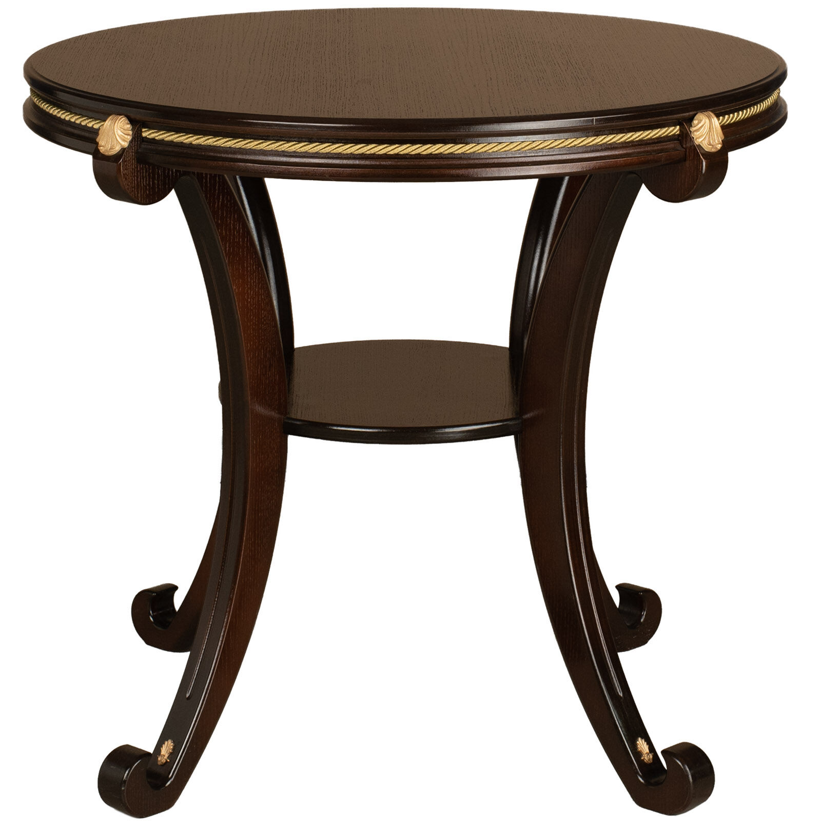 Стол журнальный Глория М - сочетает в себе роскошь, компактность, а также практичность использования. Данная модель не станет лишней в любом помещении, а лишь добавит интерьеру особенного шарма. Декоративные элементы в виде золотистого витого шнура по периметру окружности и барельефные вставки того же цвета гармонично смотрятся и эффектно дополняют журнальный столик Глория М.