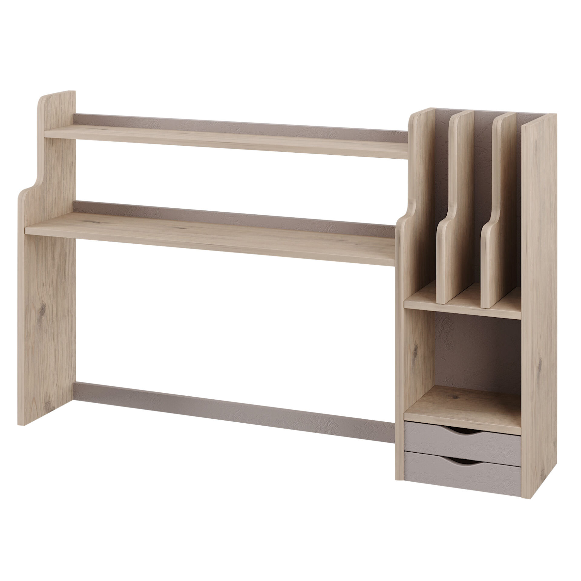 Два небольших ящичка, открытые полки и ниши стеллажа-надстройки к модулю Nature 84 Cтол письменный помогут организовать рабочее место так, чтобы все было под рукой. Надстройка с фигурными закругленными краями может собираться на правую и левую сторону из одного комплекта деталей. «Мебель поставляется в разобранном виде».
