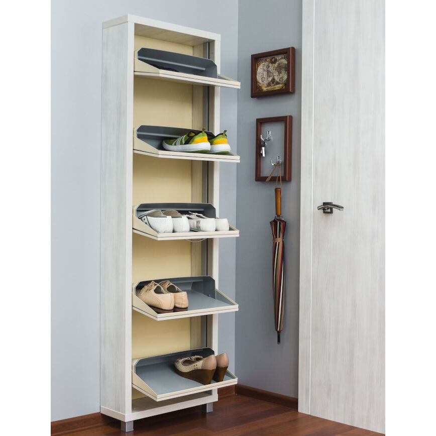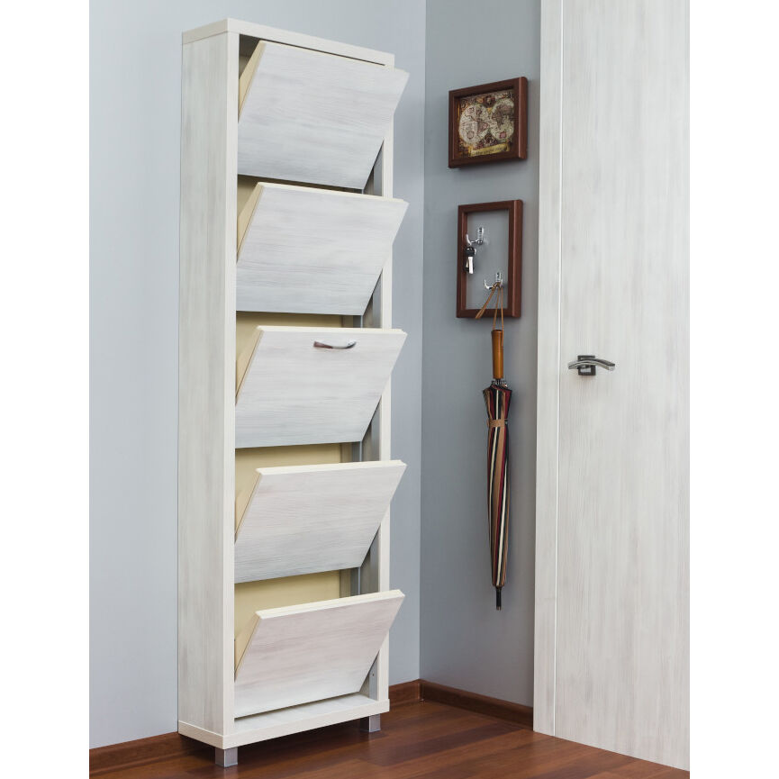 Узкий обувной шкаф «Айрон Люкс 5 выбеленное дерево» с пятью откидными секциями вмещает целых 10 пар обуви, занимая при этом минимум места. Корпус модели выполнен из высококачественного ЛДСП и усилен металлическими ребрами жесткости. Они служат надежной основой для крепления системы полок из оцинкованного листа с защитным полимерным покрытием. Благодаря веерному механизму трансформации секции синхронно открываются и выдвигаются вперед, что обеспечивает удобство в использовании. Возможна фиксация к стене при помощи дюбель-саморезов через технологические отверстия в верхней части.