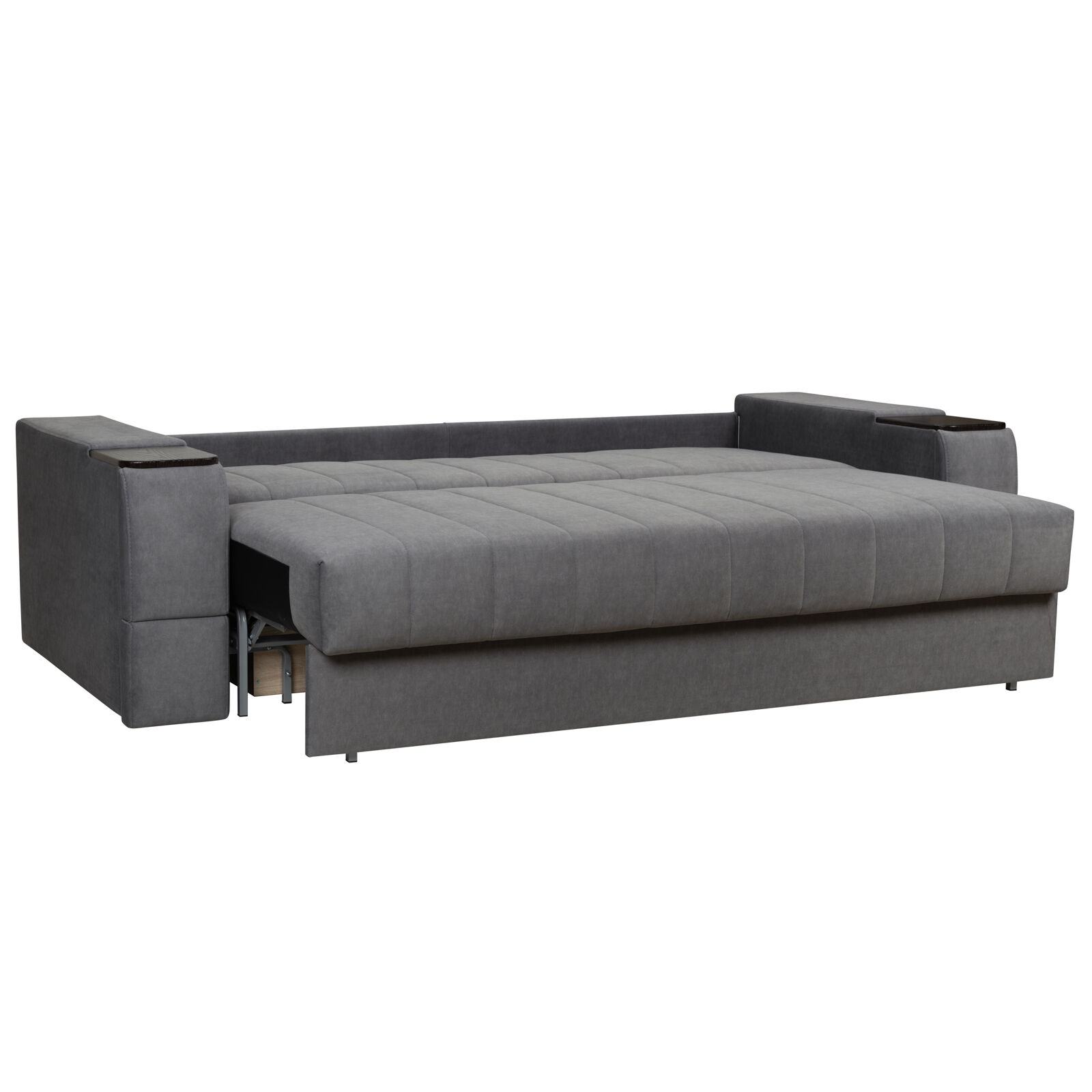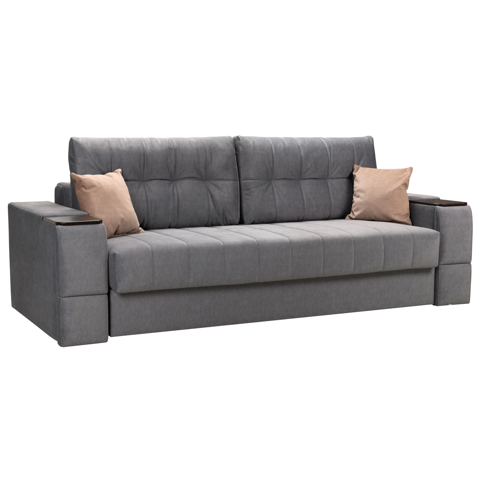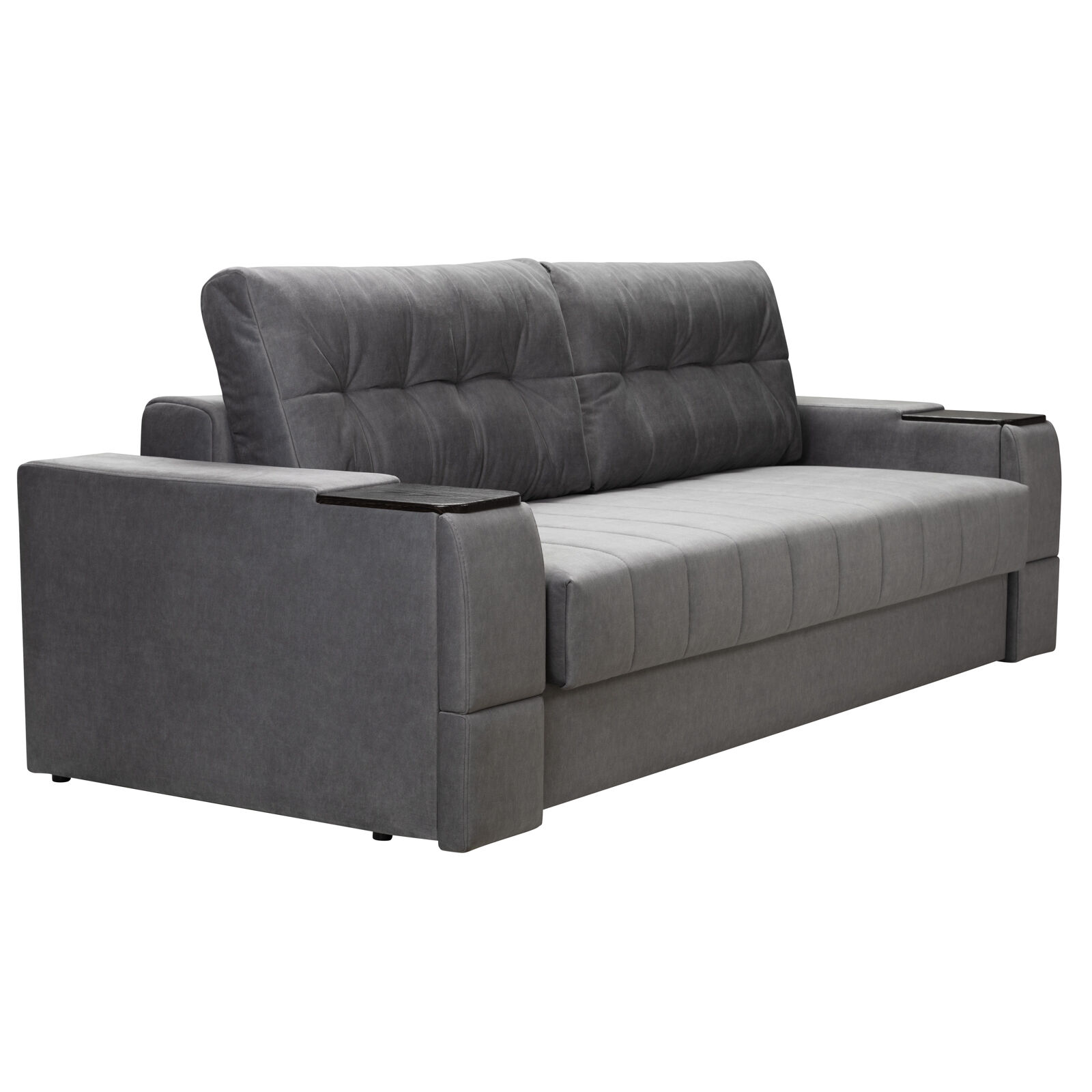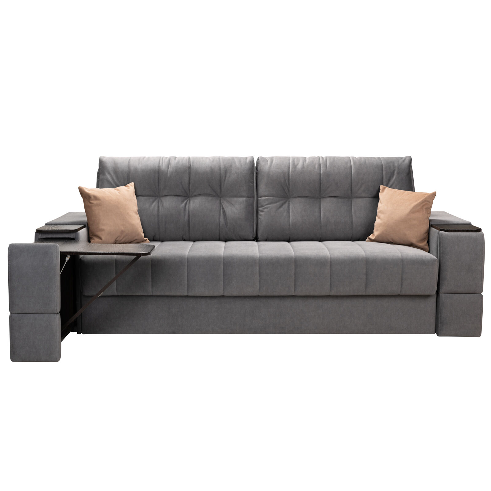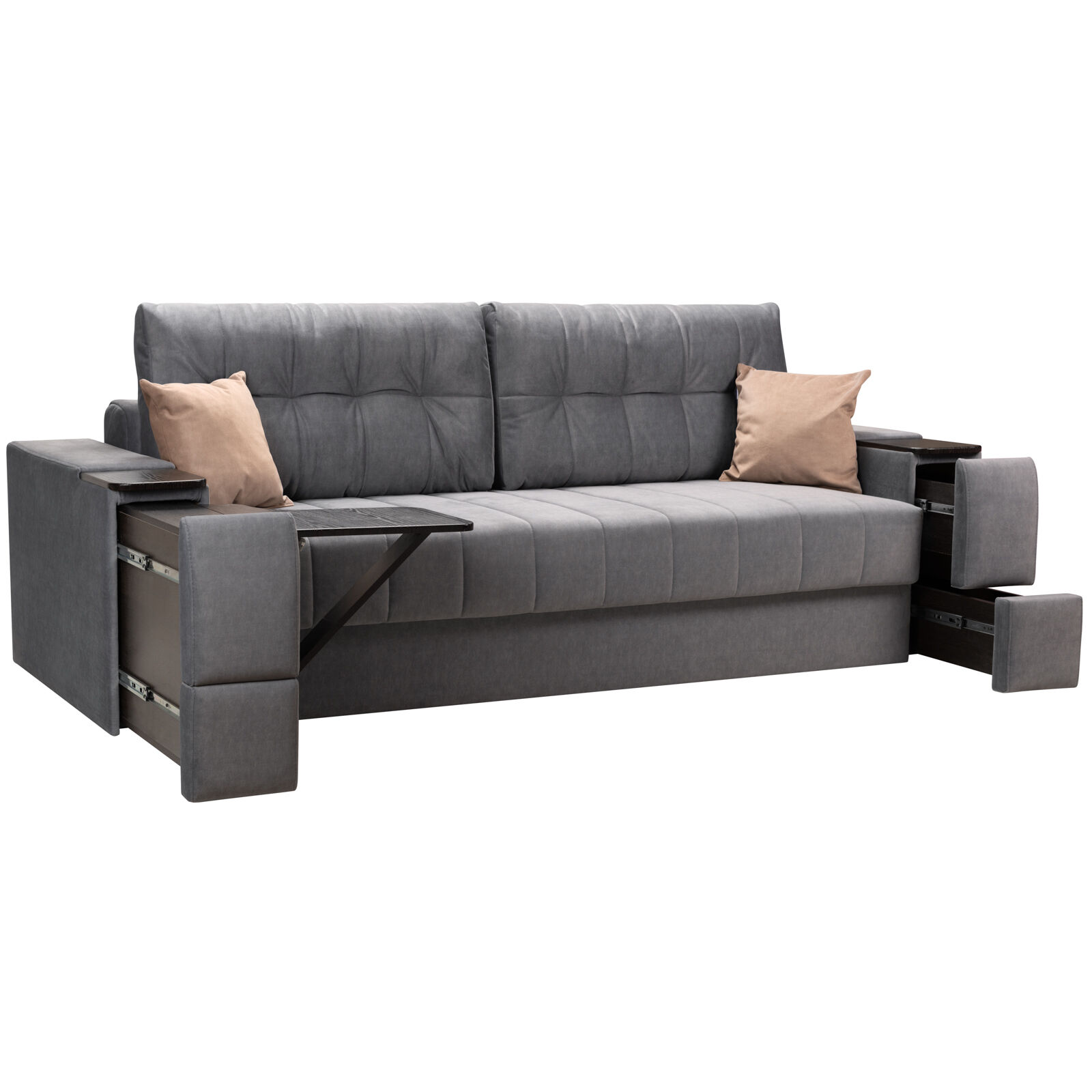 Диван Камелот 4 БД НПБ ELEFANT 11 Венге. Оснащен выдвижным столиком из подлокотника, что позволяет комфортно отдохнуть после рабочего дня. Другой подлокотник оборудован выдвижными ящиками для хранения различных вещей. Такая мебель значительно экономит пространство в помещении и несомненно делает отдых на диване комфортнее, ведь буквально под рукой есть стол, на который можно поставить бокал, положить книгу или журнал. «Мебель поставляется в разобранном виде».