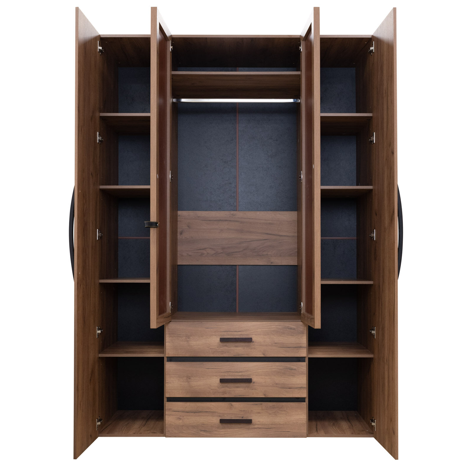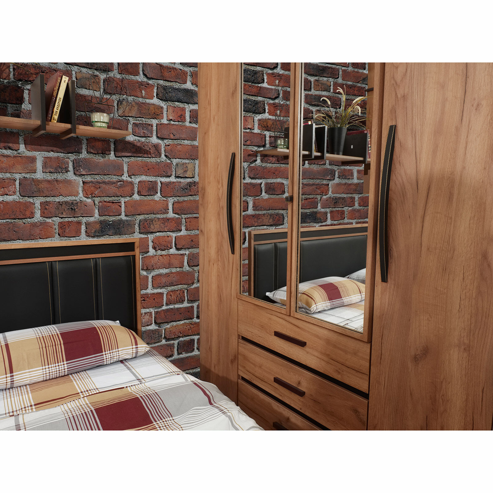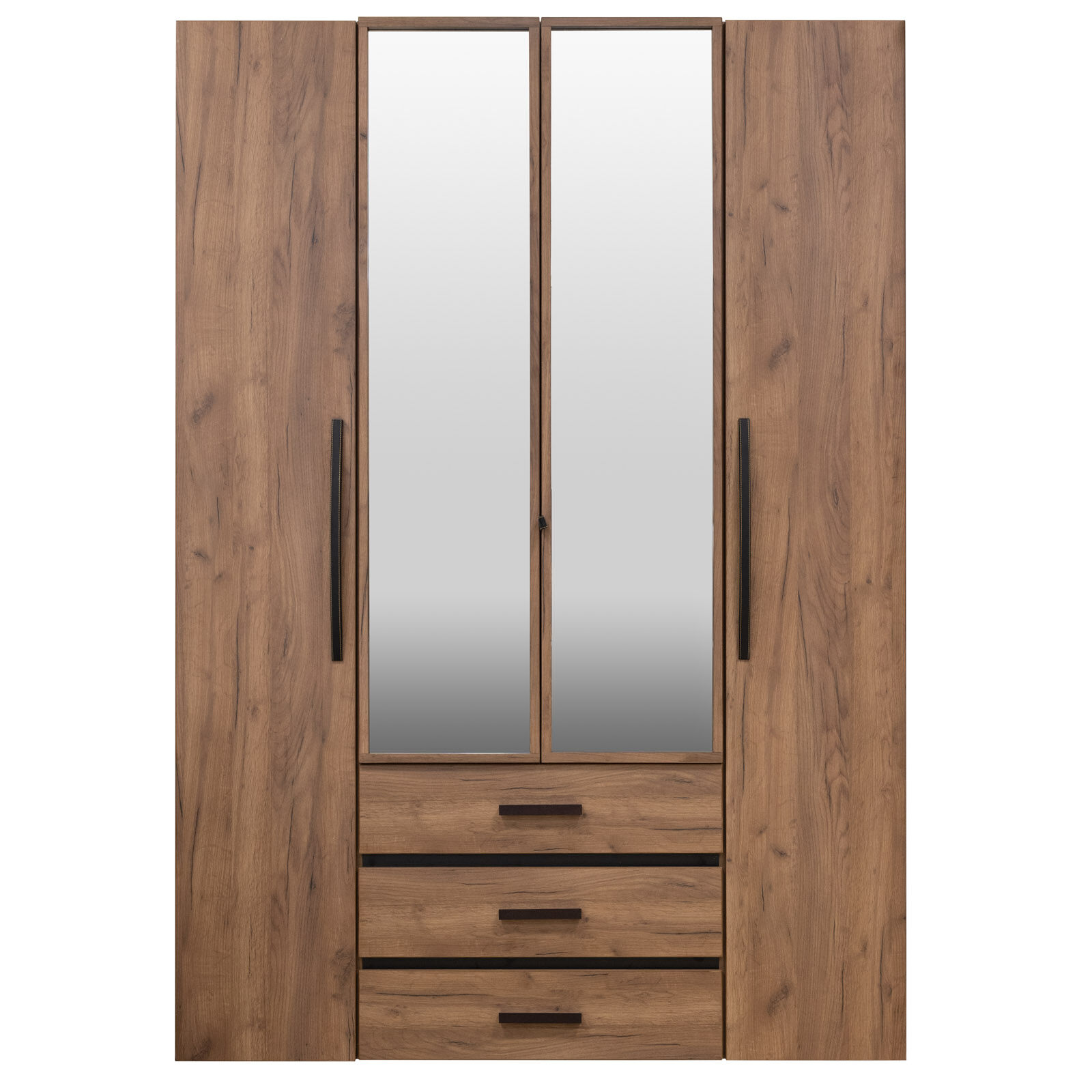 Вместительный распашной шкаф с 2-мя зеркальными фасадами прекрасно подойдет в небольшую спальню. За глухими фасадами скрываются отделения с 4-мя полками. Внутри шкафа, за зеркальными дверями, закреплена стационарная штанга (777 мм). Три выкатных ящика с глубиной 40 см, оснащены шариковыми направляющими полного выдвижения. «Мебель поставляется в разобранном виде».