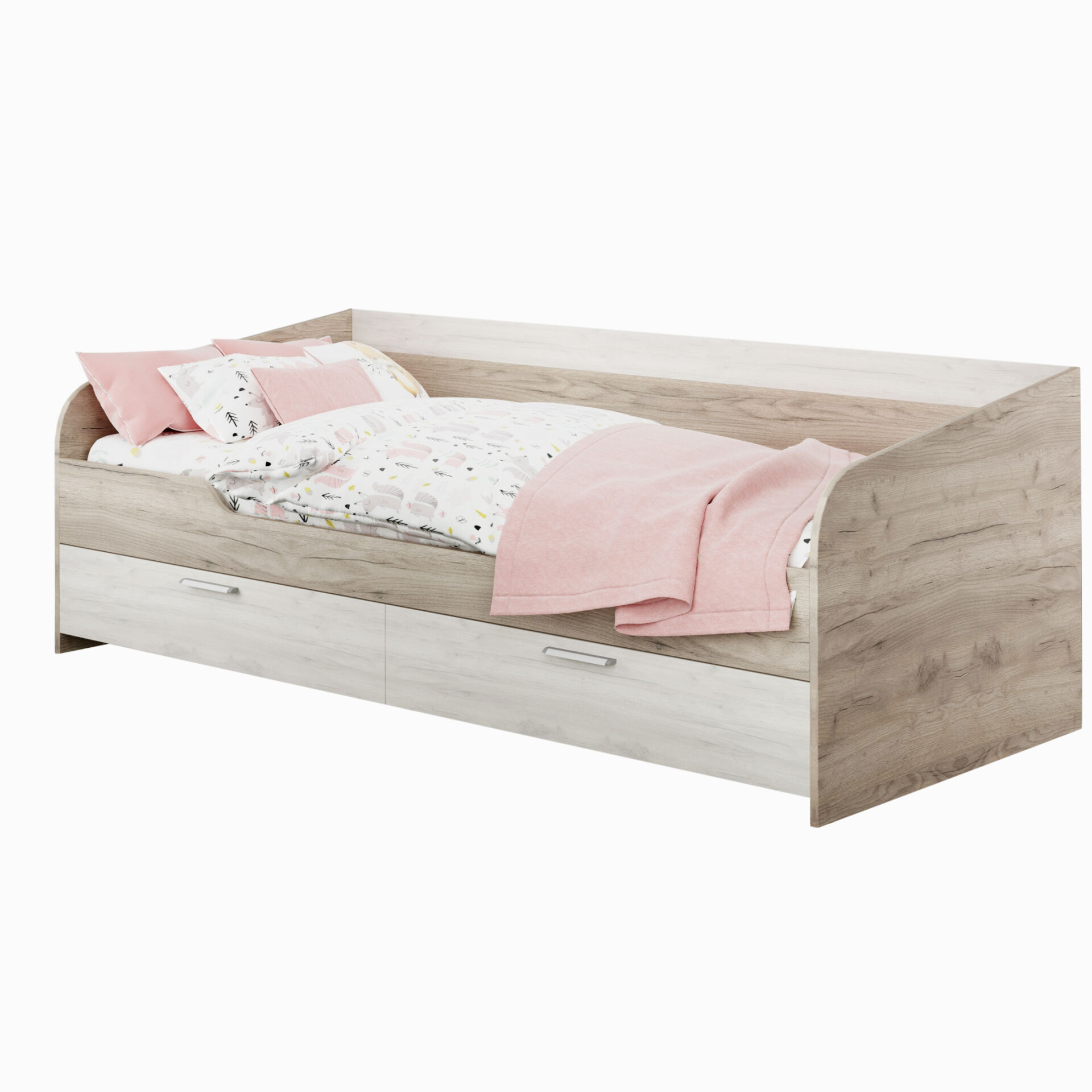 Кровать с ящиками Лацио Дуб Серый Крафт-Дуб Белый Крафт. Натуральный оттенок дуба белого крафта визуально расширяет пространство, создавая ощущение воздушности, а серый крафт – добавляет ощущение домашнего уюта. «Мебель поставляется в разобранном виде»