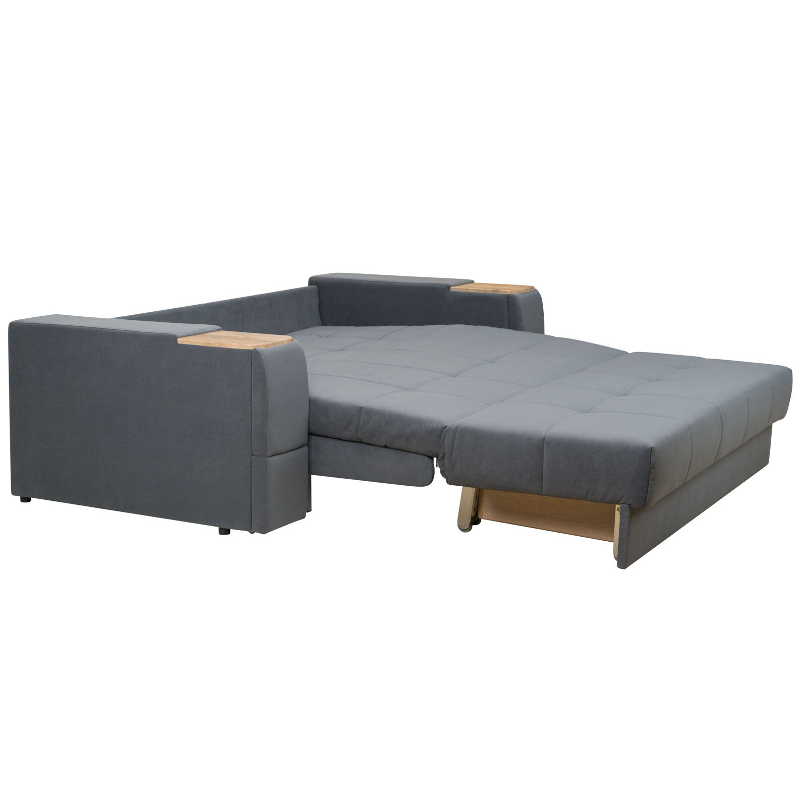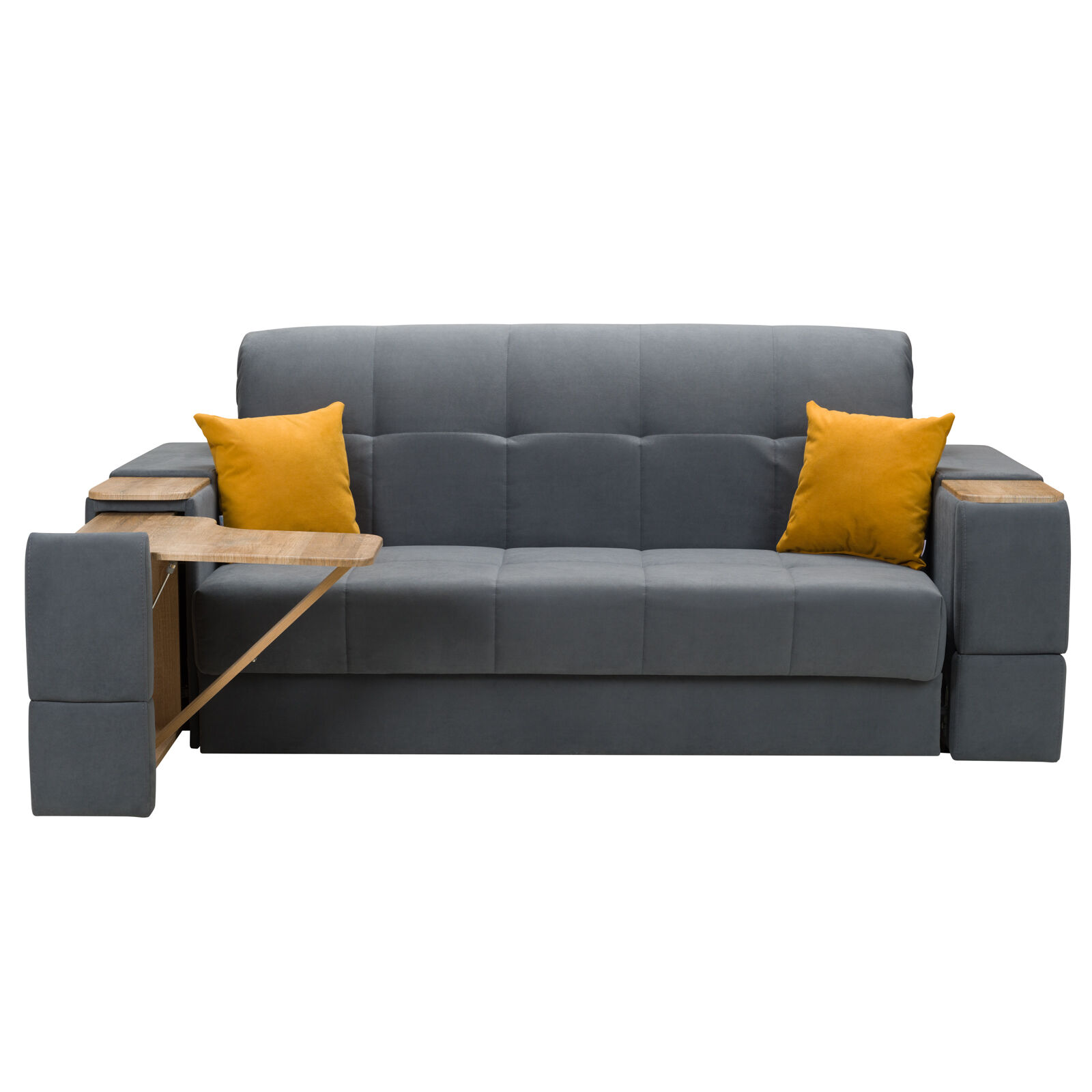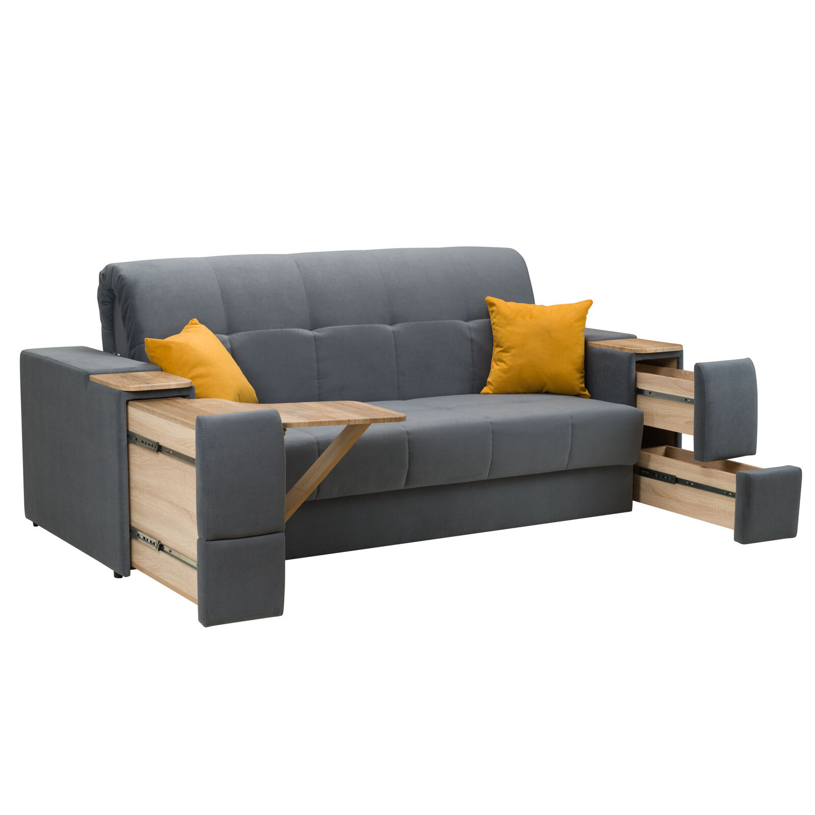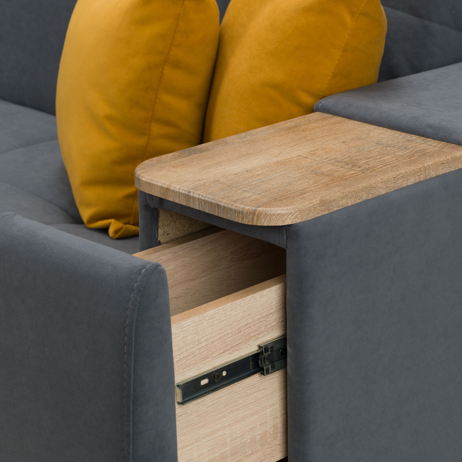 Диван Токио 4 БД №165 ППУ MODUS 23 MODUS 12 Дуб Сонома, оснащен выдвижным столиком из подлокотника, что позволяет комфортно отдохнуть после рабочего дня. Другой подлокотник оборудован выдвижными ящиками для хранения различных вещей. Такая мебель значительно экономит пространство в помещении и несомненно делает отдых на диване комфортнее, ведь буквально под рукой есть стол, на который можно поставить бокал, положить книгу или журнал. «Мебель поставляется в разобранном виде».