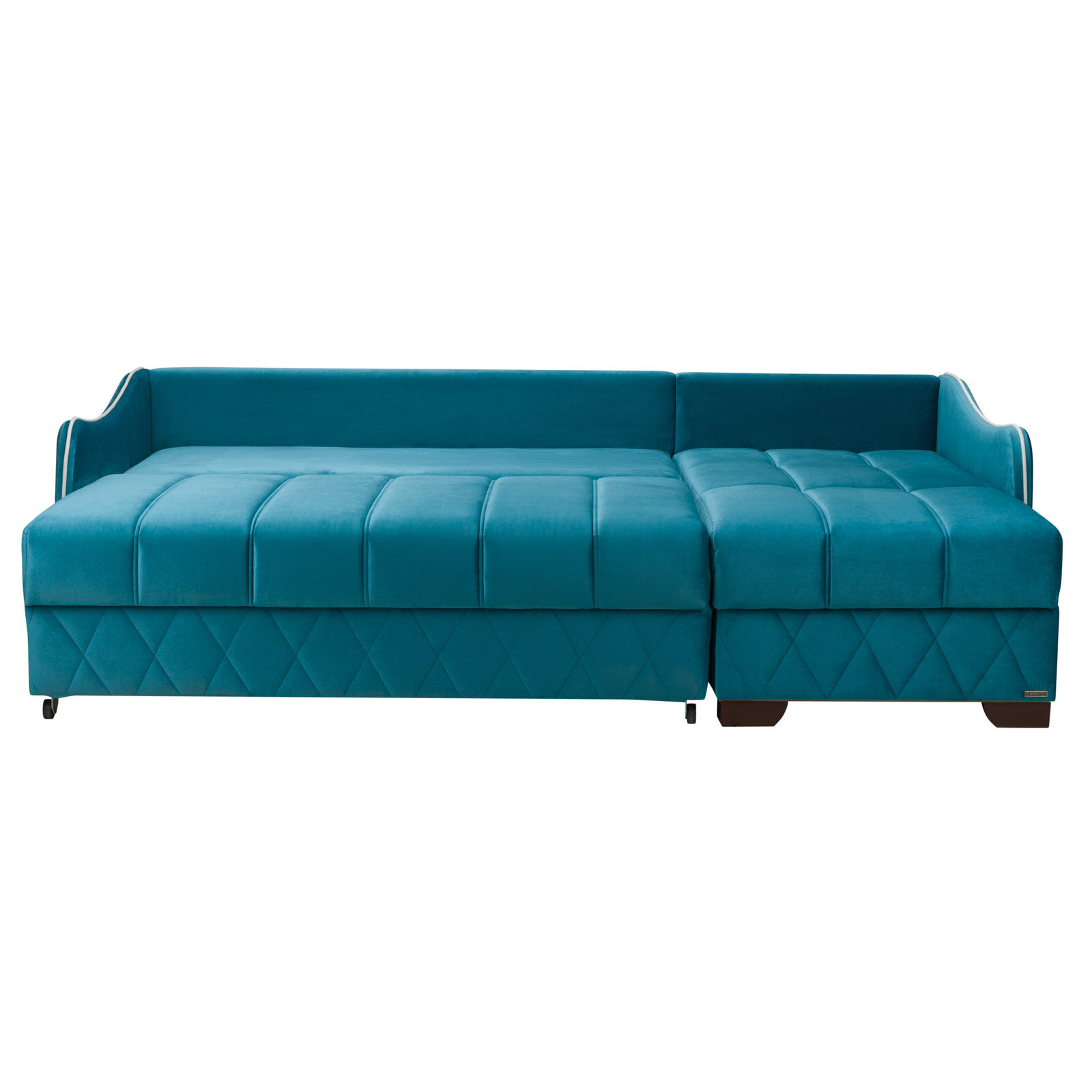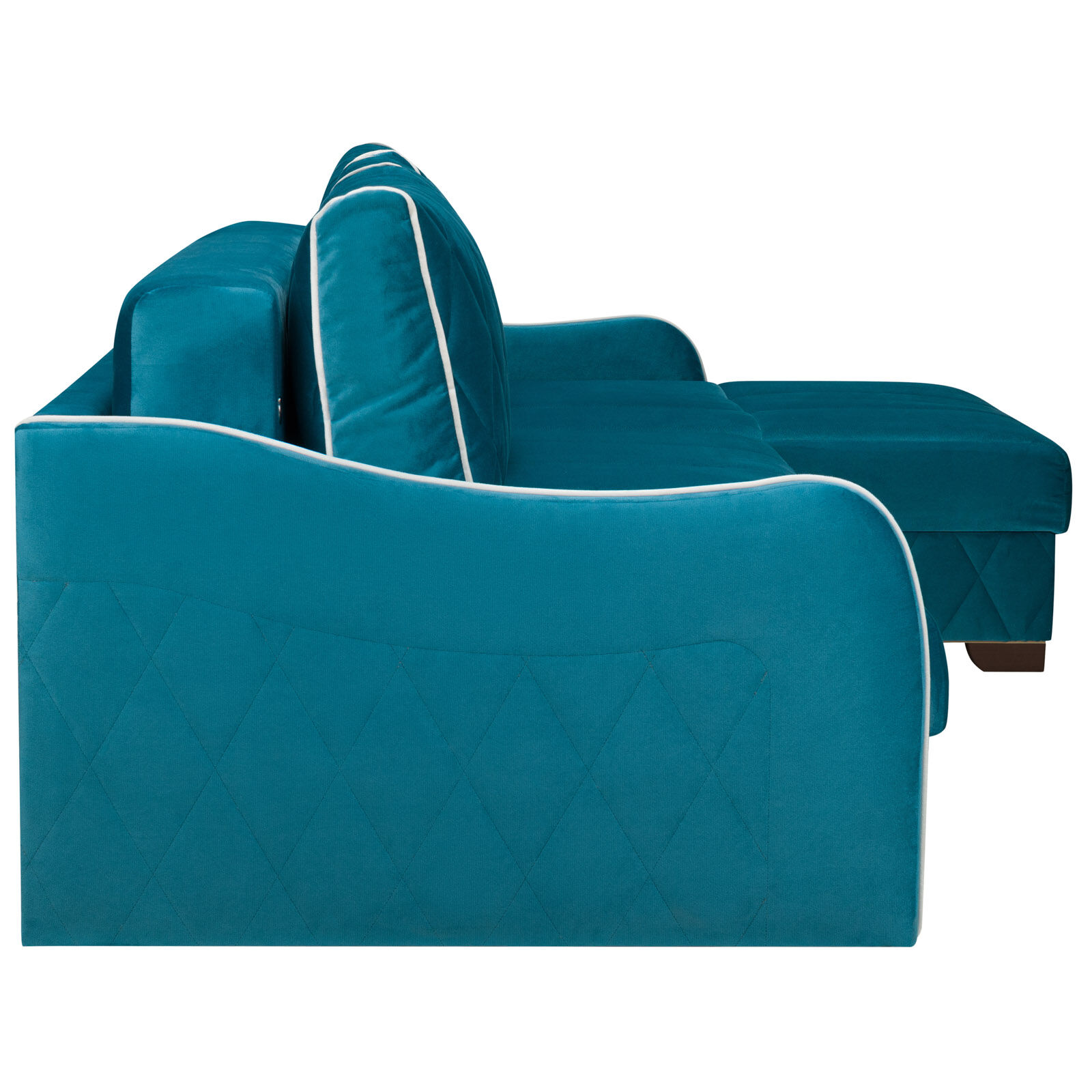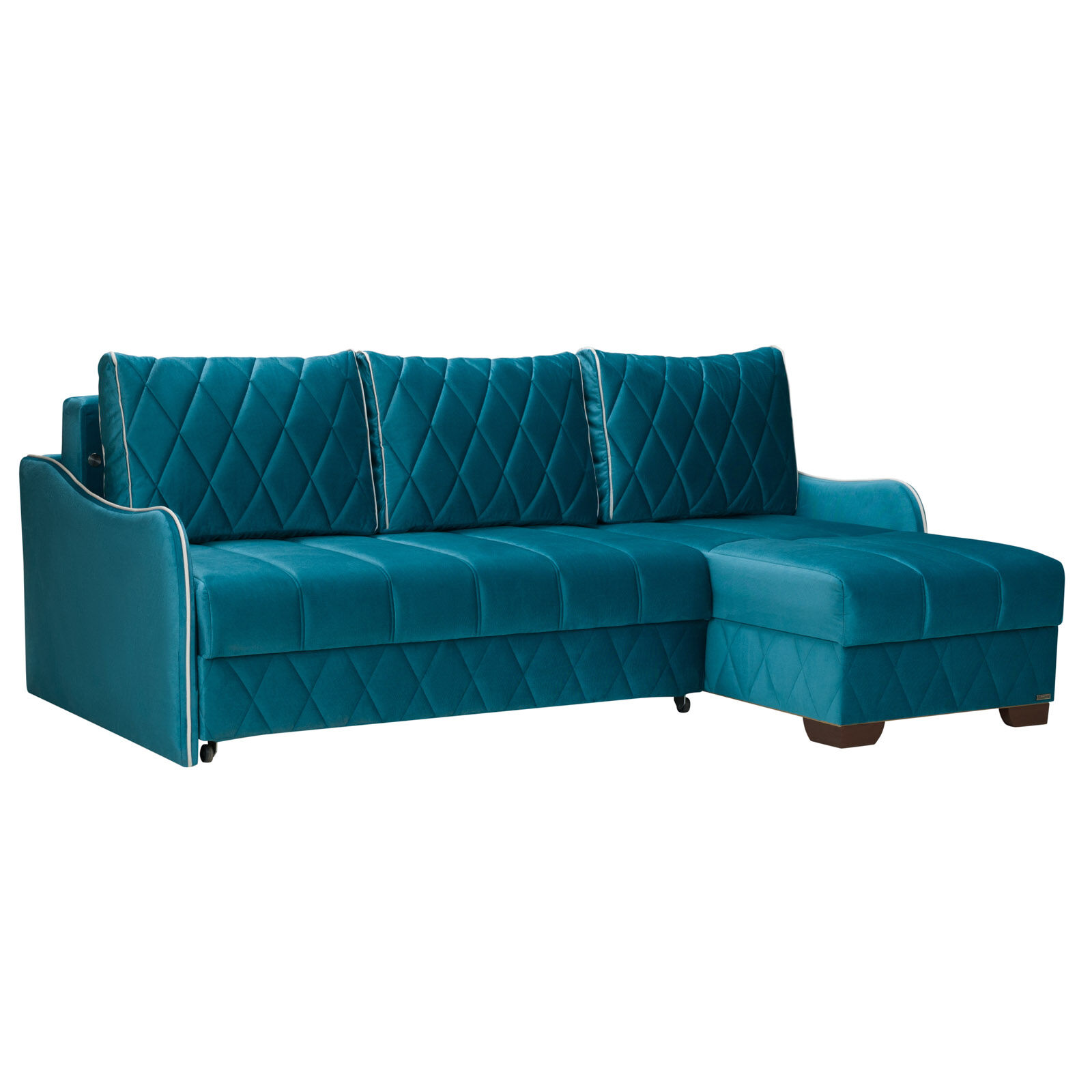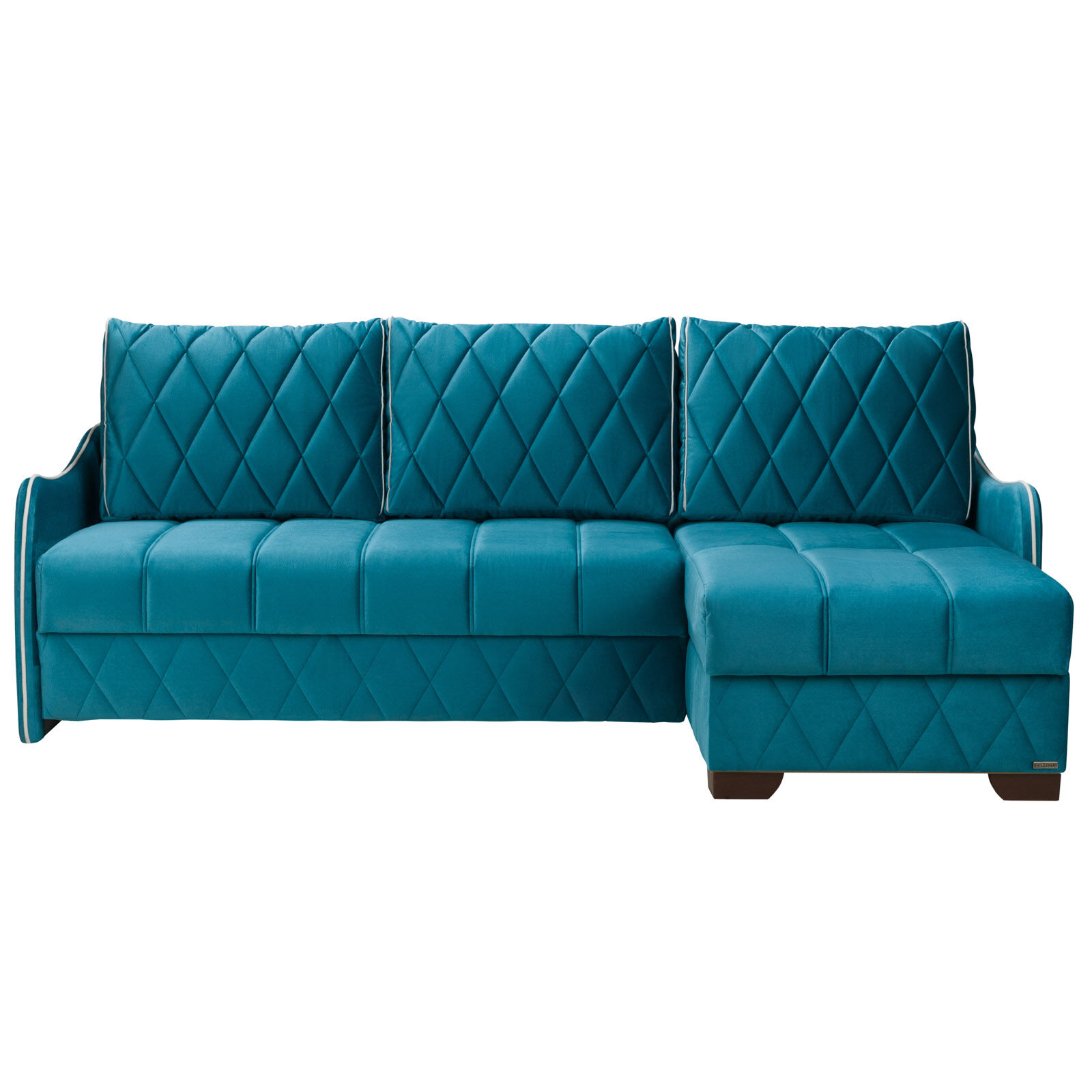 Диван-кровать угловой ORION-01 на основе пружинного блока «BONEL» укомплектован тремя подушками с декоративной стежкой и опорной подушкой для спинки кушетки. Механизм трансформации: Еврокнижка.