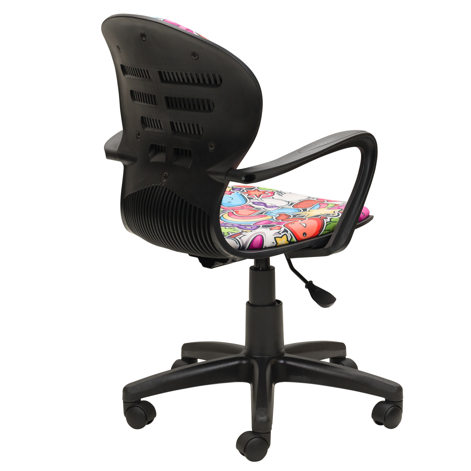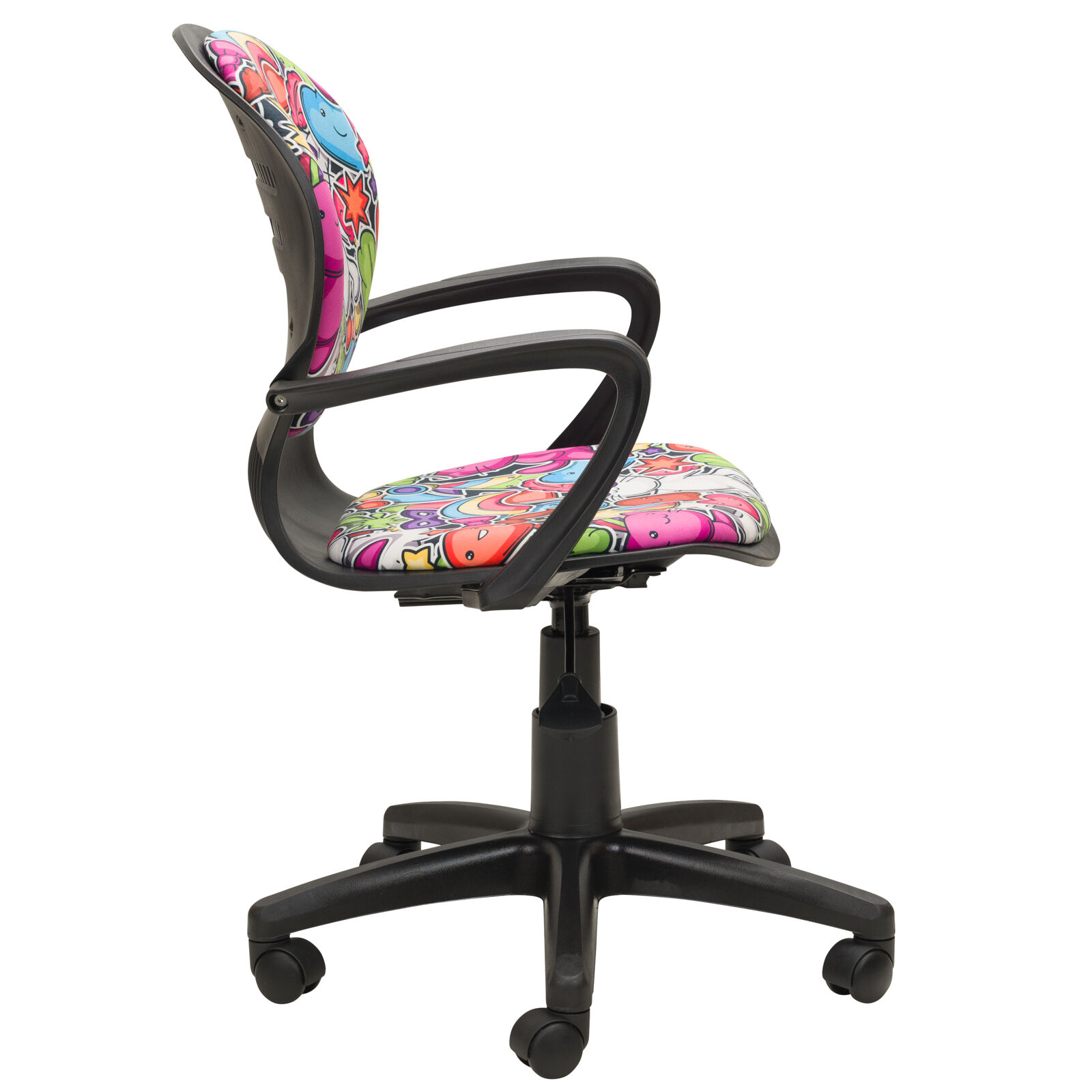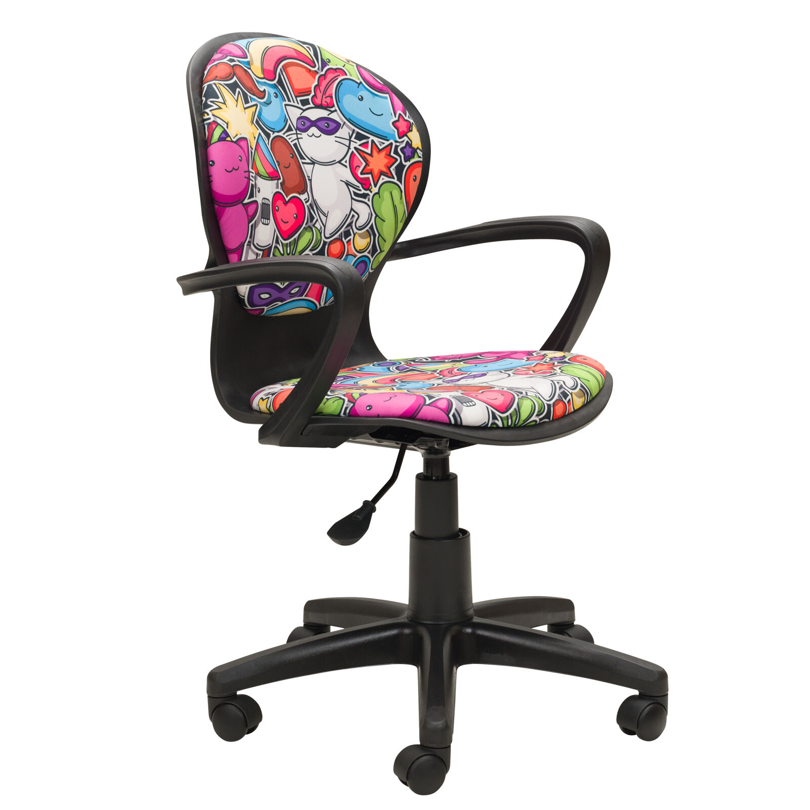Кресло компьютерное детское «РК 14 черный пластик Детство Маскарад». Механизм качания TopGun. Цельнолитая крестовина из пластика. Пластиковые подлокотники. Газпатрон 3-й категории стабильности по DIN 4550. Ролики стандарт BIFMA 5.1 (США), диаметр штока 11 мм, материал - нейлон. «Мебель поставляется в разобранном виде».