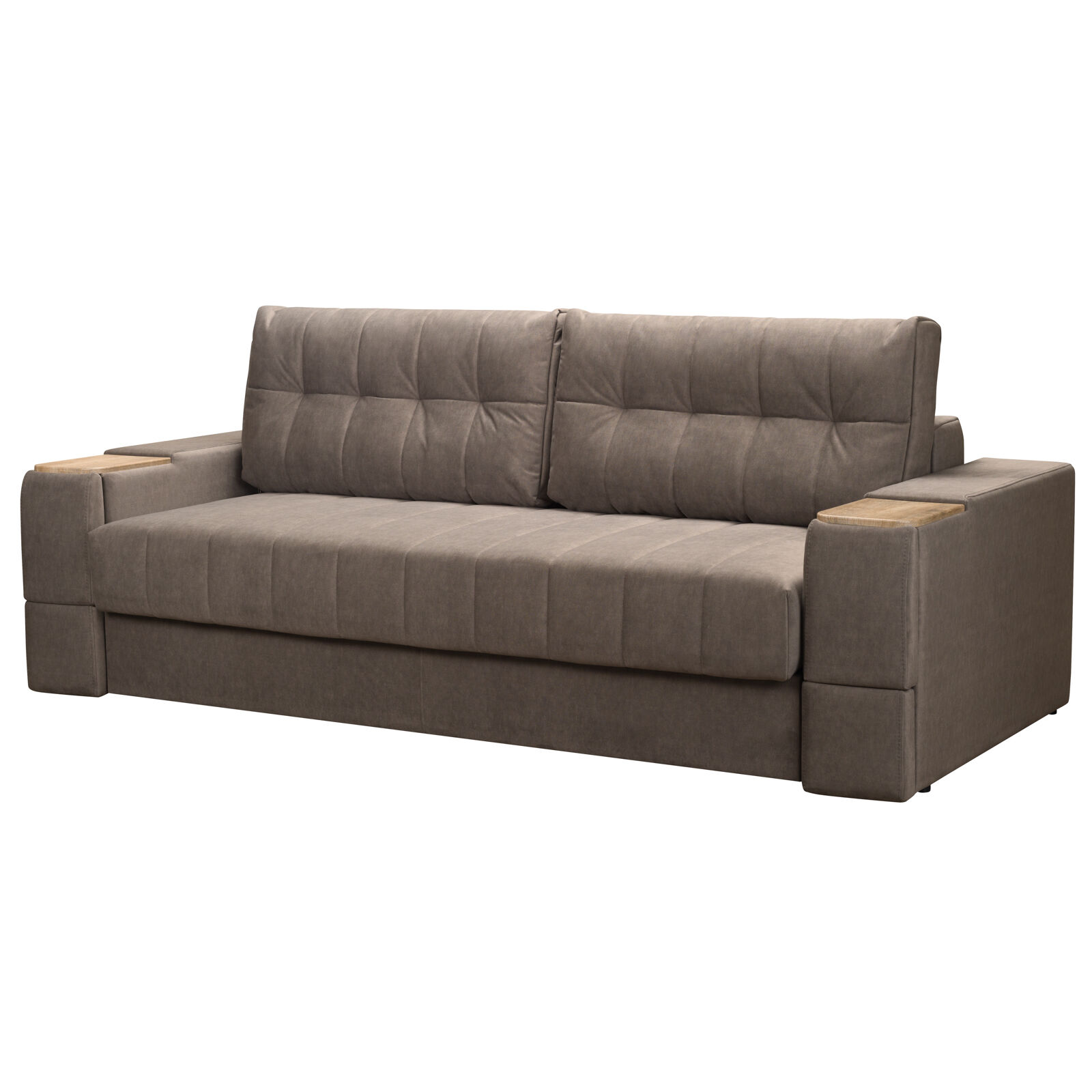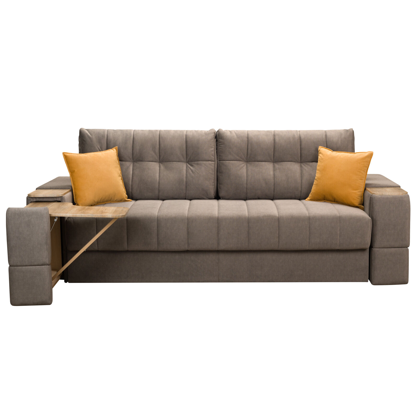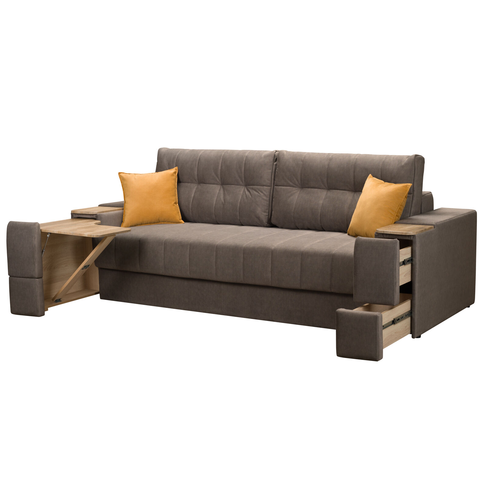 Диван Камелот 4 БД НПБ ELEFANT 06 Сонома. Оснащен выдвижным столиком из подлокотника, что позволяет комфортно отдохнуть после рабочего дня. Другой подлокотник оборудован выдвижными ящиками для хранения различных вещей. Такая мебель значительно экономит пространство в помещении и несомненно делает отдых на диване комфортнее, ведь буквально под рукой есть стол, на который можно поставить бокал, положить книгу или журнал. «Мебель поставляется в разобранном виде».