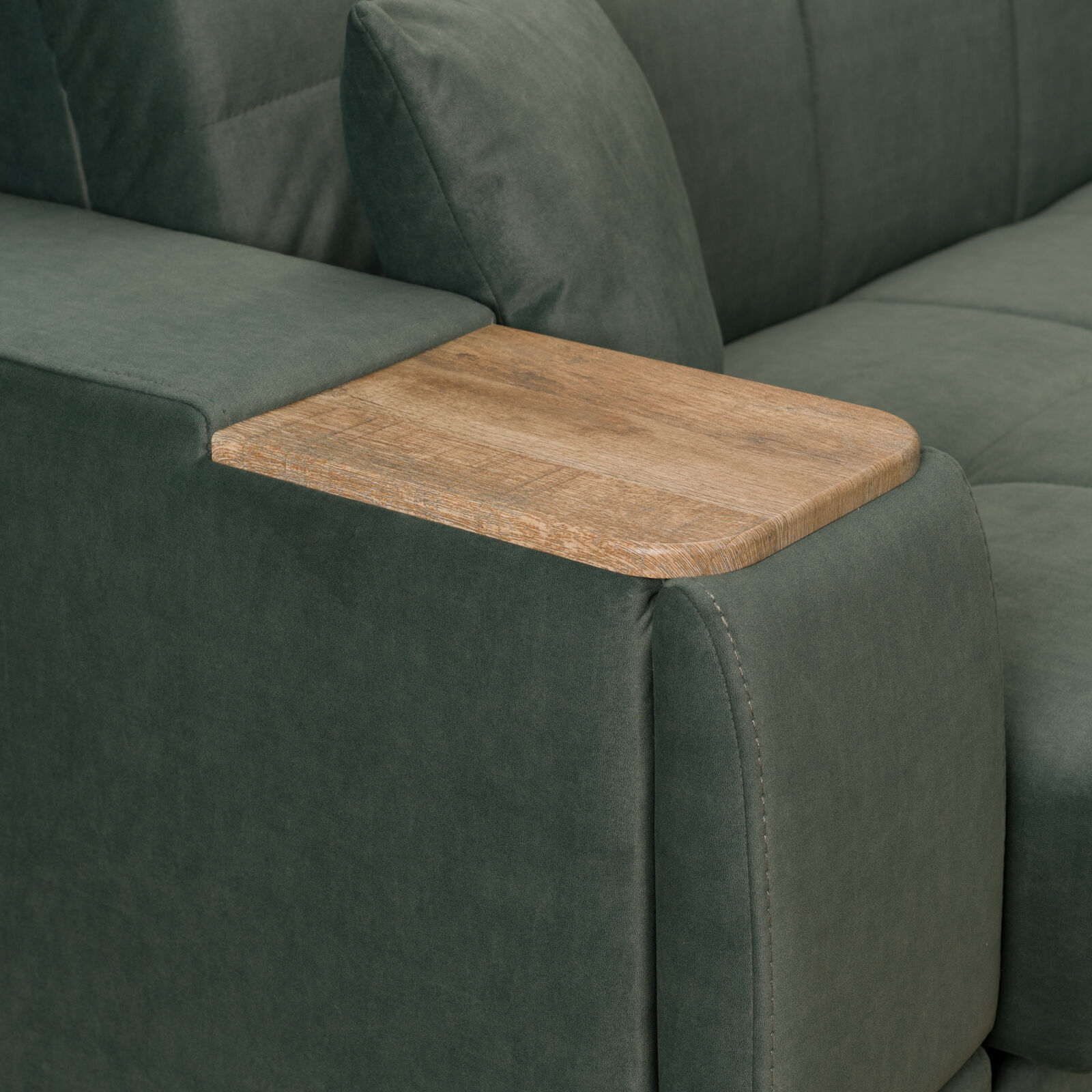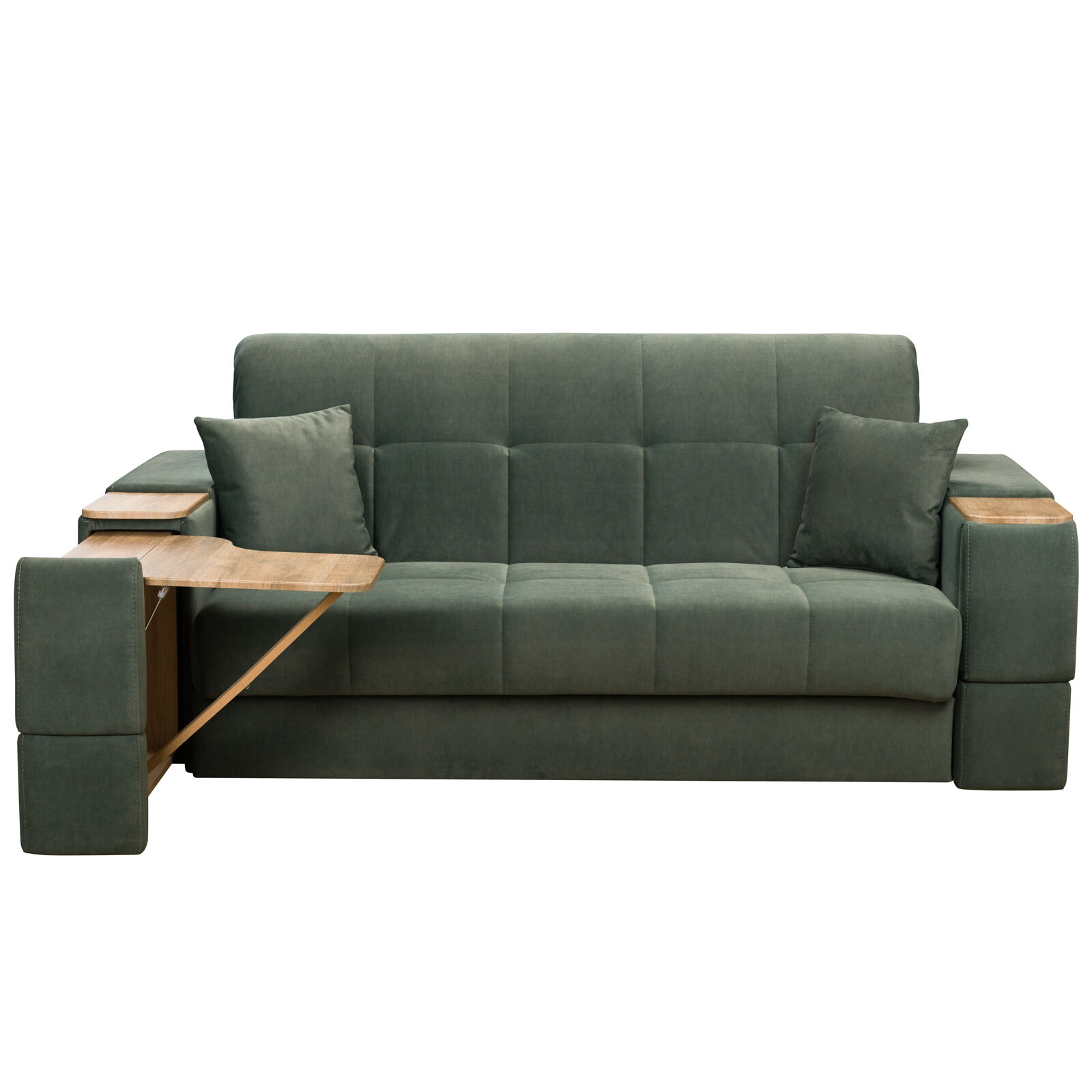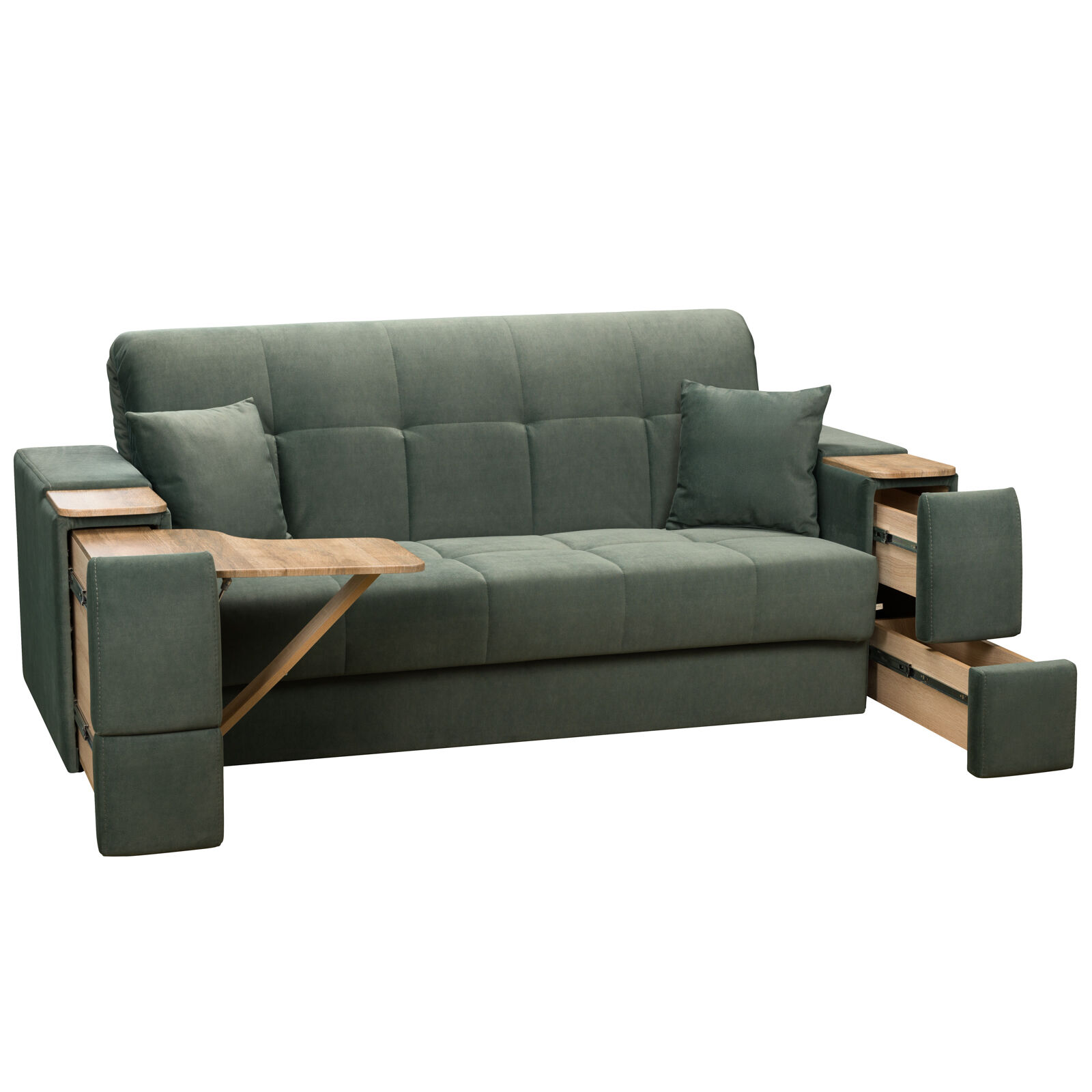 Диван Токио 4 БД №165 ELEFANT 09 Дуб Сонома. Оснащен выдвижным столиком из подлокотника, что позволяет комфортно отдохнуть после рабочего дня. Другой подлокотник оборудован выдвижными ящиками для хранения различных вещей. «Мебель поставляется в разобранном виде».