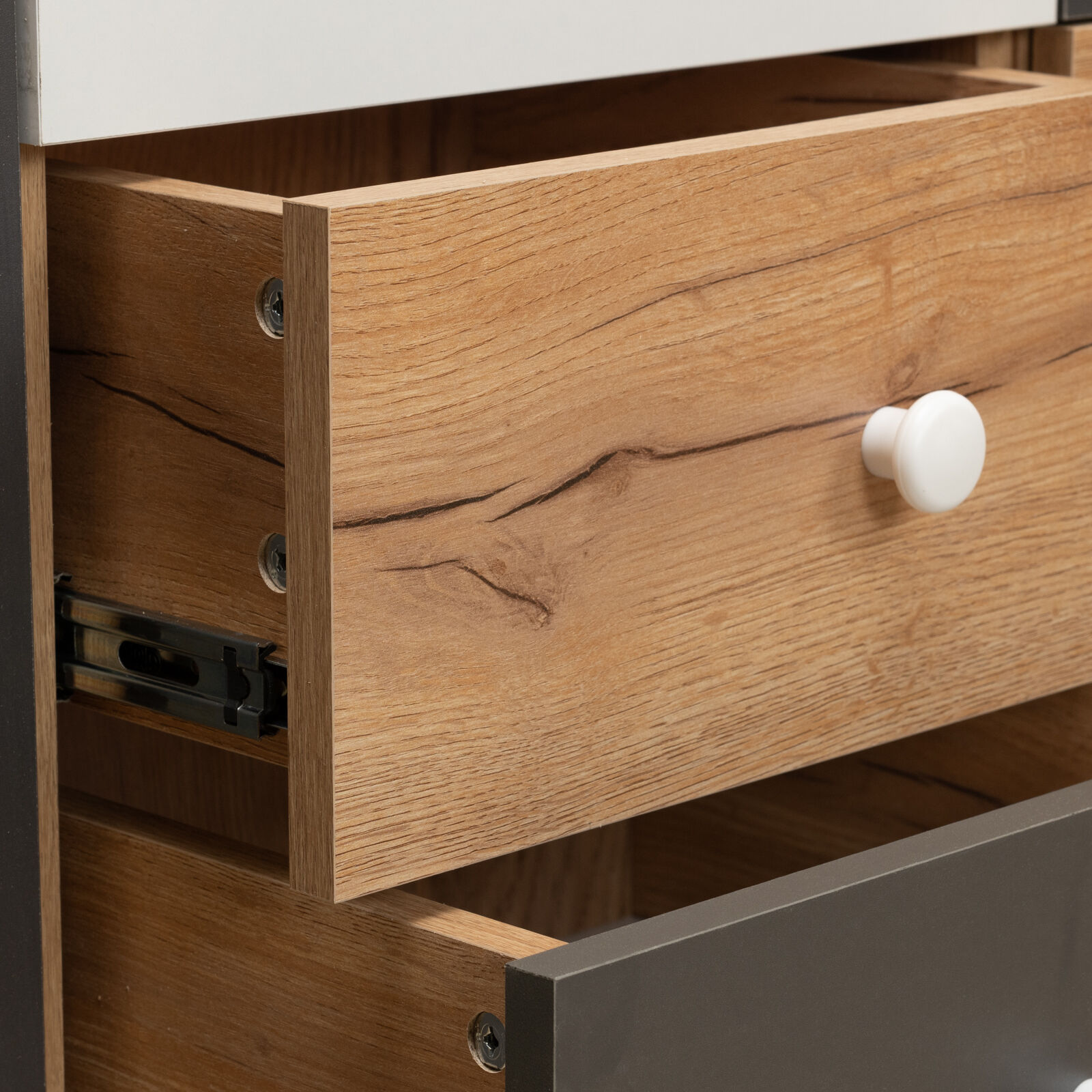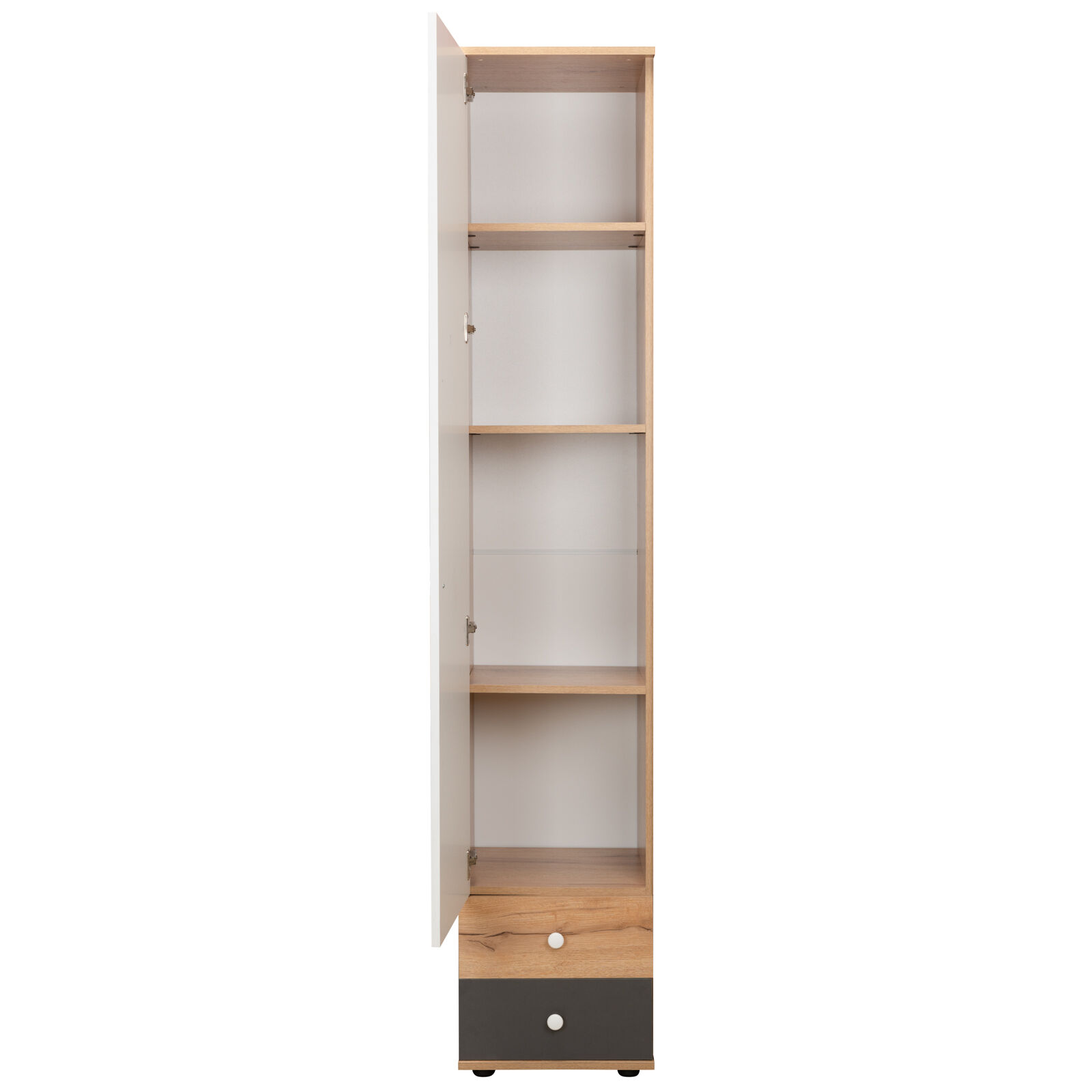 Шкаф для белья «Лойс 83 Дуб золотистый Белый фасад» его конструкция предусматривает наличие трех регулируемых по высоте полок и двух выдвижных ящиков. Ящики оснащены шариковыми направляющими полного выдвижения и выдерживают нагрузку до 10 кг. «Мебель поставляется в разобранном виде».