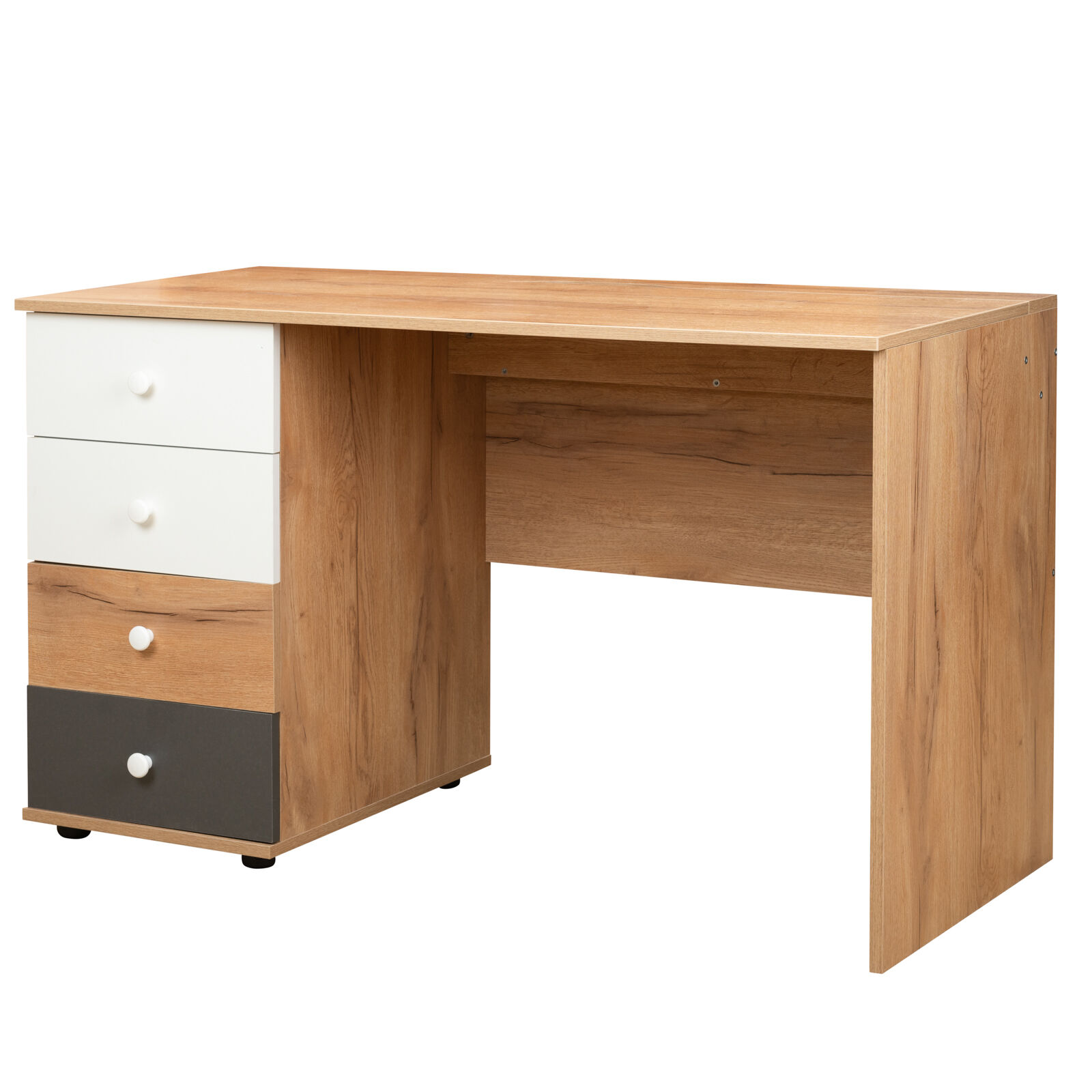 Стол письменный «Лойс 84 Дуб золотистый Белый Графит» отличается нестандартным решением для столешницы, которая максимально адаптирована для потребностей современных детей и работе на компьютере. Под откидной её частью, которая открывается за плавный вырез, прячется ниша для хранения и отверстие с заглушкой для вывода проводов, чтобы они не запутывались и не мешали ребенку. Если ребенок ещё не занимается за компьютером, то нишу можно использовать и для размещения органайзеров с карандашами, фломастерами и красками, чтобы они не отвлекали от творчества. Дополняют стол ящики на шариковых направляющих. За счет просторной рабочей поверхности, а также возможности левосторонней и правосторонней сборки 84 Стол письменный одинаково удобен как для левши, так и для правши. «Мебель поставляется в разобранном виде»