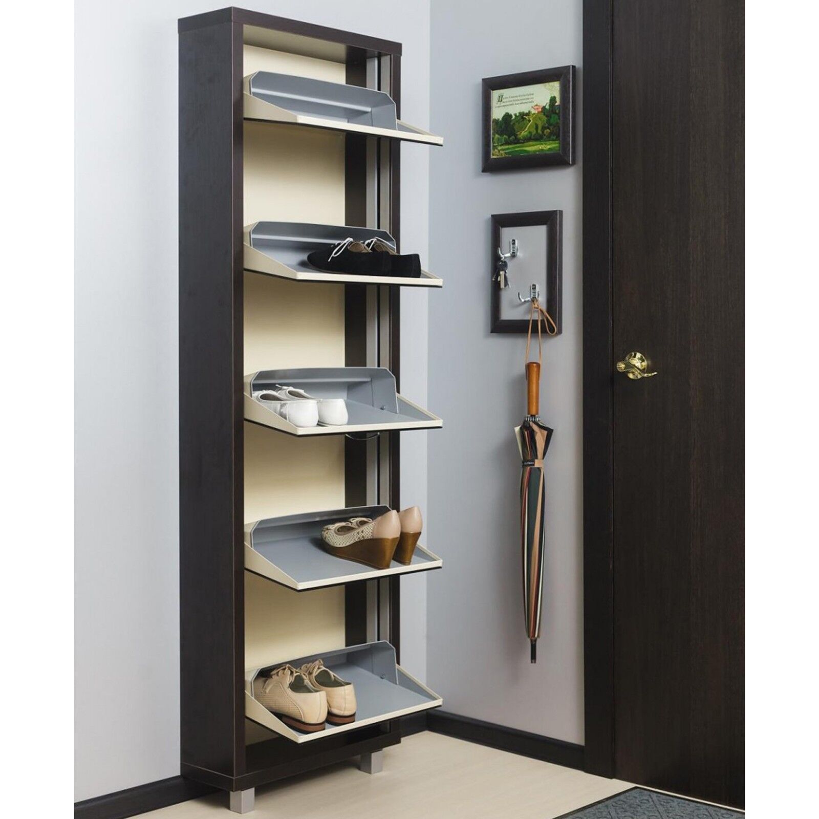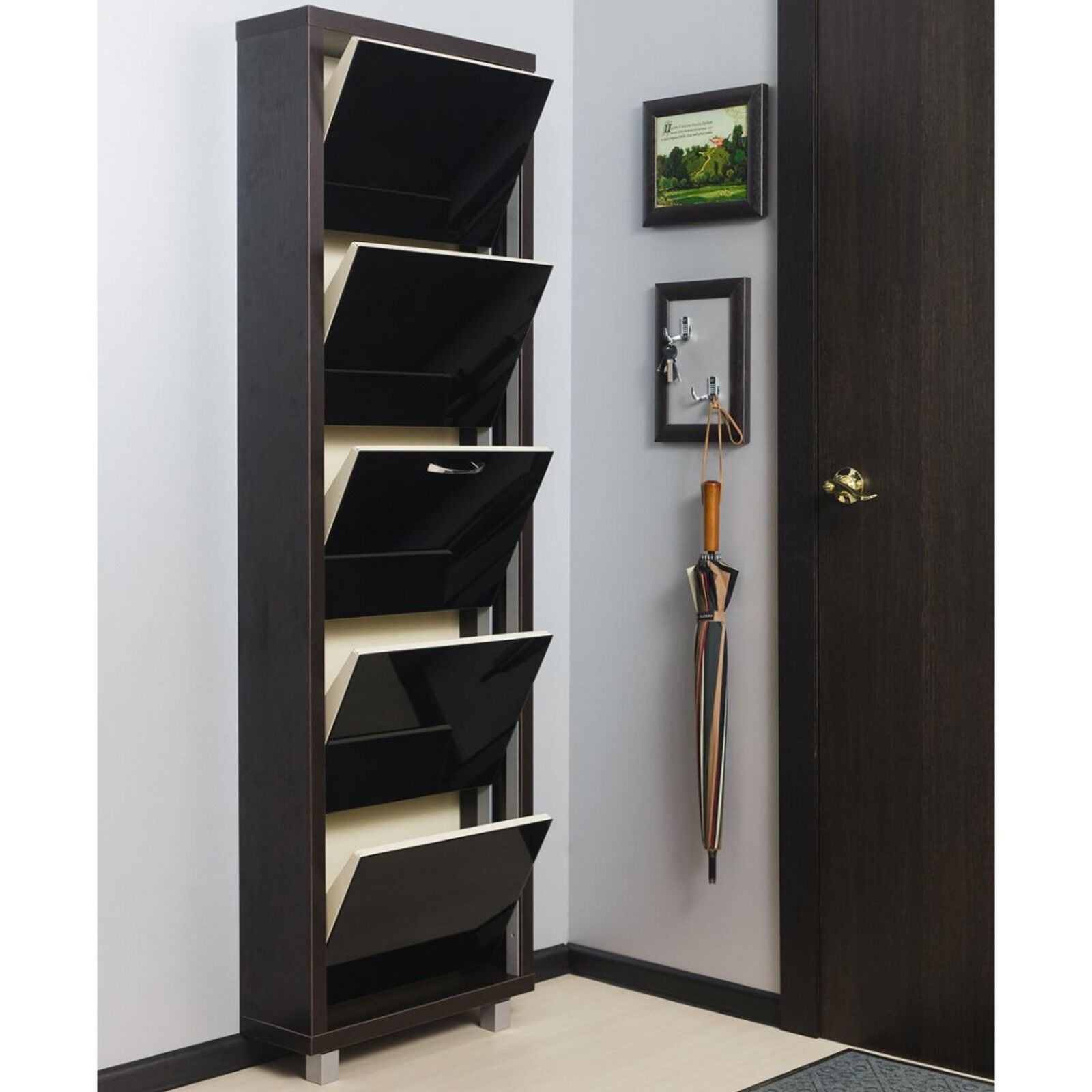 Узкий обувной шкаф «Айрон-Люкс 5 венге-стекло черное» с пятью откидными секциями вмещает целых 10 пар обуви, занимая при этом минимум места. Корпус модели выполнен из высококачественного ЛДСП цвета благородного венге и усилен металлическими ребрами жесткости. Они служат надежной основой для крепления системы полок из оцинкованного листа с защитным полимерным покрытием. Великолепное решение: фасады образуют сплошную зеркальную панель в человеческий рост, визуально расширяя пространство прихожей и добавляя ему глубины. Благодаря веерному механизму трансформации секции синхронно открываются и выдвигаются вперед, что обеспечивает удобство в использовании. Возможна фиксация к стене при помощи дюбель-саморезов через технологические отверстия в верхней части.