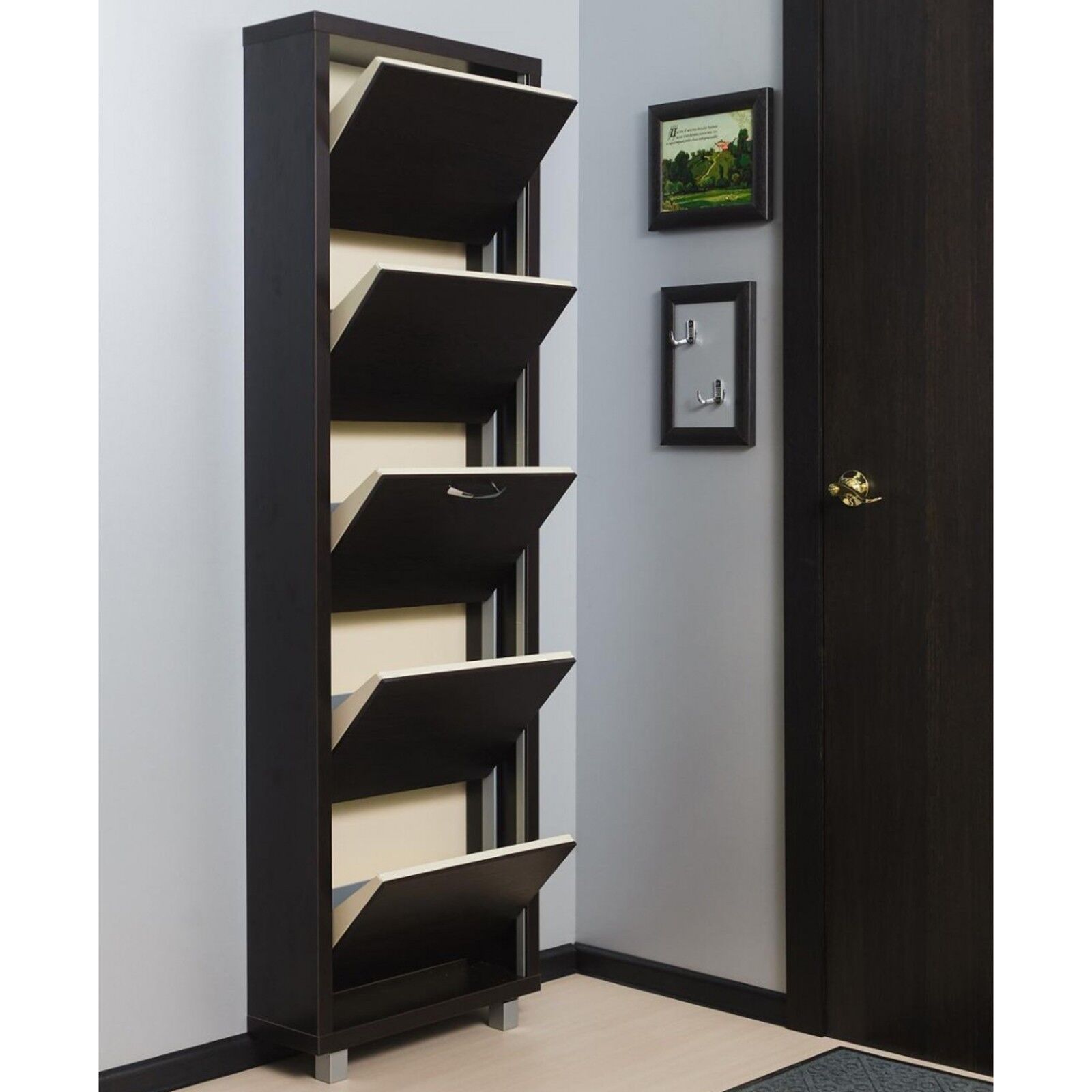 Узкий обувной шкаф «Айрон-Люкс 5 венге-венге» с пятью откидными секциями вмещает целых 10 пар обуви, занимая при этом минимум места. Корпус модели выполнен из высококачественного ЛДСП и усилен металлическими ребрами жесткости. Они служат надежной основой для крепления системы полок из оцинкованного листа с защитным полимерным покрытием. Благодаря веерному механизму трансформации секции синхронно открываются и выдвигаются вперед, что обеспечивает удобство в использовании. Возможна фиксация к стене при помощи дюбель-саморезов через технологические отверстия в верхней части.