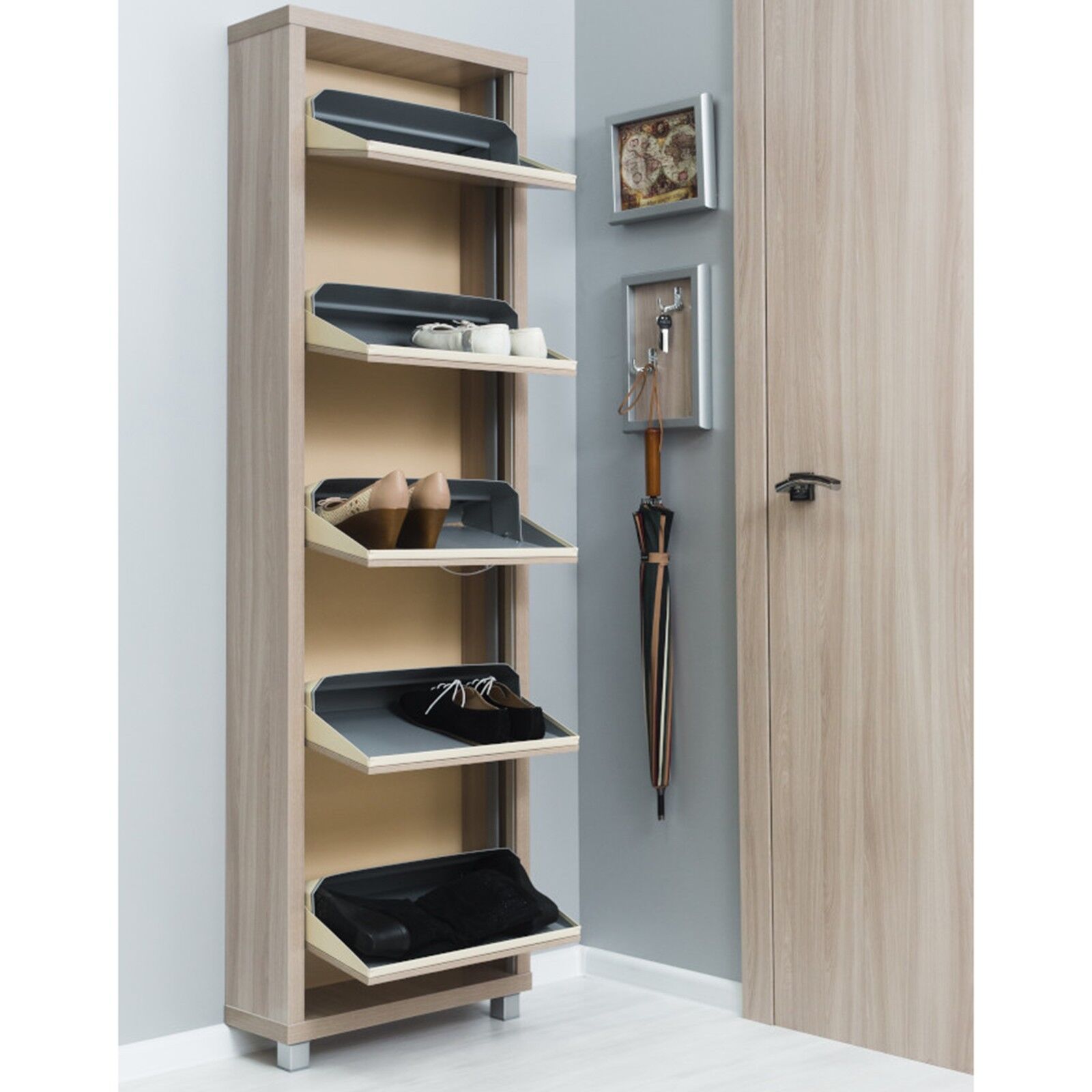 Узкий обувной шкаф «Айрон-Люкс 5 ясень шимо-ясень шимо» с пятью откидными секциями вмещает целых 10 пар обуви, занимая при этом минимум места. Корпус модели выполнен из высококачественного ЛДСП и усилен металлическими ребрами жесткости. Они служат надежной основой для крепления системы полок из оцинкованного листа с защитным полимерным покрытием. Благодаря веерному механизму трансформации секции синхронно открываются и выдвигаются вперед, что обеспечивает удобство в использовании. Возможна фиксация к стене при помощи дюбель-саморезов через технологические отверстия в верхней части.
