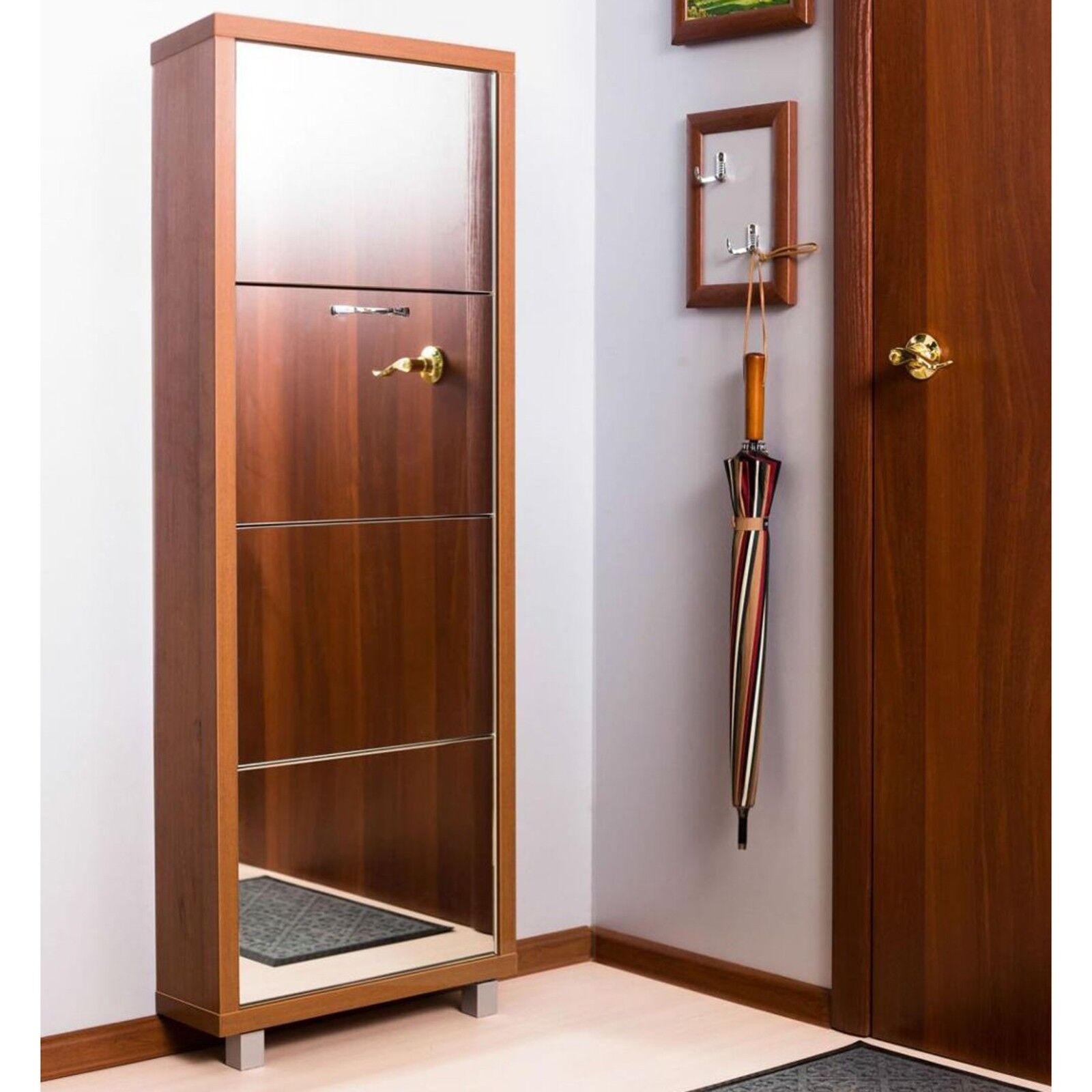 Обувной шкаф «Айрон Люкс 4 дуб орех-зеркало» представляет собой весьма вместительную и многофункциональную мебель. Она сочетает все необходимые функции, которые позволяют удобно и аккуратно хранить и размещать около 8 пар обуви одновременно. Для надежности можно закрепить обувницу к стене через специальные технологические отверстия. Система лотков: оцинкованный лист с полимерным покрытием.