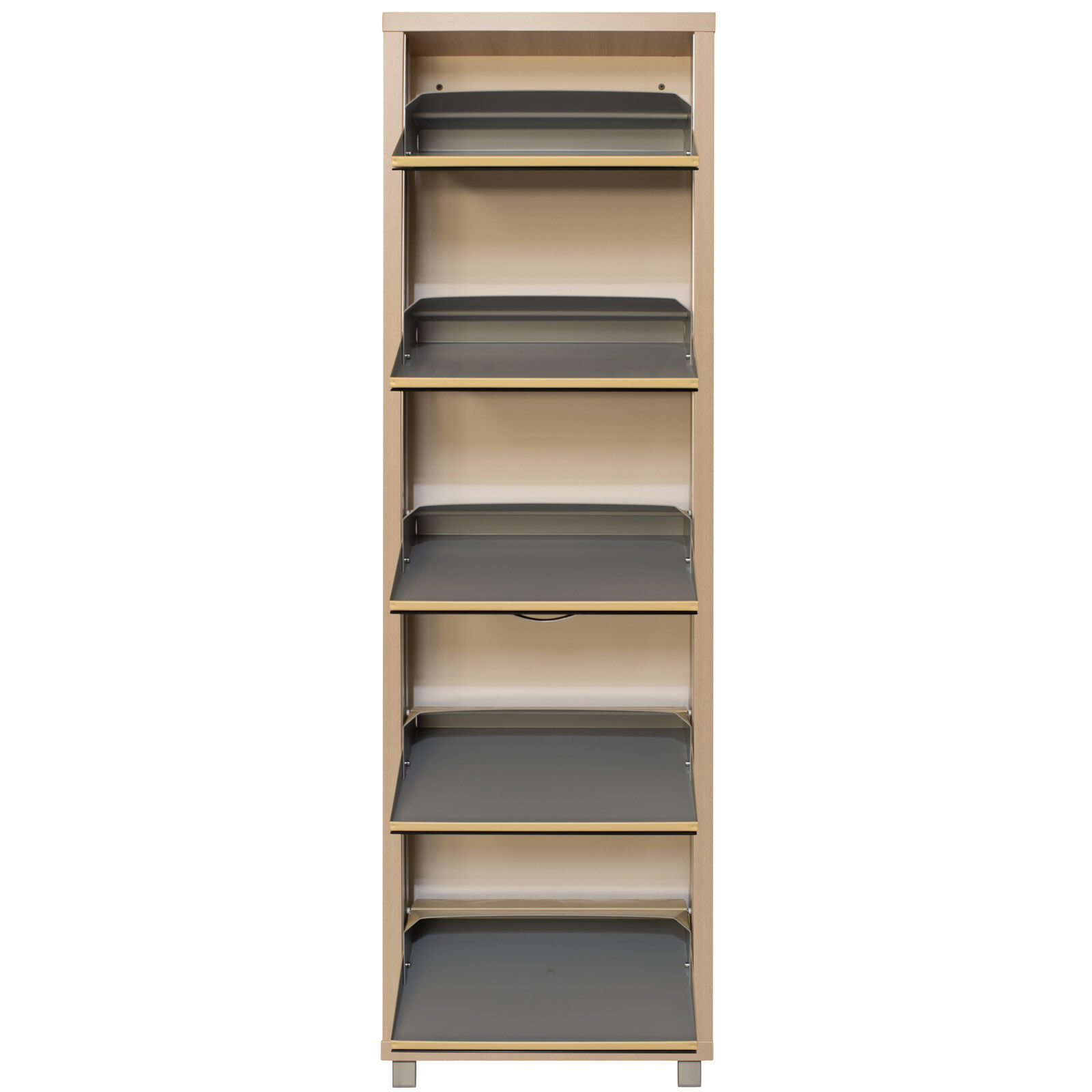 Узкий обувной шкаф «Айрон-Люкс 5 ясень шимо-стекло черное» с пятью откидными секциями вмещает целых 10 пар обуви, занимая при этом минимум места. Корпус модели выполнен из высококачественного ЛДСП и усилен металлическими ребрами жесткости. Они служат надежной основой для крепления системы полок из оцинкованного листа с защитным полимерным покрытием. Благодаря веерному механизму трансформации секции синхронно открываются и выдвигаются вперед, что обеспечивает удобство в использовании. Возможна фиксация к стене при помощи дюбель-саморезов через технологические отверстия в верхней части.