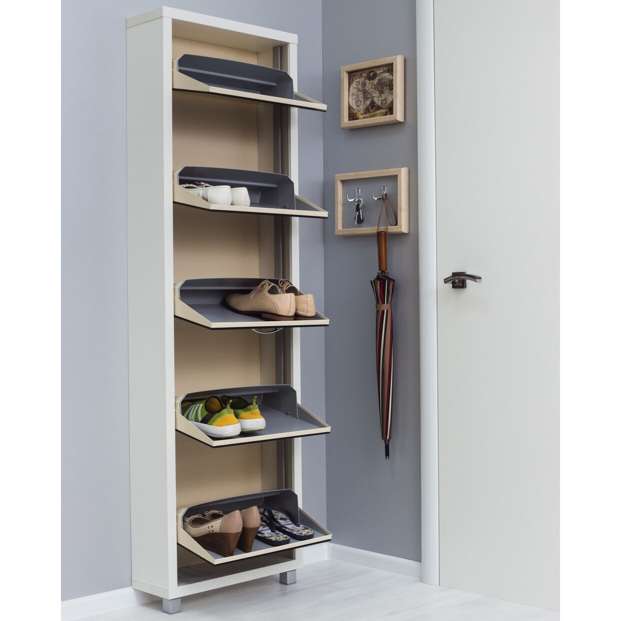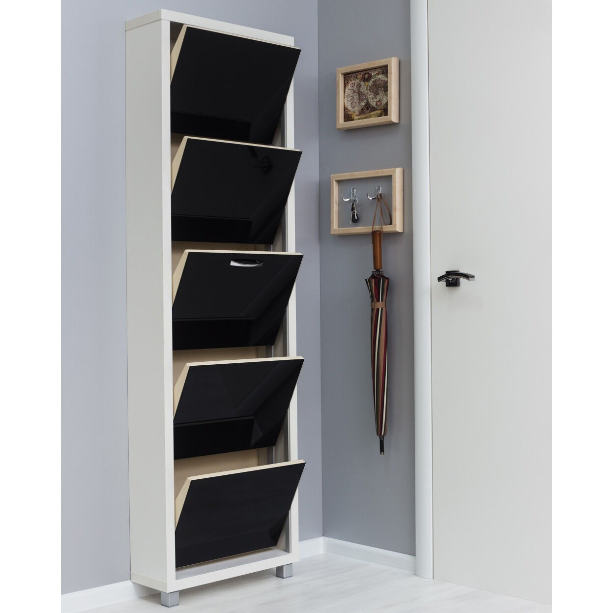 Узкий обувной шкаф «Айрон-Люкс 5 белый шагрень-стекло черное» с пятью откидными секциями вмещает целых 10 пар обуви, занимая при этом минимум места. Корпус модели выполнен из высококачественного ЛДСП цвета благородного венге и усилен металлическими ребрами жесткости. Они служат надежной основой для крепления системы полок из оцинкованного листа с защитным полимерным покрытием. Великолепное решение: фасады образуют сплошную зеркальную панель в человеческий рост, визуально расширяя пространство прихожей и добавляя ему глубины. Благодаря веерному механизму трансформации секции синхронно открываются и выдвигаются вперед, что обеспечивает удобство в использовании. Возможна фиксация к стене при помощи дюбель-саморезов через технологические отверстия в верхней части.