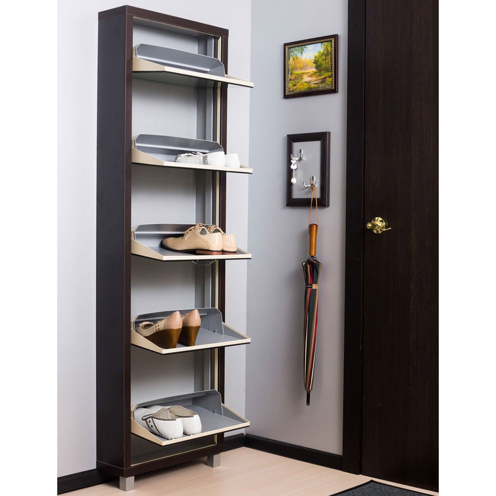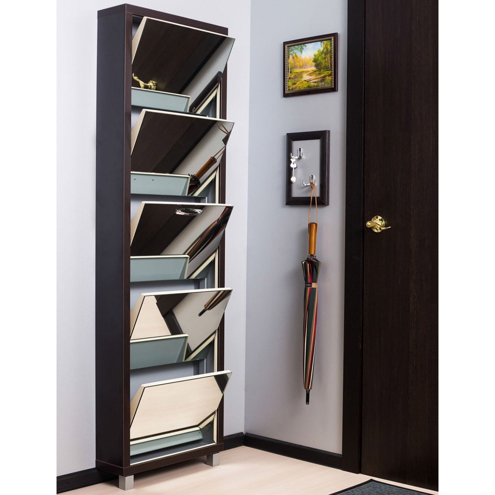 Узкий обувной шкаф «Айрон-Люкс 5 венге-зеркало» с пятью откидными секциями вмещает целых 10 пар обуви, занимая при этом минимум места. Корпус модели выполнен из высококачественного ЛДСП цвета благородного венге и усилен металлическими ребрами жесткости. Они служат надежной основой для крепления системы полок из оцинкованного листа с защитным полимерным покрытием. Великолепное решение: фасады образуют сплошную зеркальную панель в человеческий рост, визуально расширяя пространство прихожей и добавляя ему глубины. Благодаря веерному механизму трансформации секции синхронно открываются и выдвигаются вперед, что обеспечивает удобство в использовании. Возможна фиксация к стене при помощи дюбель-саморезов через технологические отверстия в верхней части.