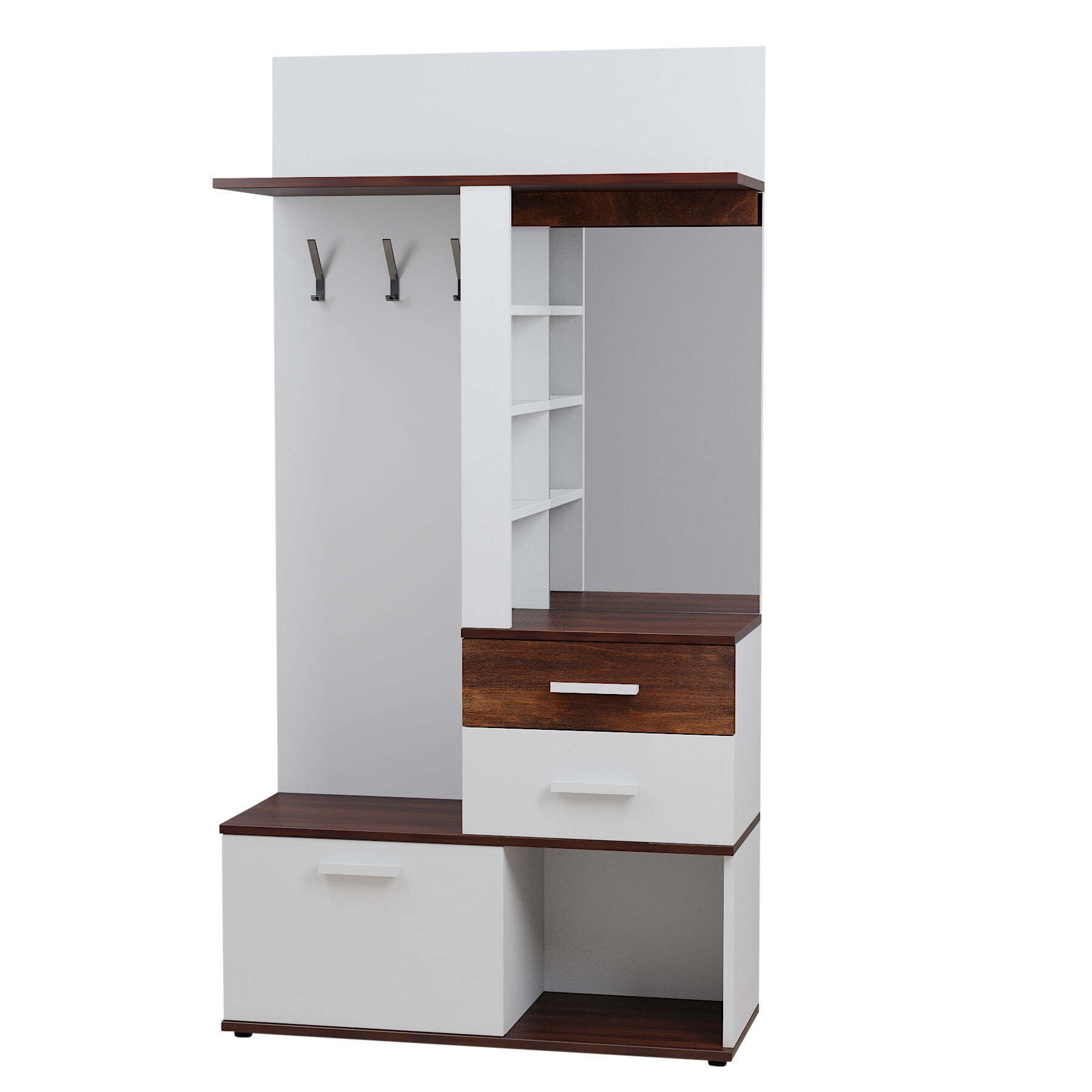 Шкаф МЦН прихожая Норвурд 70 Белый Орех шоколадный находка для маленькой прихожей. В небольшом по габаритам модуле (шириной 1120 мм и глубиной 400 мм) сочетается всё необходимое: крючки, стационарная штанга, открытые полки, выдвижные ящики, отделение за откидным фасадом, открытая ниша, зеркало с подсветкой. Встроенная светодиодная подсветка включается при помощи аккуратного кнопочного выключателя. Горизонтальные детали толщиной 22 мм в декоре Орех Шоколадный и фасад верхнего ящика из дерева с брашировкой контрастируют с белым декором модуля. Регулируемые опоры помогут компенсировать неровный пол в прихожей. «Мебель поставляется в разобранном виде».