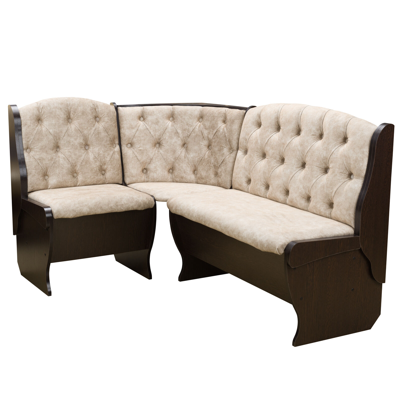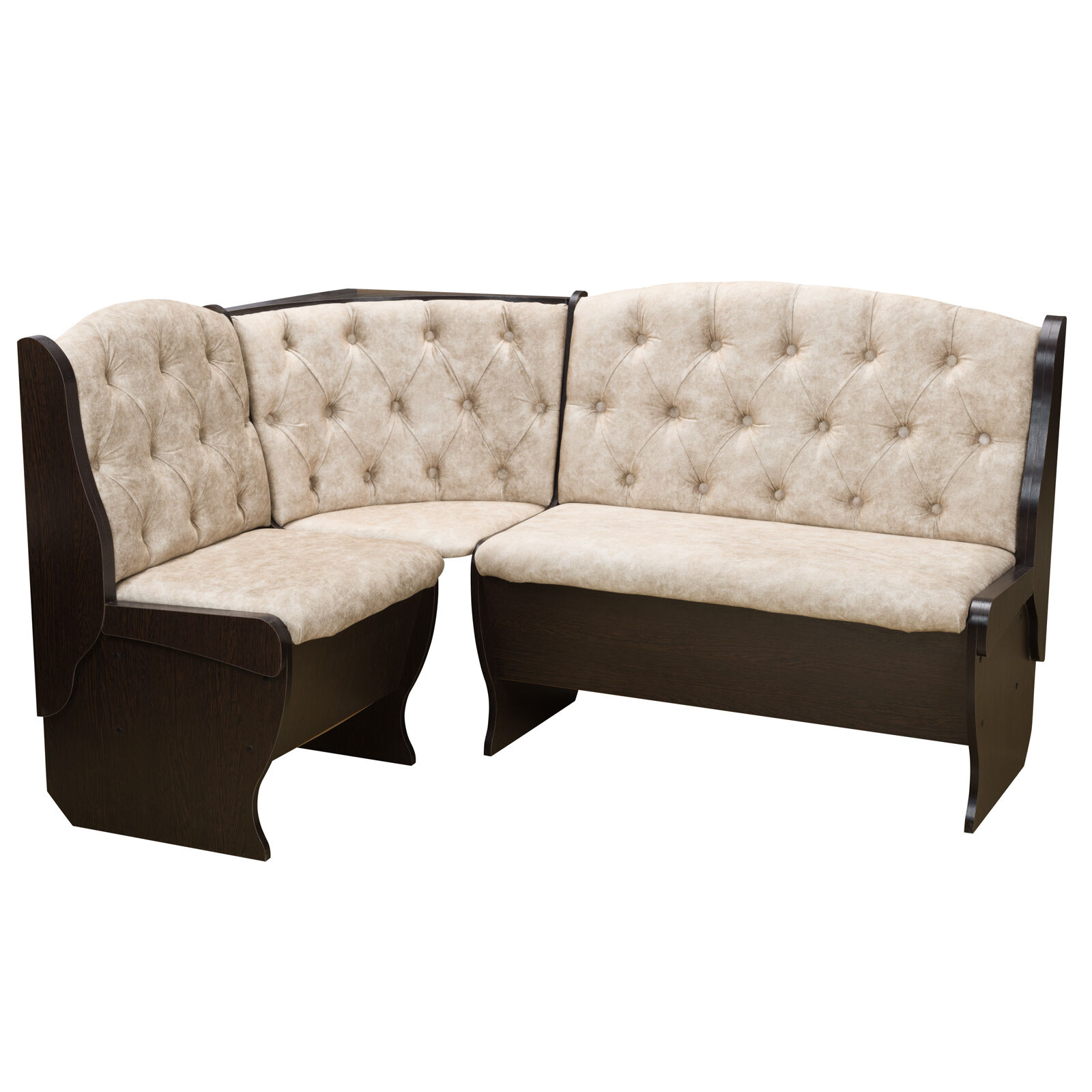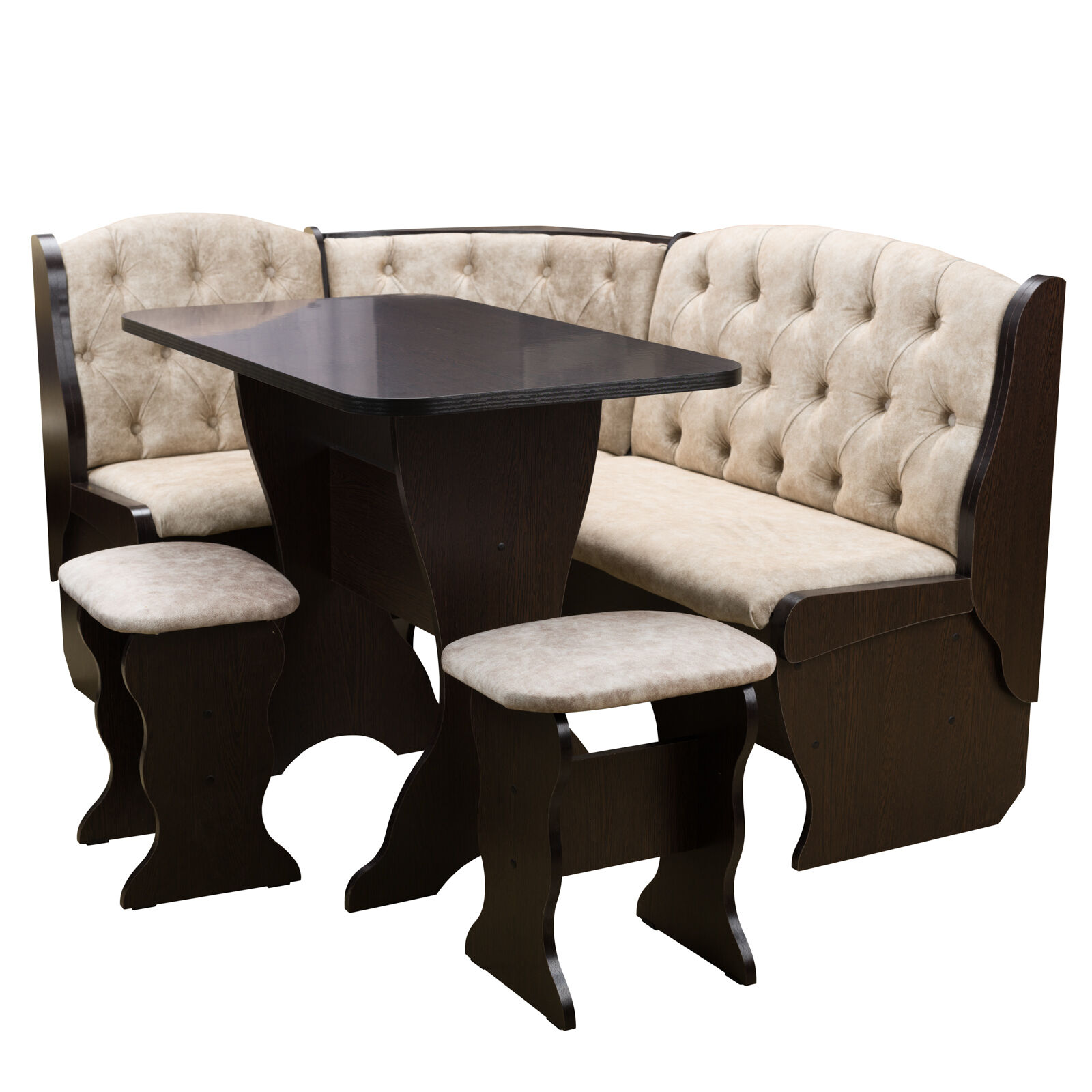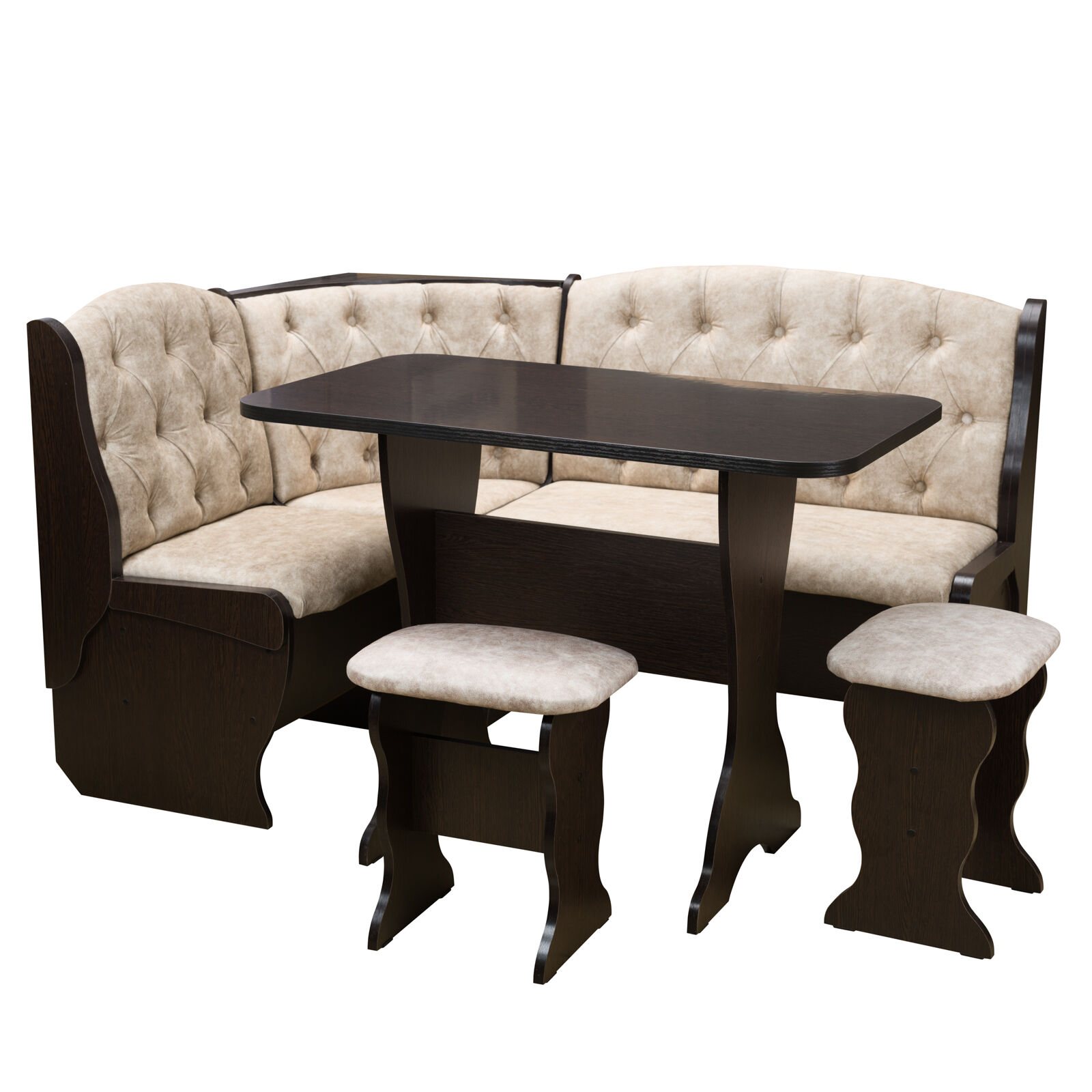 Стильный и современный кухонный уголок «Орхидея Люкс Венге велюр латте » состоит из углового дивана с двумя ящиками, обеденного стола и двух кухонных табуретов. Диван легко вмещает три или четыре человека, а дополнительными местами у обеденного стола станут удобные табуреты с мягкой обивкой. Для надежности и практичности использования столешница покрыта термостойким пластиком. Функциональный набор станет отличным выбором для обустройства кухни. Угловой диван можно собрать как на правую, так и на левую сторону. «Мебель поставляется в разобранном виде».