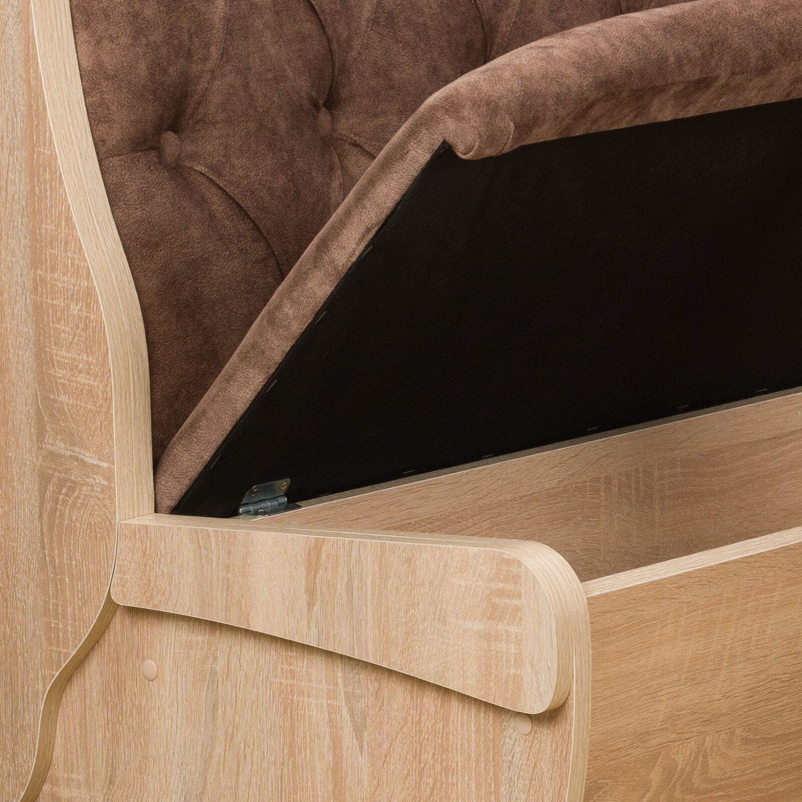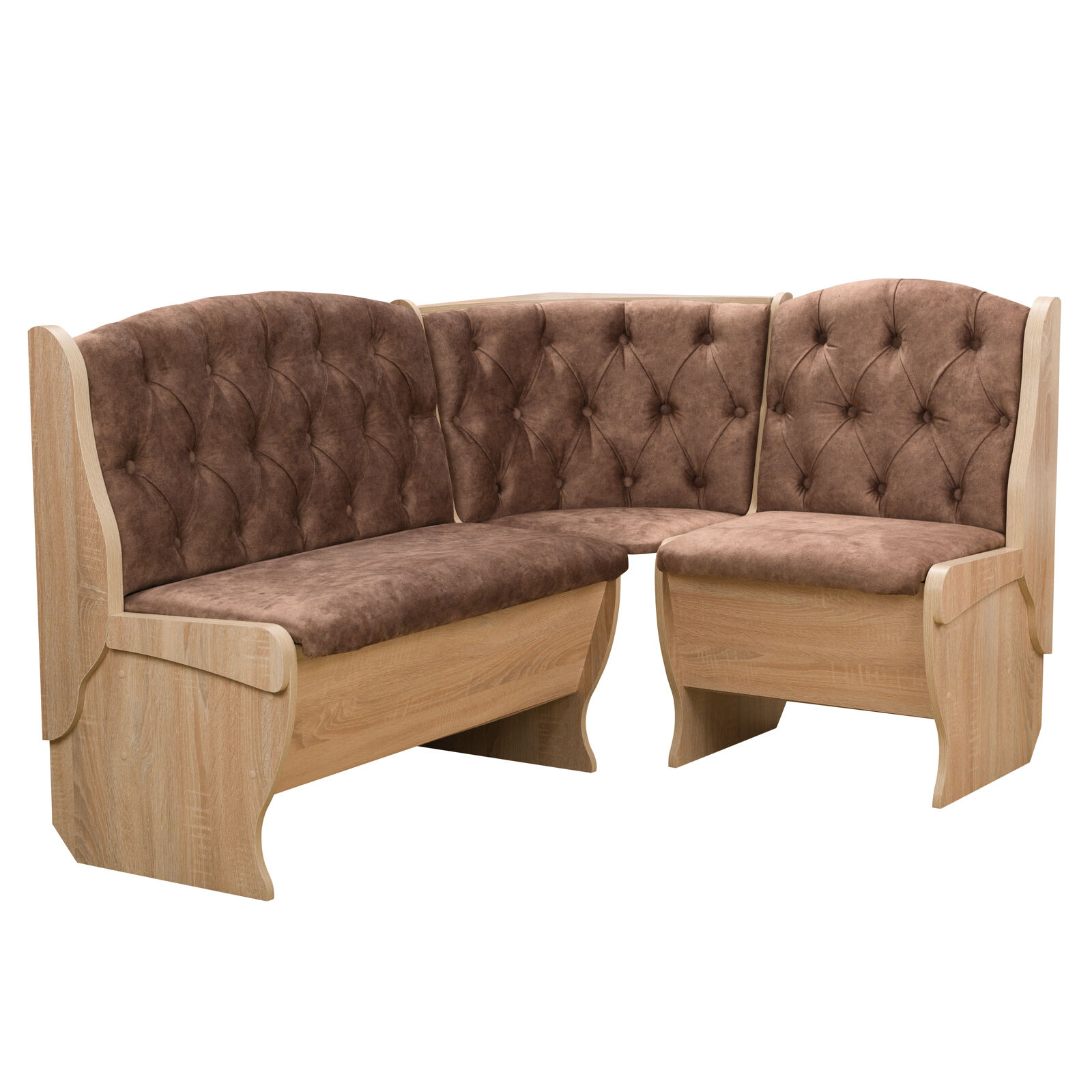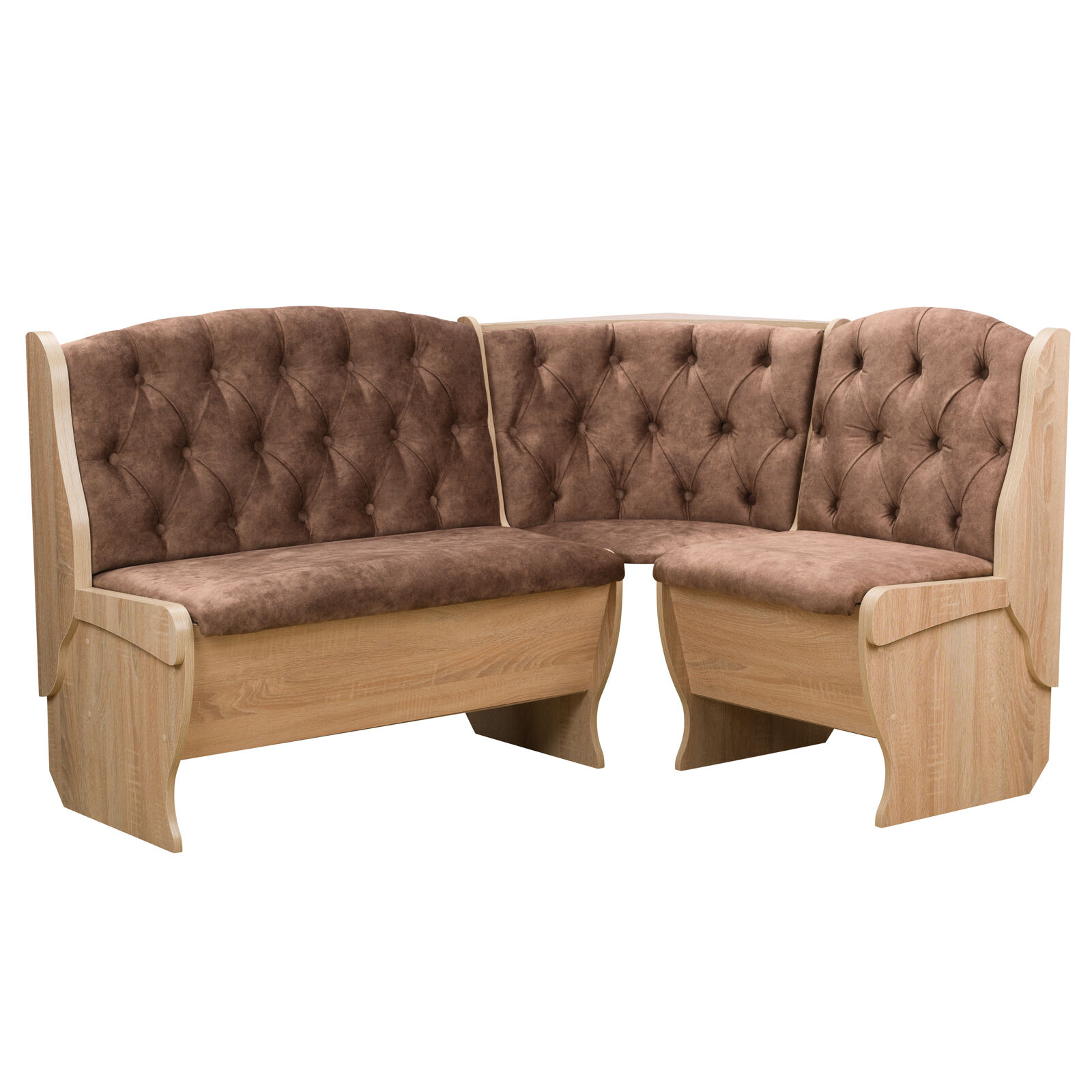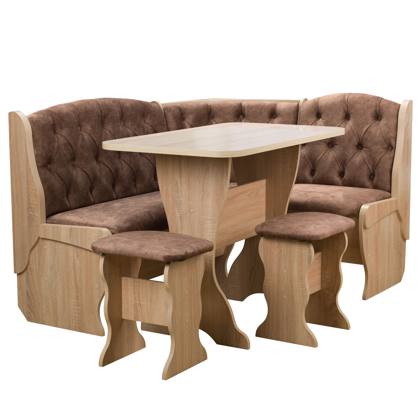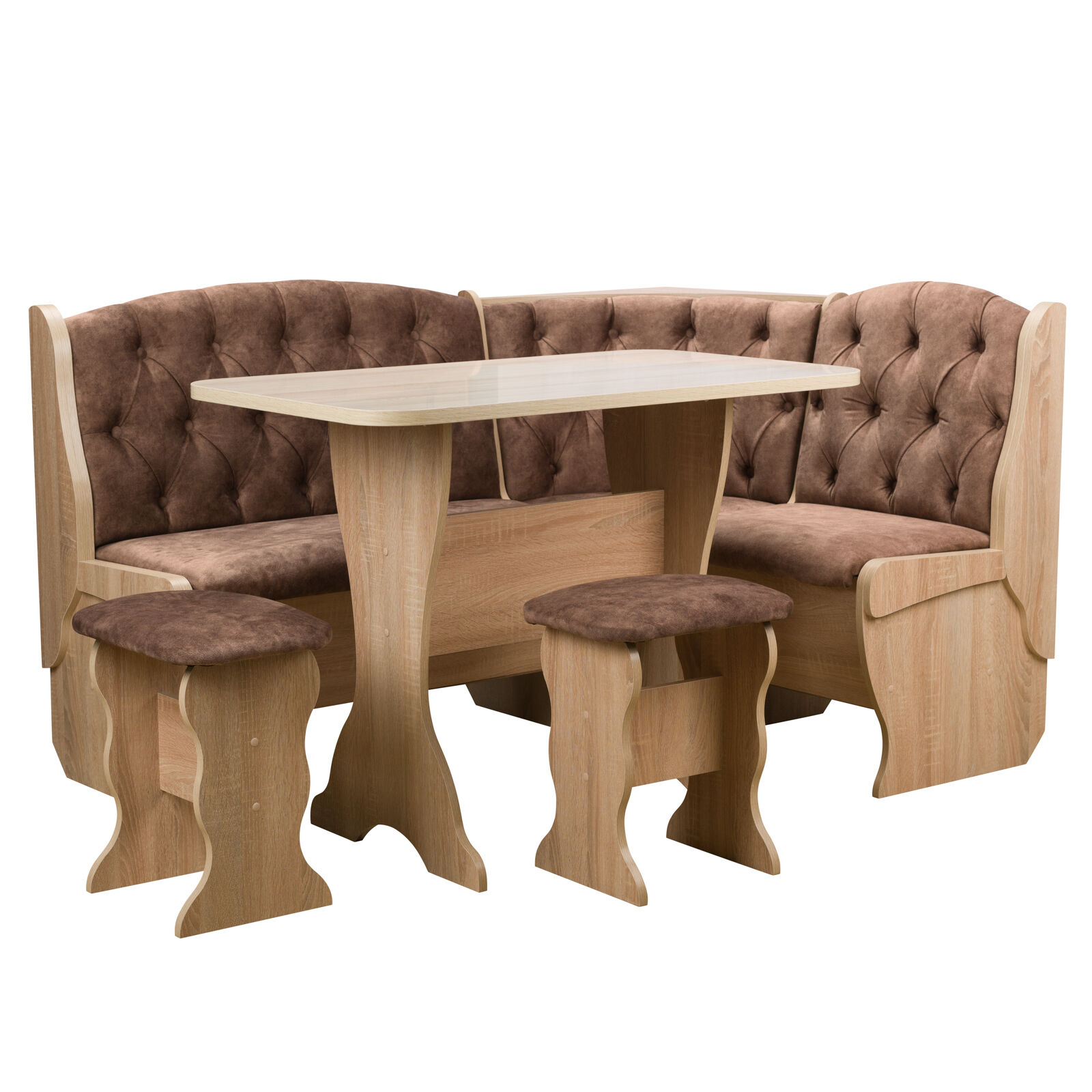 Стильный и современный кухонный уголок «Орхидея Дуб сонома - велюр коньяк» состоит из углового дивана с двумя ящиками, обеденного стола и двух кухонных табуретов. Диван легко вмещает три или четыре человека, а дополнительными местами у обеденного стола станут удобные табуреты с мягкой обивкой. Для надежности и практичности использования столешница покрыта термостойким пластиком. Функциональный набор станет отличным выбором для обустройства кухни. Угловой диван можно собрать как на правую, так и на левую сторону. «Мебель поставляется в разобранном виде».