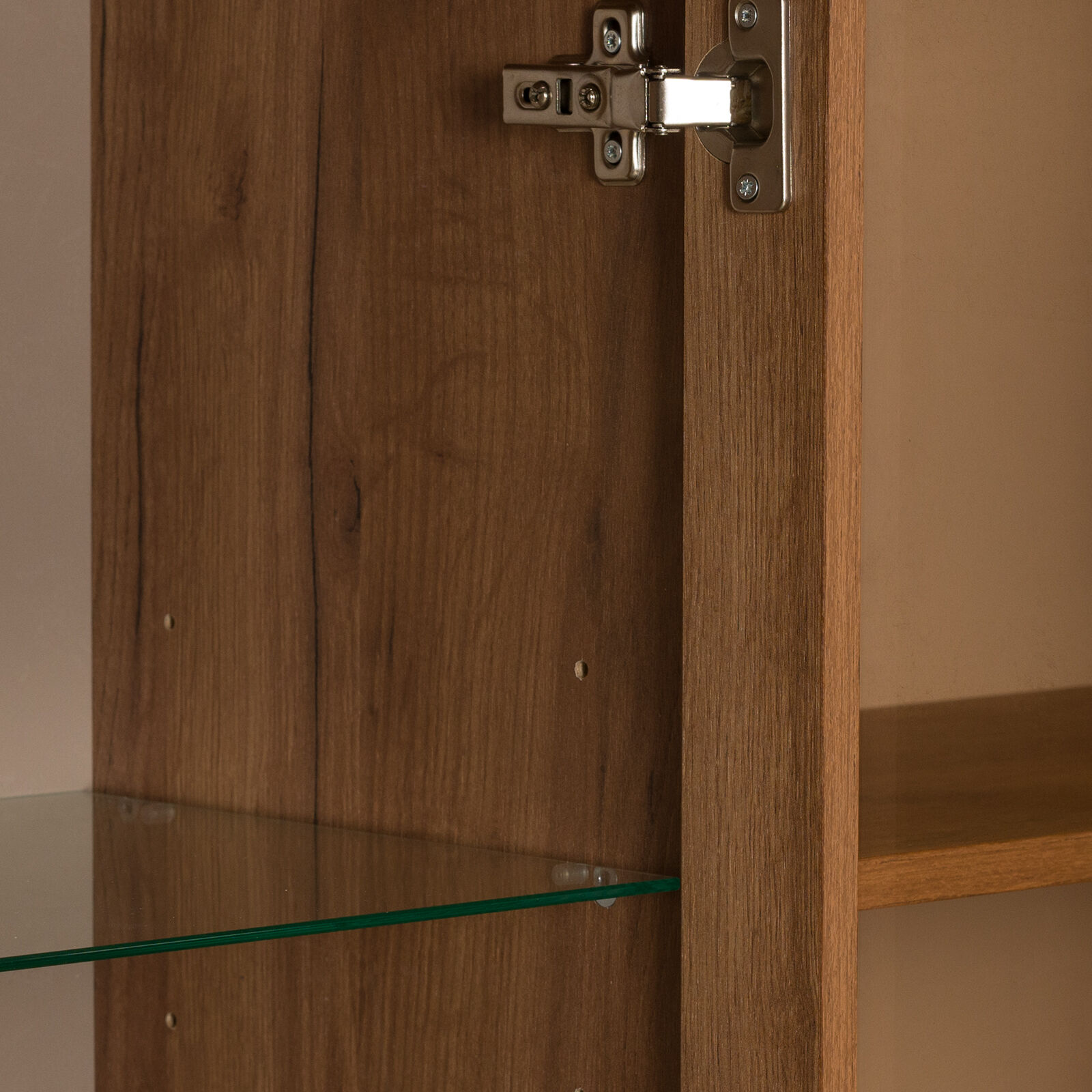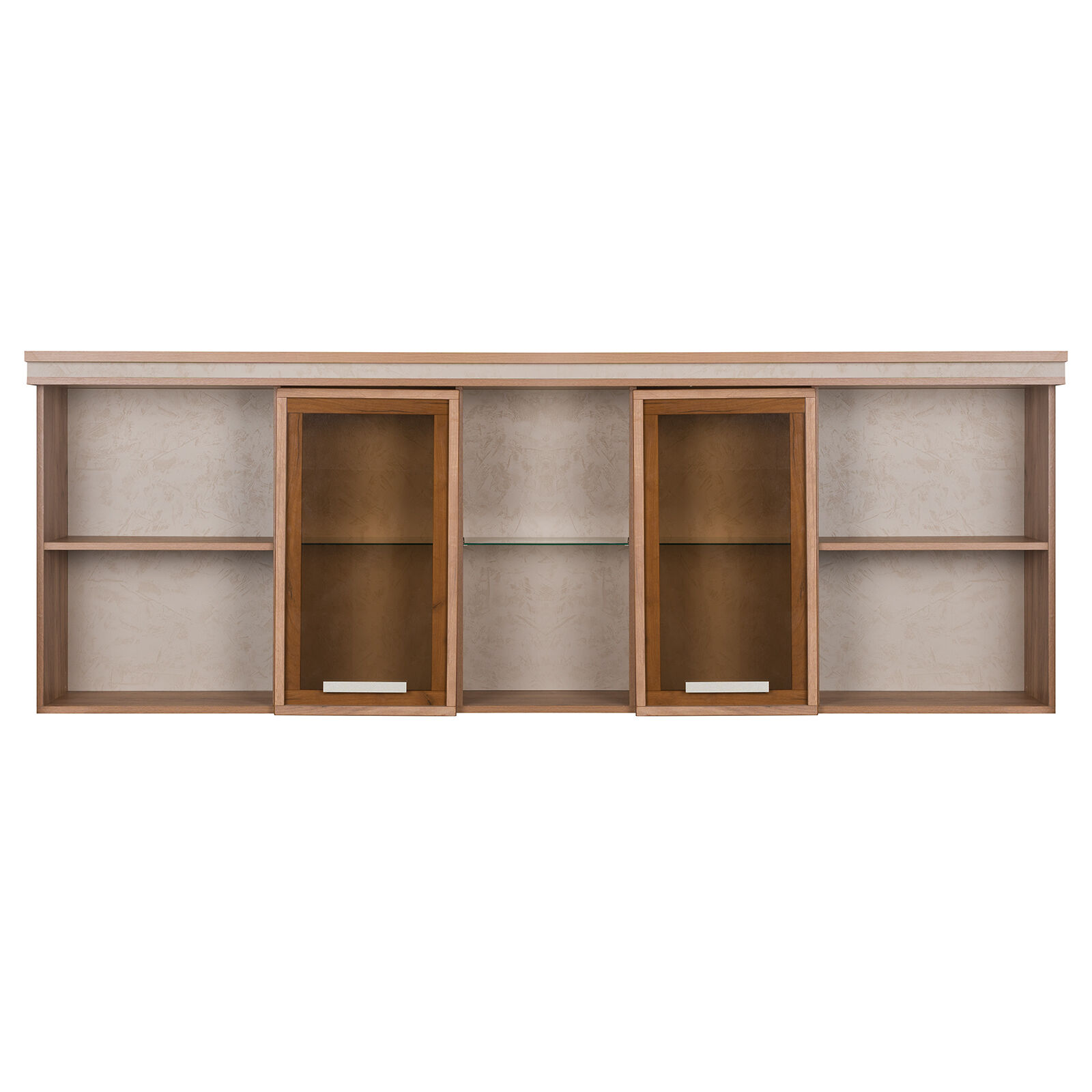 габаритный навесной шкаф с тремя центральными отделениями со стеклополками за Шкаф навесной «Nature 81 Дуб табачный Craft Мокко» распашными дверцами из тонированного стекла и двумя открытыми боковыми отделениями с полками. Стеклянные полки выдерживают до 2 кг каждая. Шкаф выдерживает полную нагрузку до 40 кг. Шкаф декорирован составным карнизом в стилистике всей молодежной коллекции Nature. Крепление к стене за подвесы. «Мебель поставляется в разобранном виде».